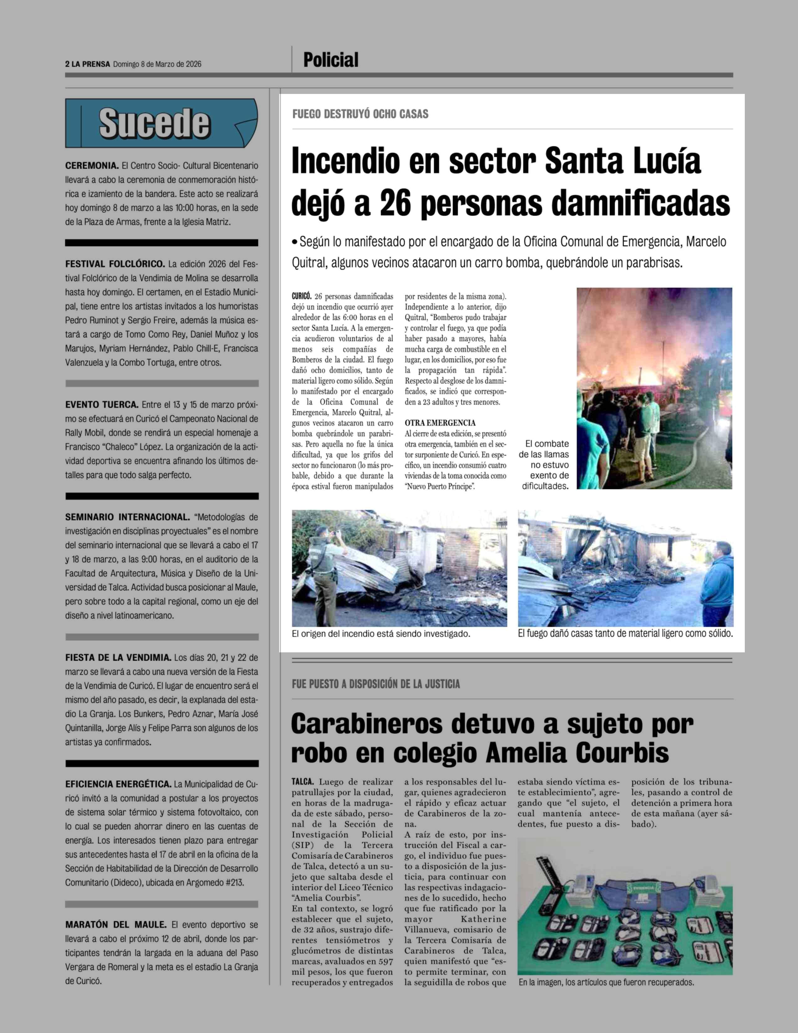Incendio en sector Santa Lucía dejó a 26 personas damnificadas 08-03-2026 La Prensa de Curicó |