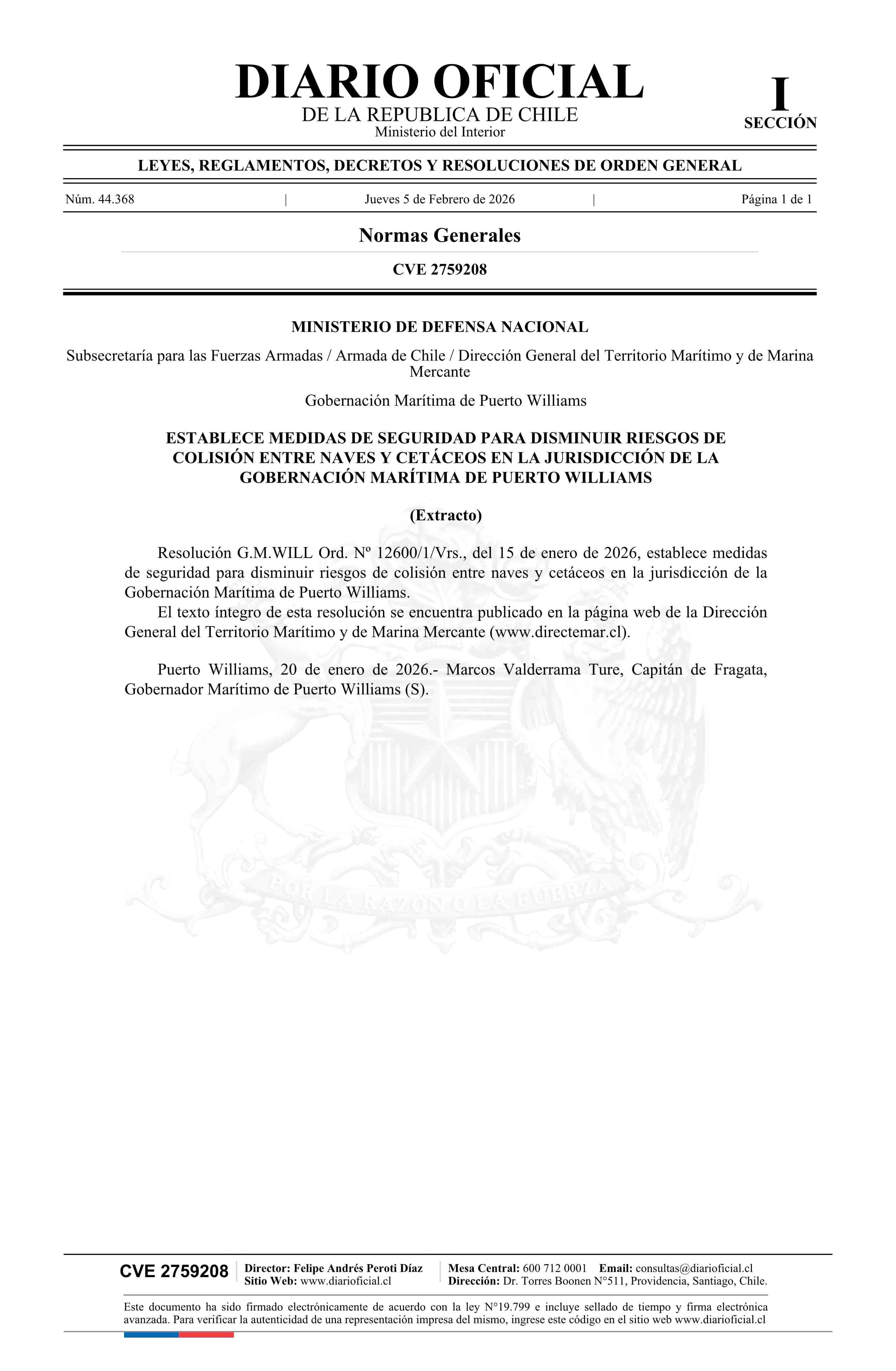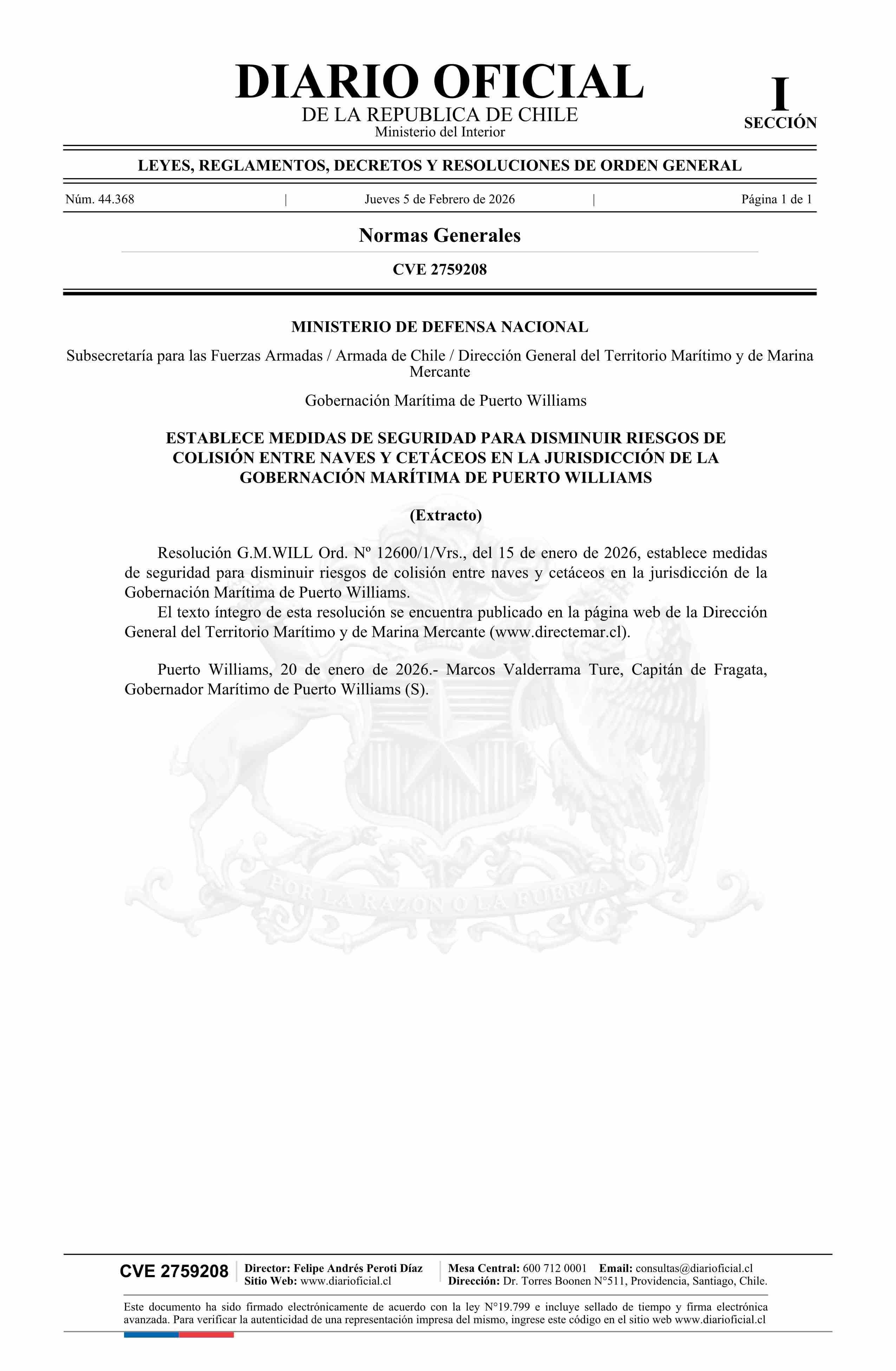 Título: Extracto de resolución número 12600/1/Vrs., de 2026.- Establece medidas de seguridad para disminuir riesgos de colisión entre naves y cetáceos en la jurisdicción de la Gobernación Marítima de Puerto Williams