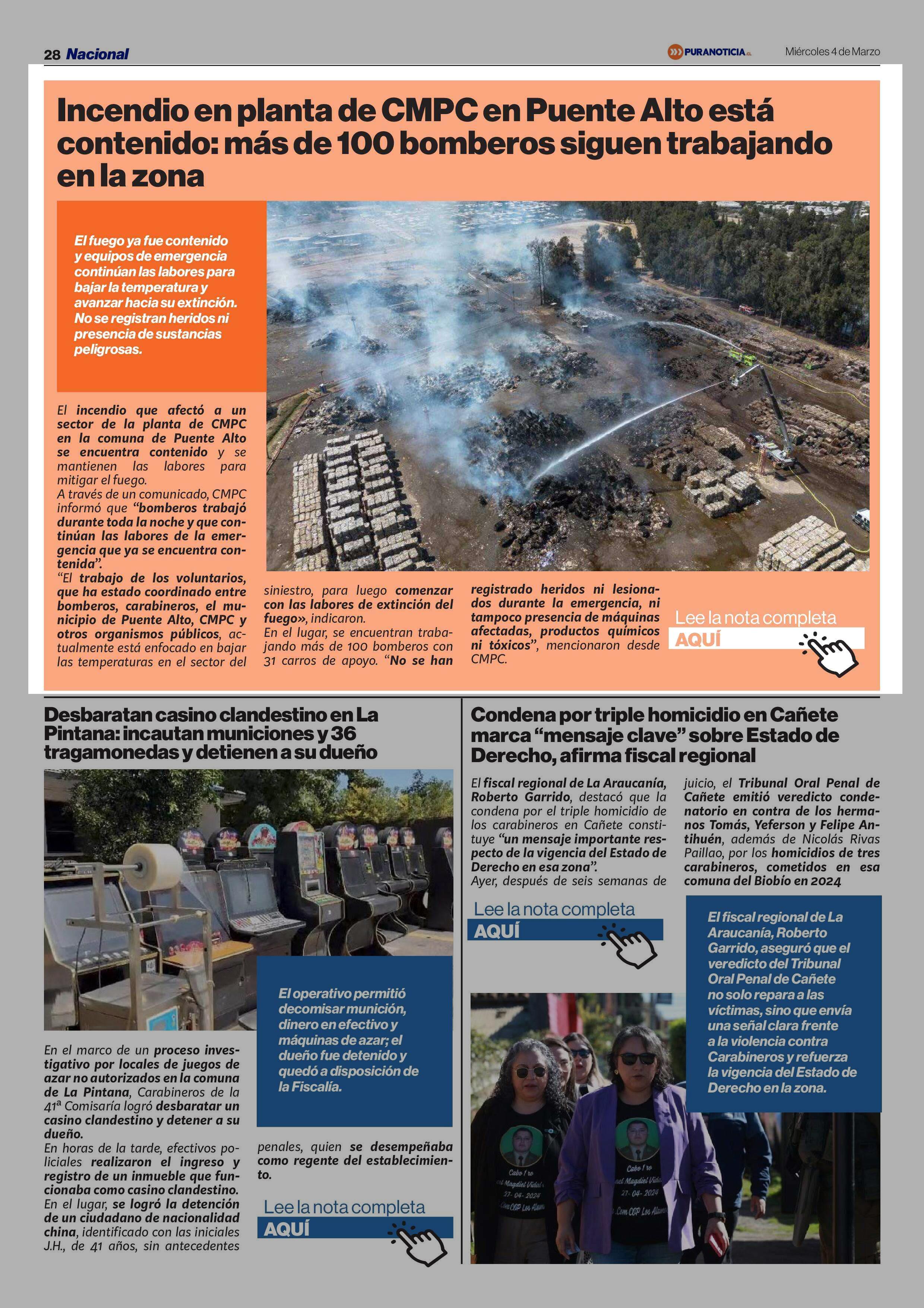 Incendio en planta de CMPC en Puente Alto está contenido: más de 100 bomberos siguen trabajando en la zona 04-03-2026 Puranoticia.cl |