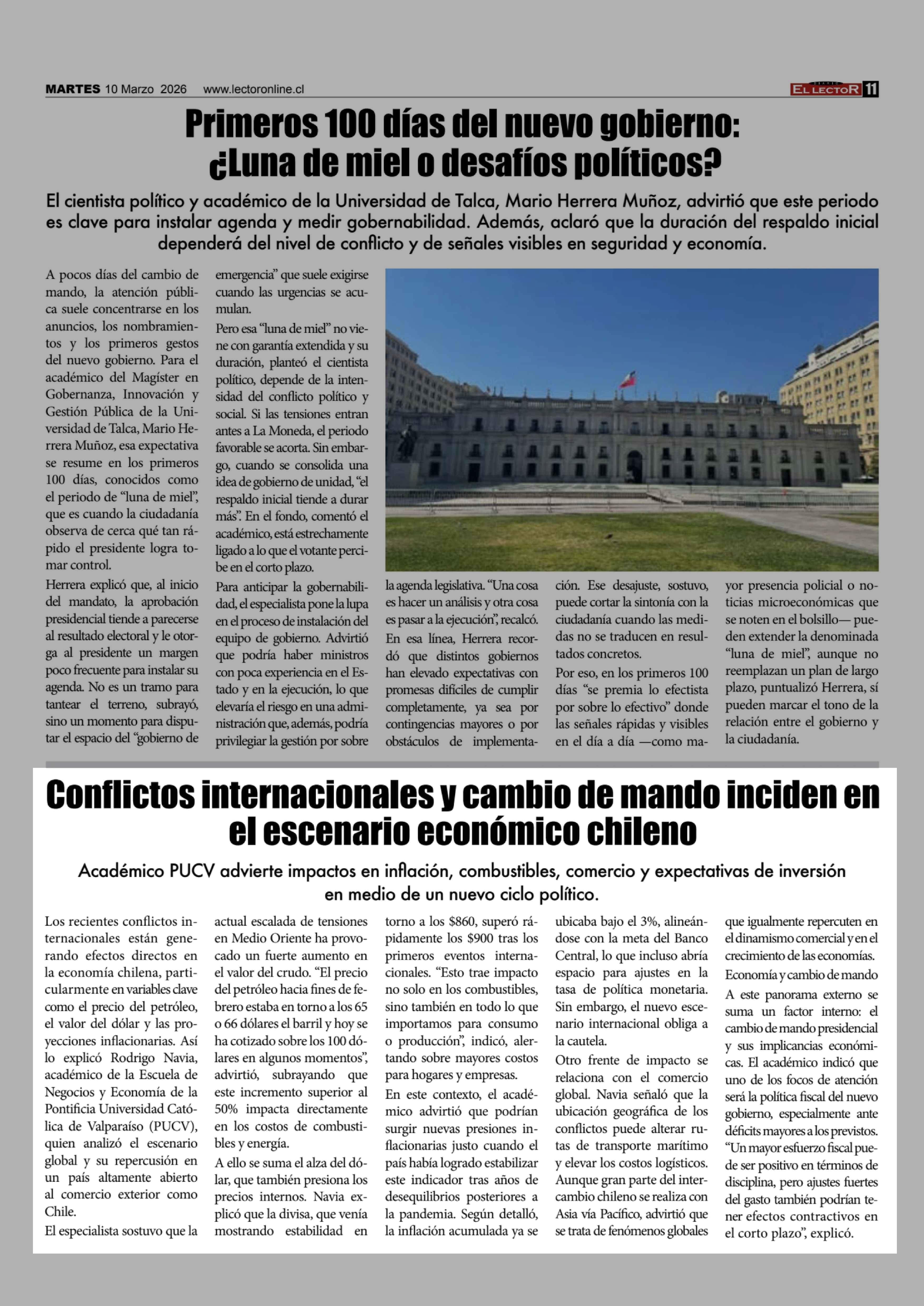 Conflictos internacionales y cambio de mando inciden en el escenario económico chileno 10-03-2026 El Lector |