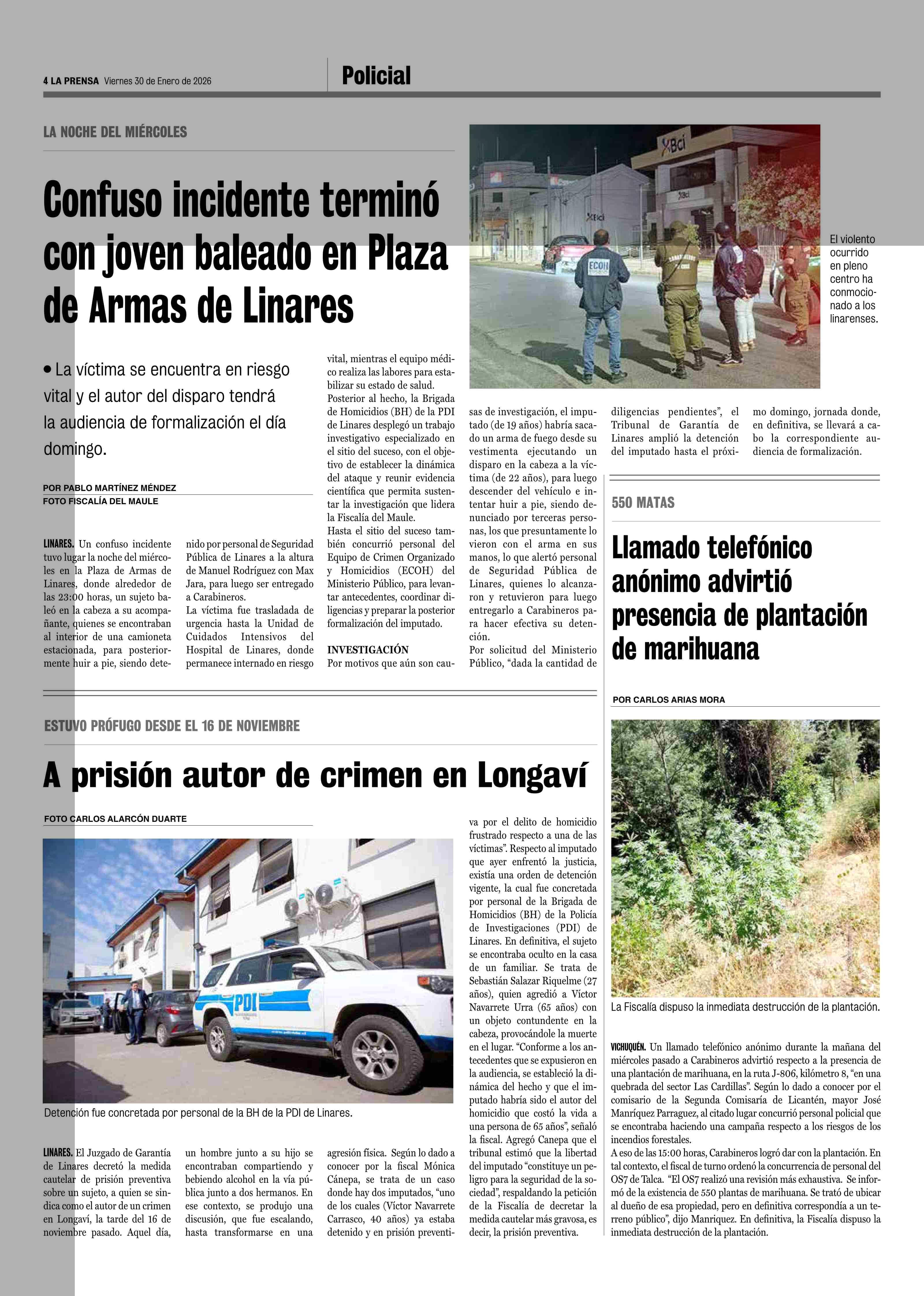 Confuso incidente terminó con joven baleado en Plaza de Armas de Linares 30-01-2026 La Prensa de Curicó |