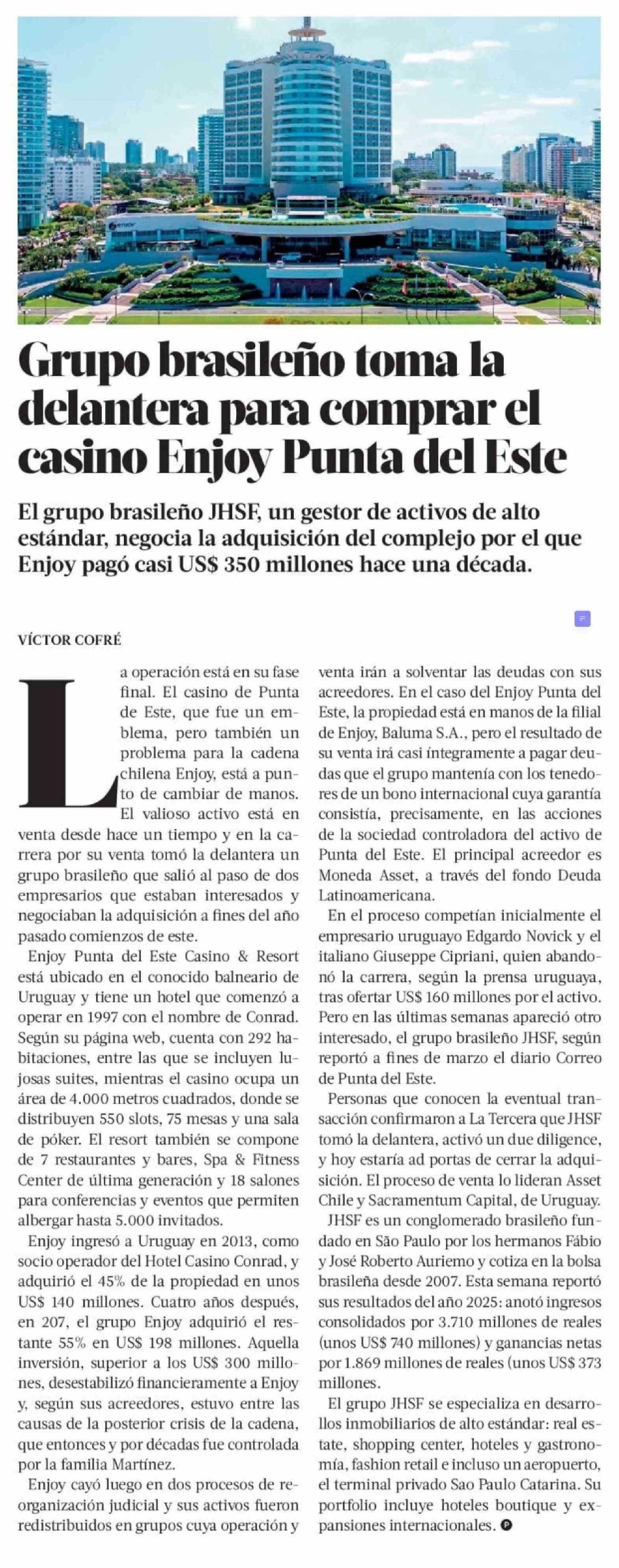 Grupo brasileño toma la delantera para comprar el casino Enjoy Punta del Este 12-04-2026 La Tercera |