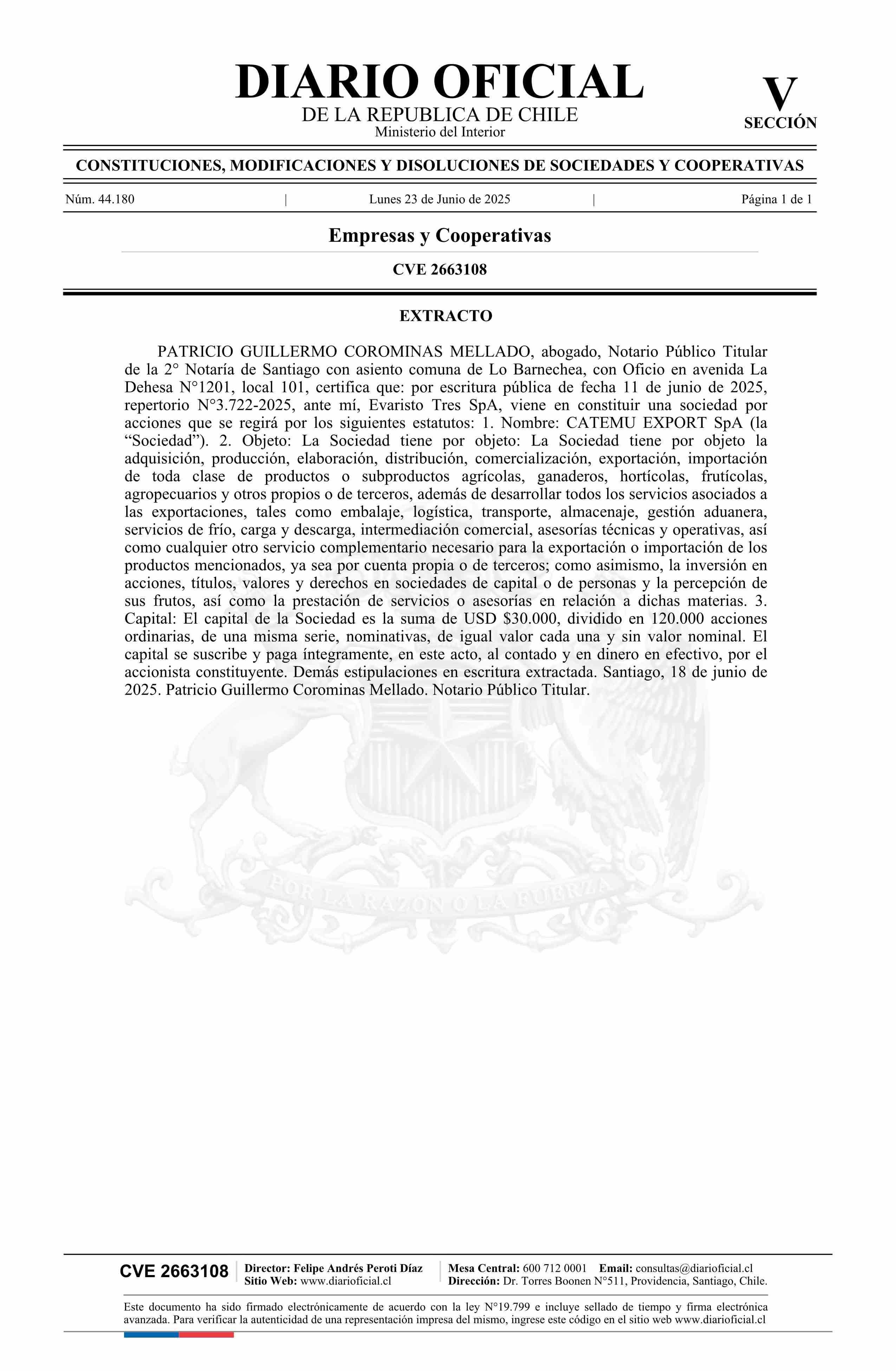 CATEMU EXPORT SpA 23-06-2025 Diario Oficial Edición Electrónica |
