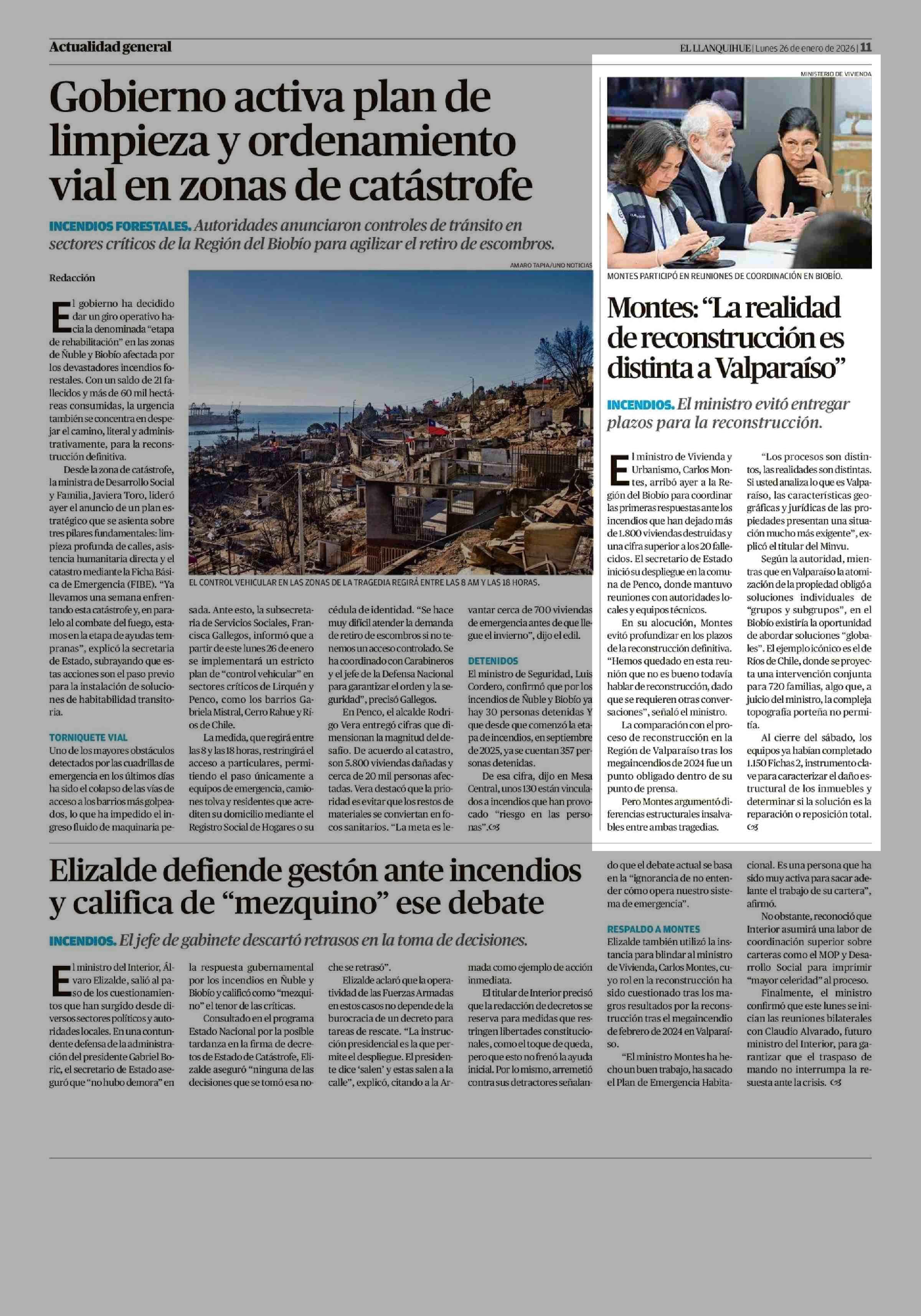 Montes: "La realidad de reconstrucción es distinta a Valparaíso" 26-01-2026 El Llanquihue |