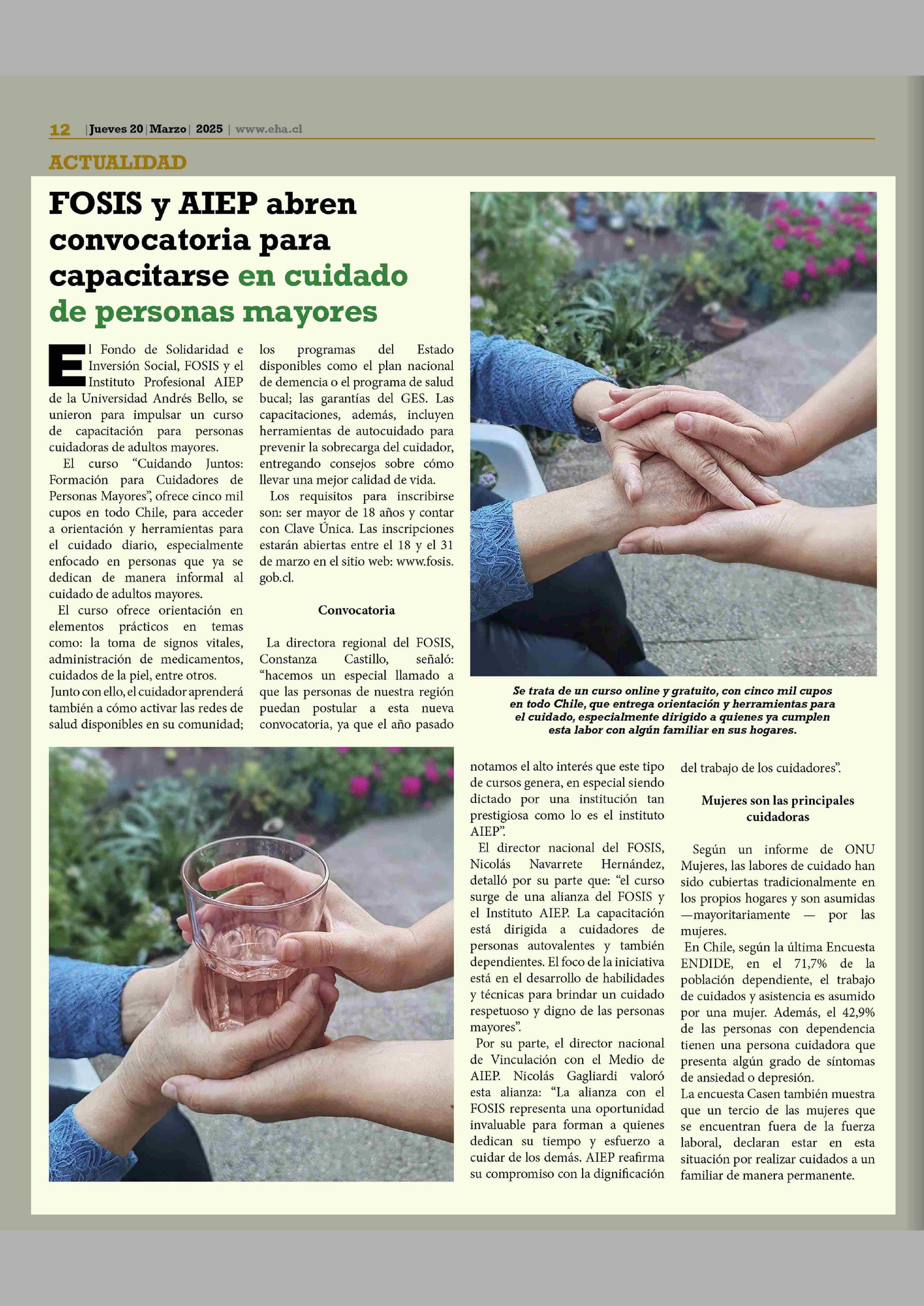 FOSIS y AIEP abren convocatoria para capacitarse en cuidado de personas mayores 20-03-2025 El Heraldo Austral |