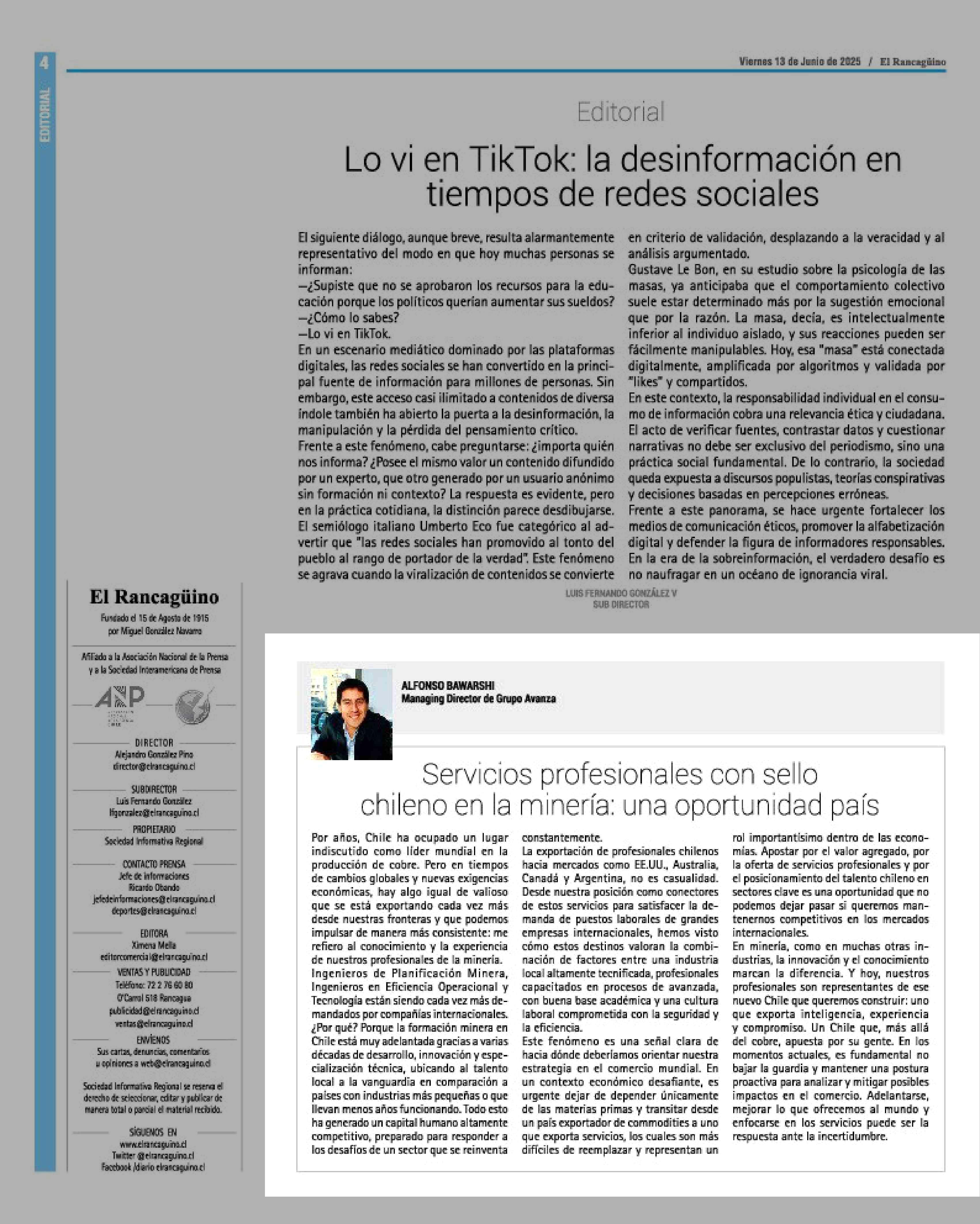 Servicios profesionales con sello chileno en la minería: una oportunidad país 13-06-2025 El Rancagüino |