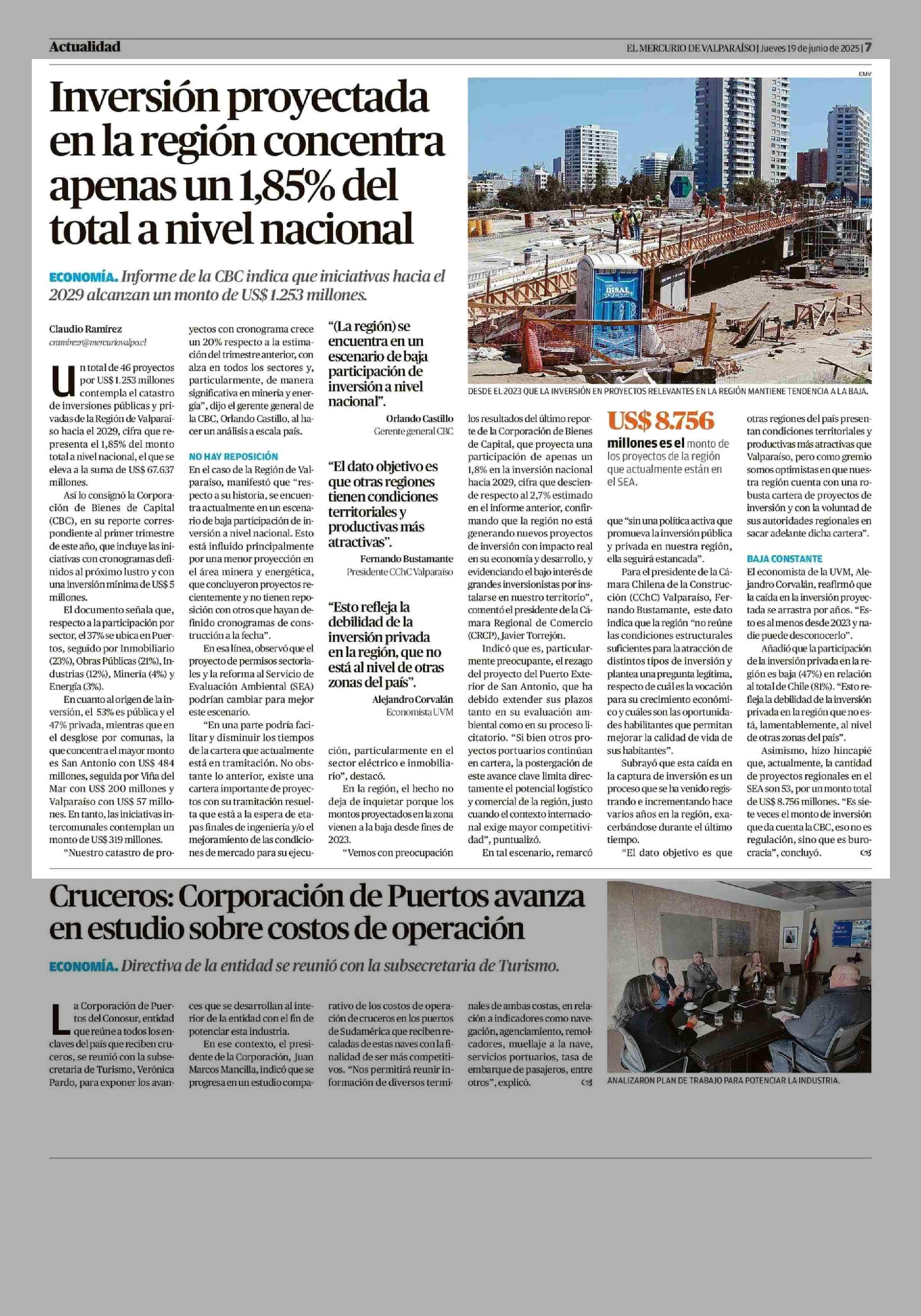 Inversión proyectada apenas un 1,85% del en la región concentra total a nivel nacional 19-06-2025 El Mercurio de Valparaíso |