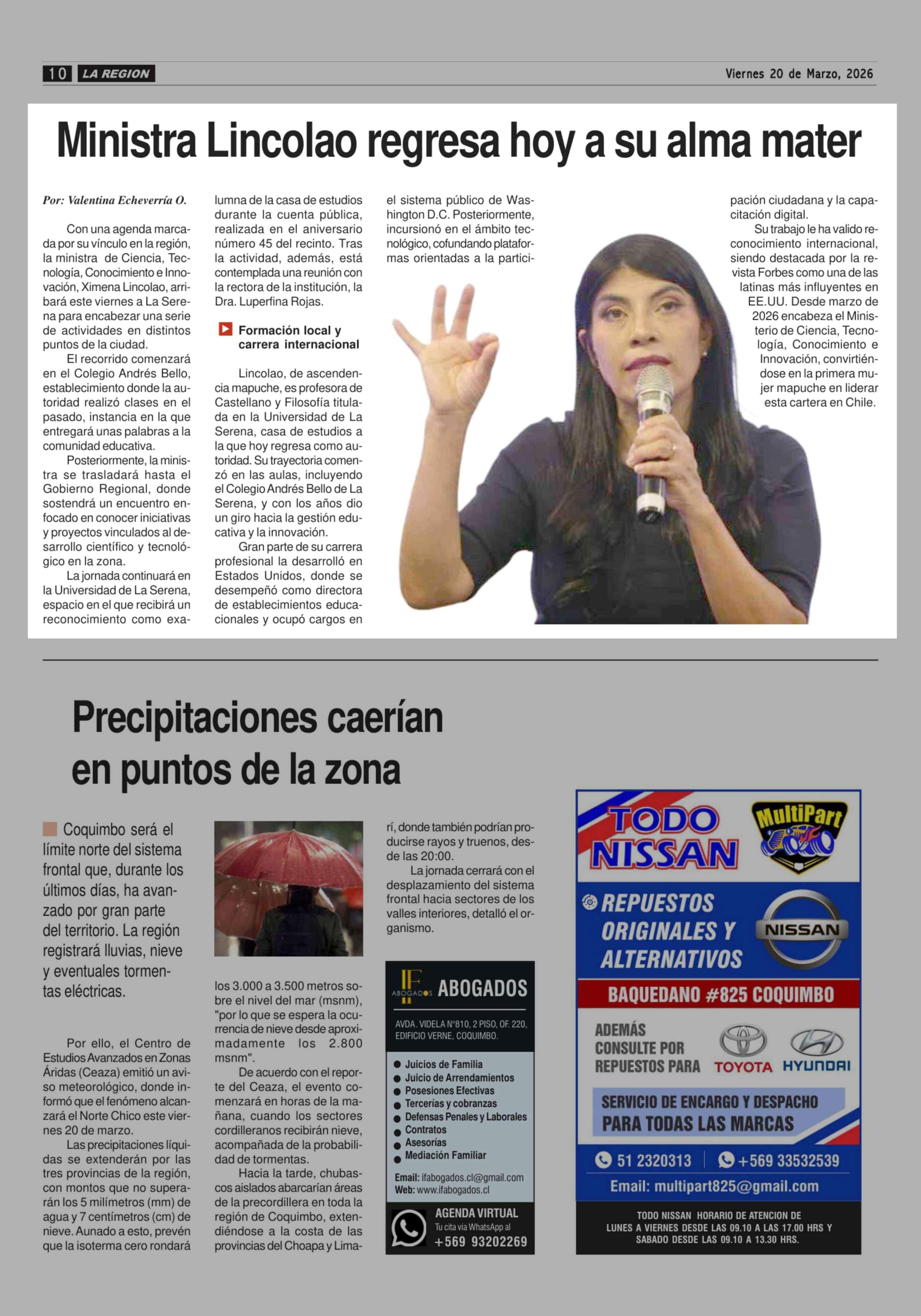 Ministra Lincolao regresa hoy a su alma mater 20-03-2026 Diario la Región |