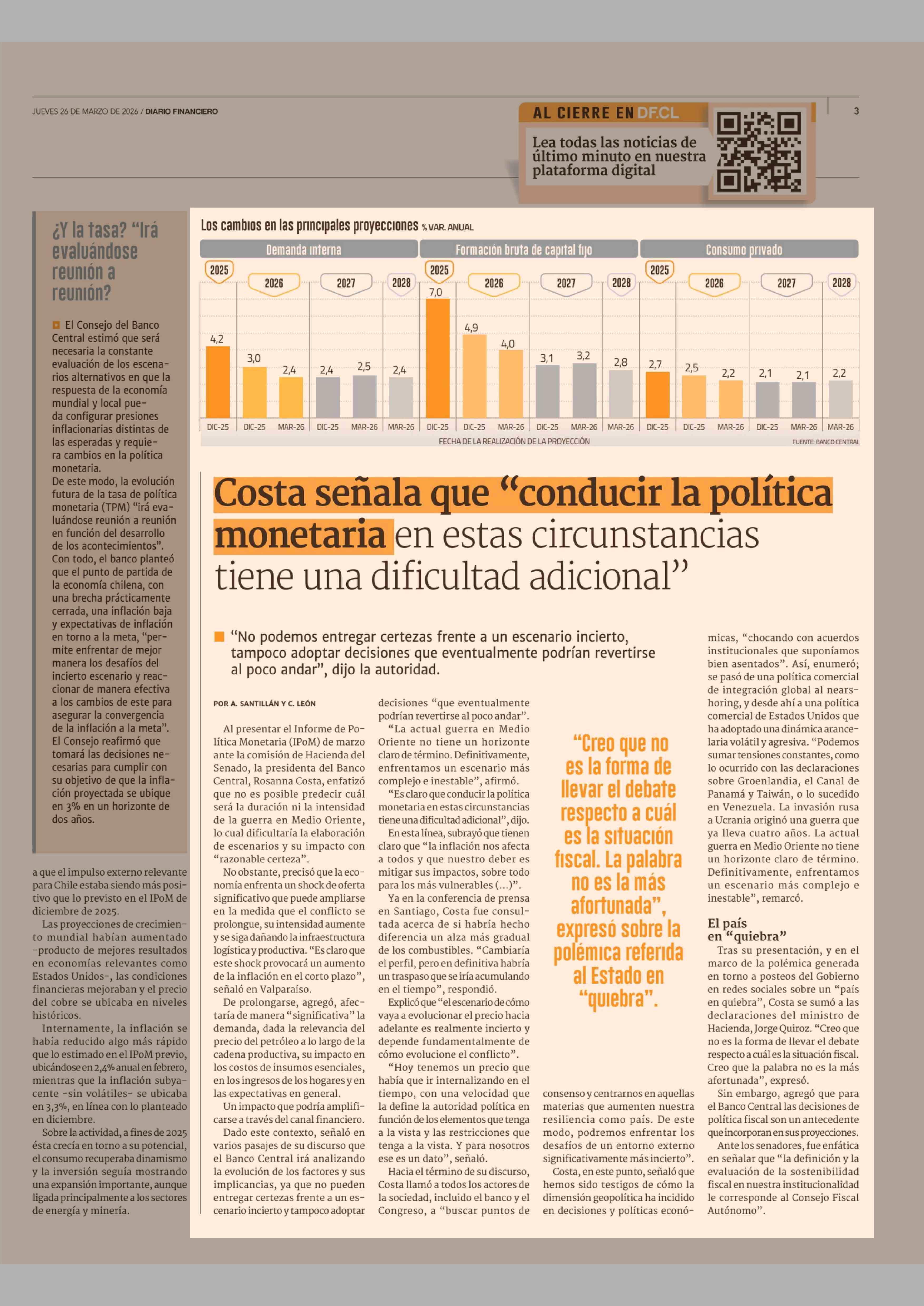 Costa señala que "conducir la política monetaria en estas circunstancias tiene una dificultad adicional" 26-03-2026 Diario Financiero |