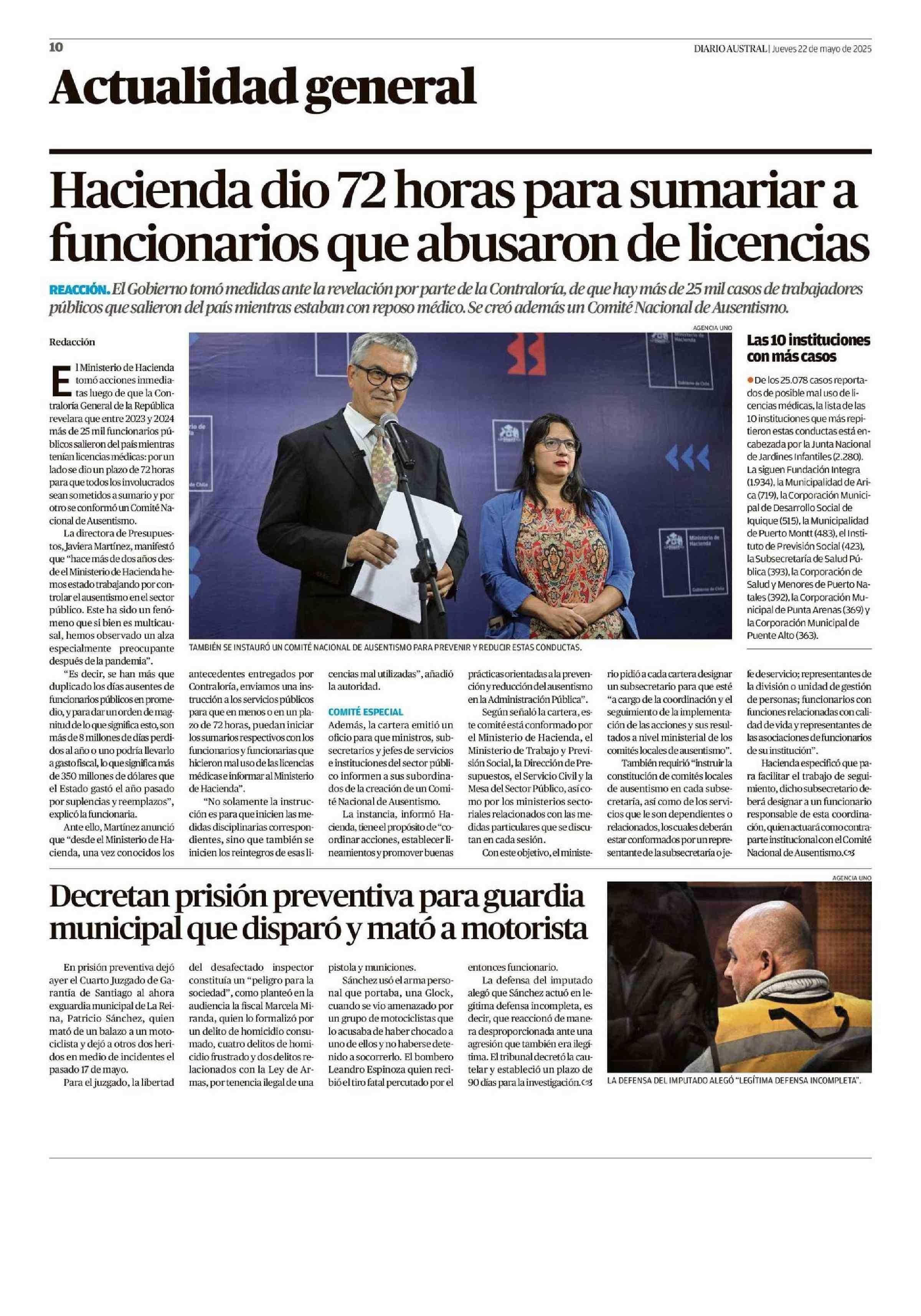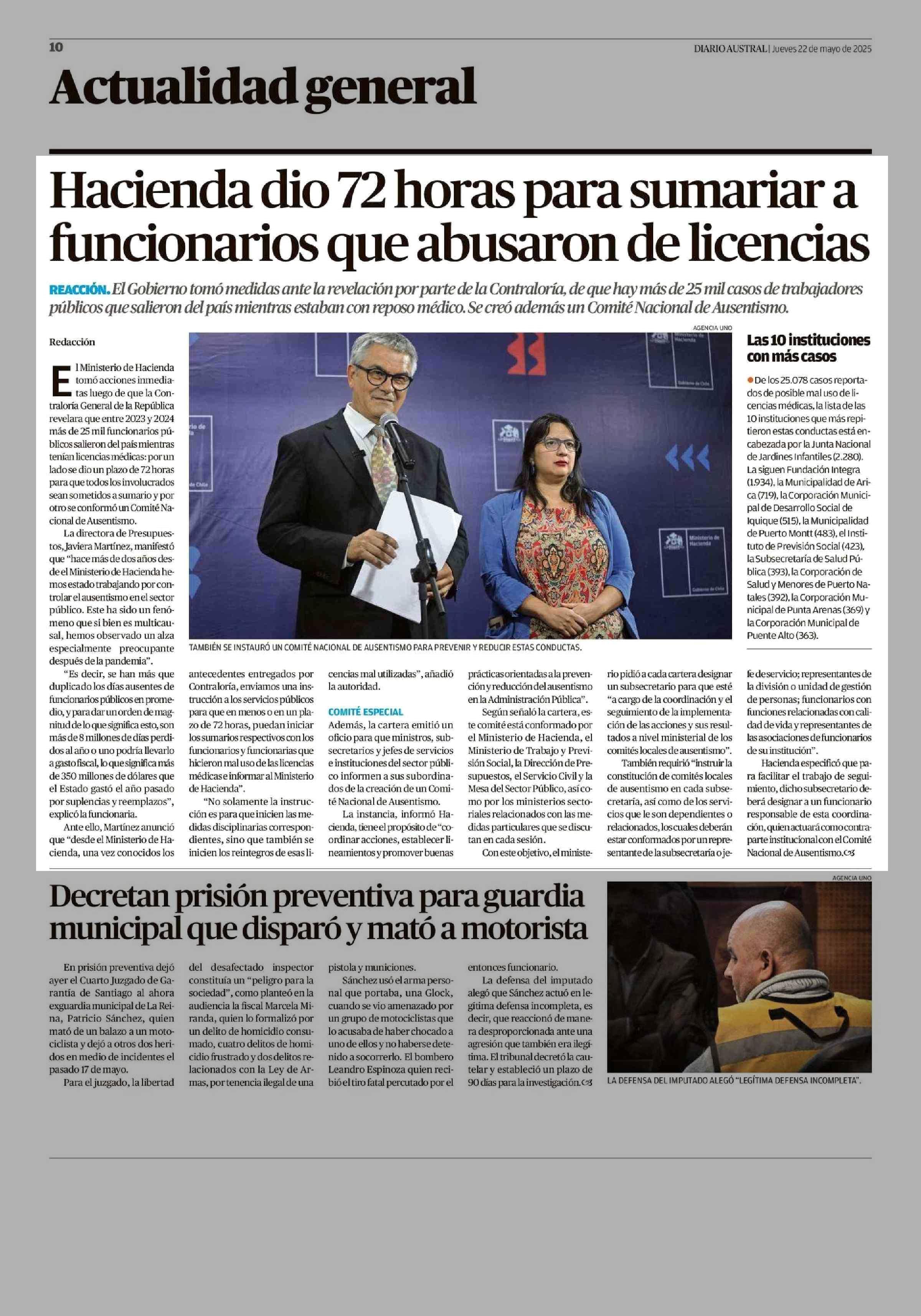 Hacienda dio 72 horas para sumariar a funcionarios que abusaron de licencias 22-05-2025 Diario Austral Región de Los Ríos |
