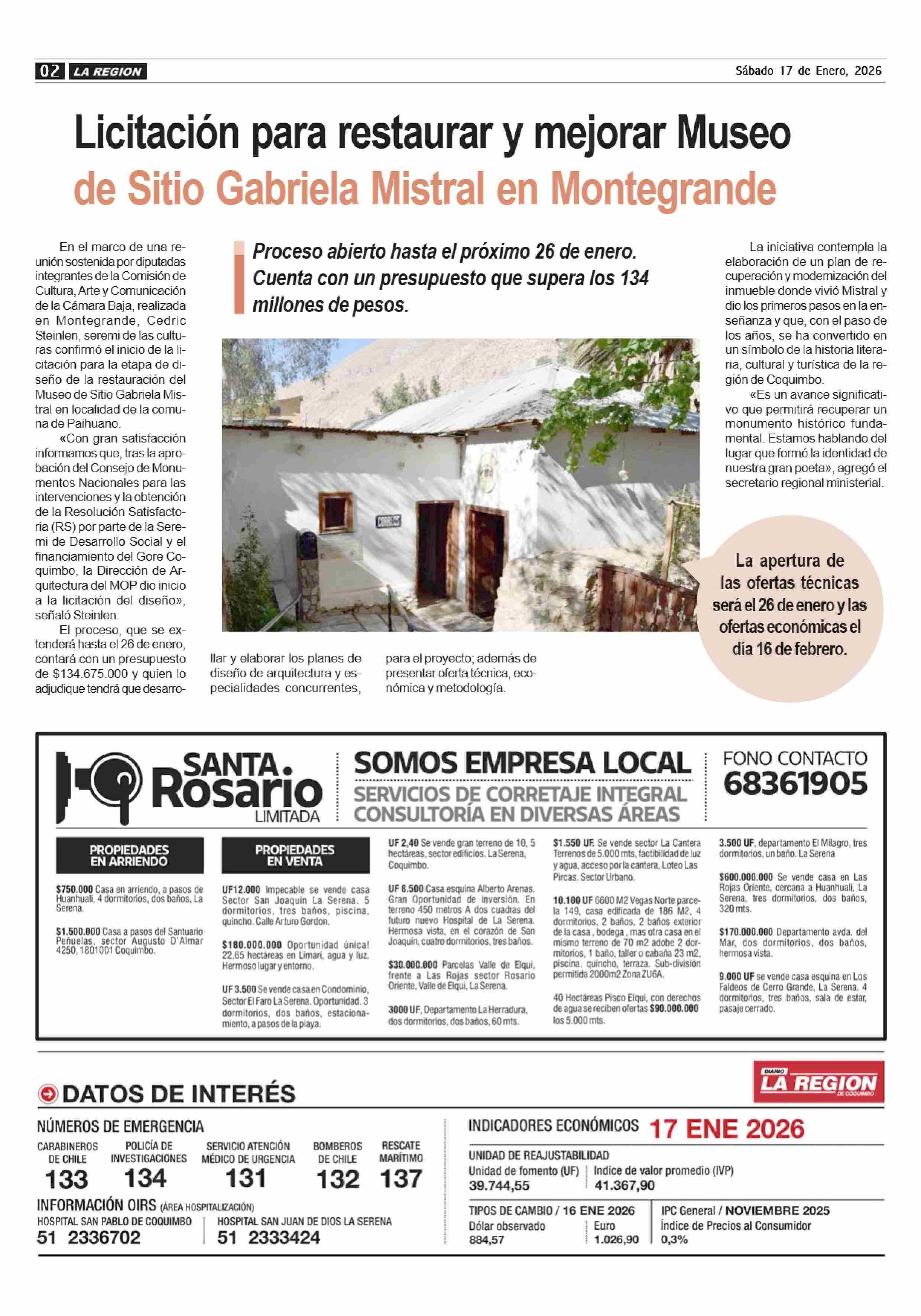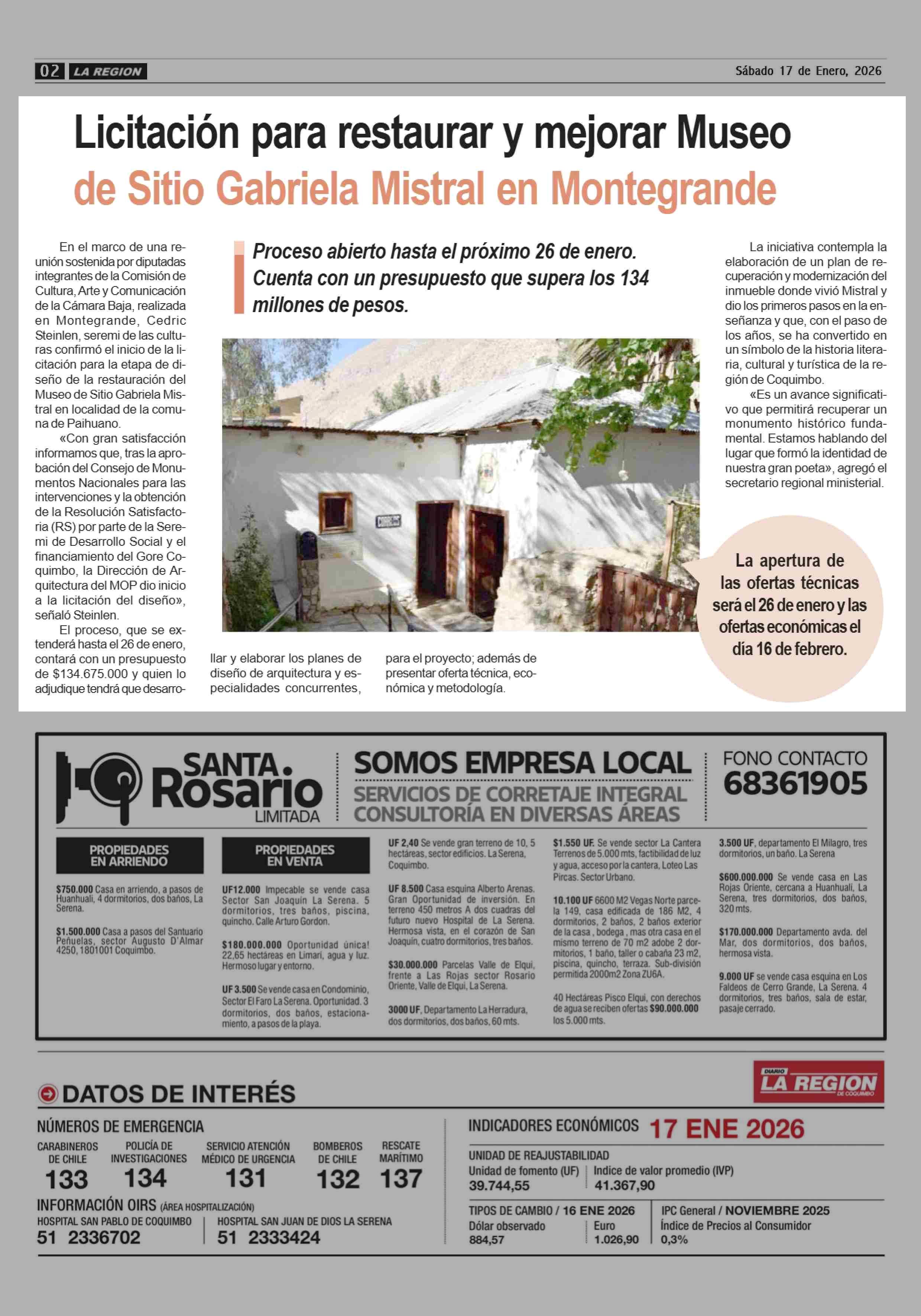 Licitación para restaurar y mejorar Museo de Sitio Gabriela Mistral en Montegrande 17-01-2026 Diario la Región |