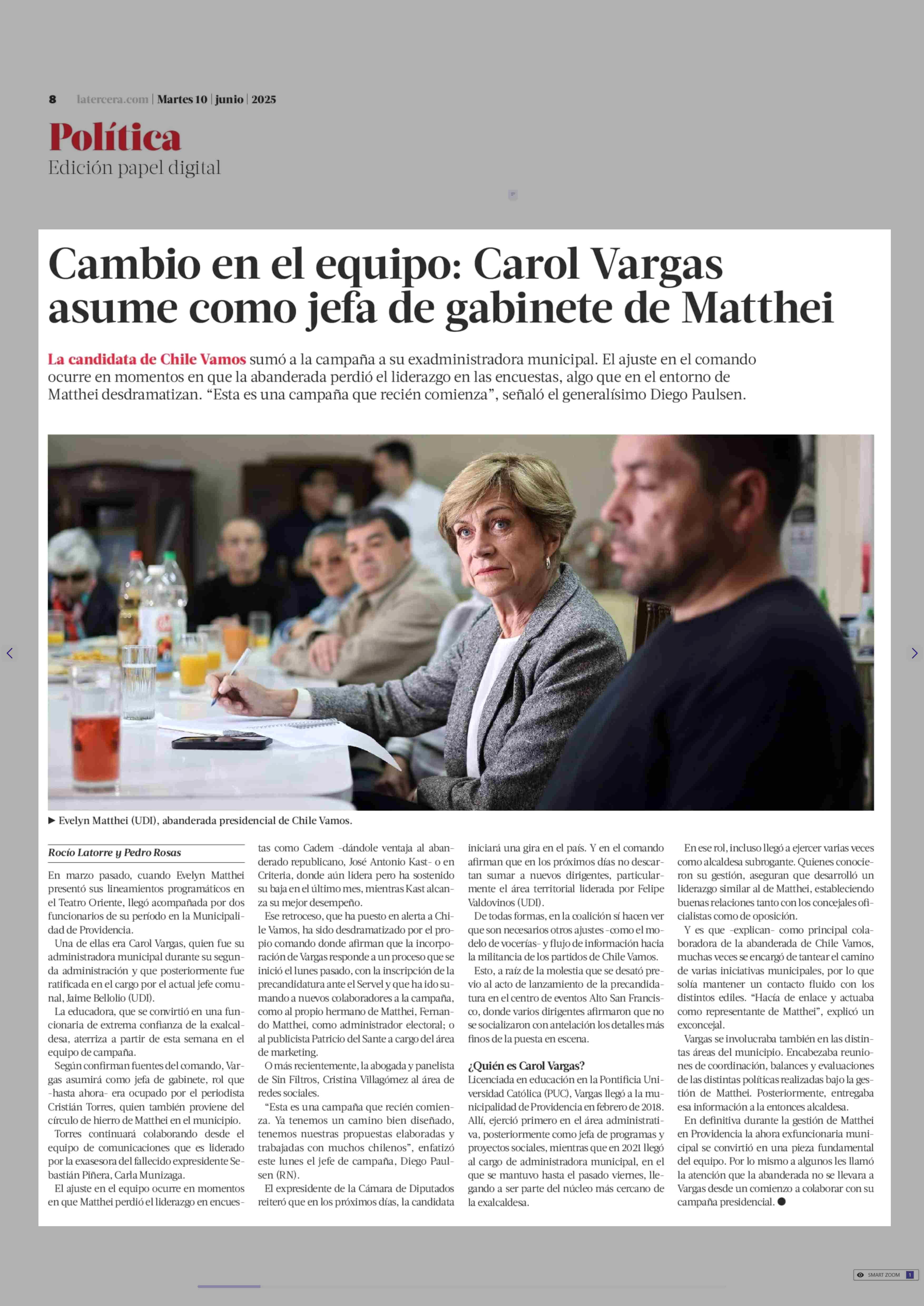 Cambio en el equipo: Carol Vargas asume como jefa de gabinete de Matthei 10-06-2025 La Tercera |