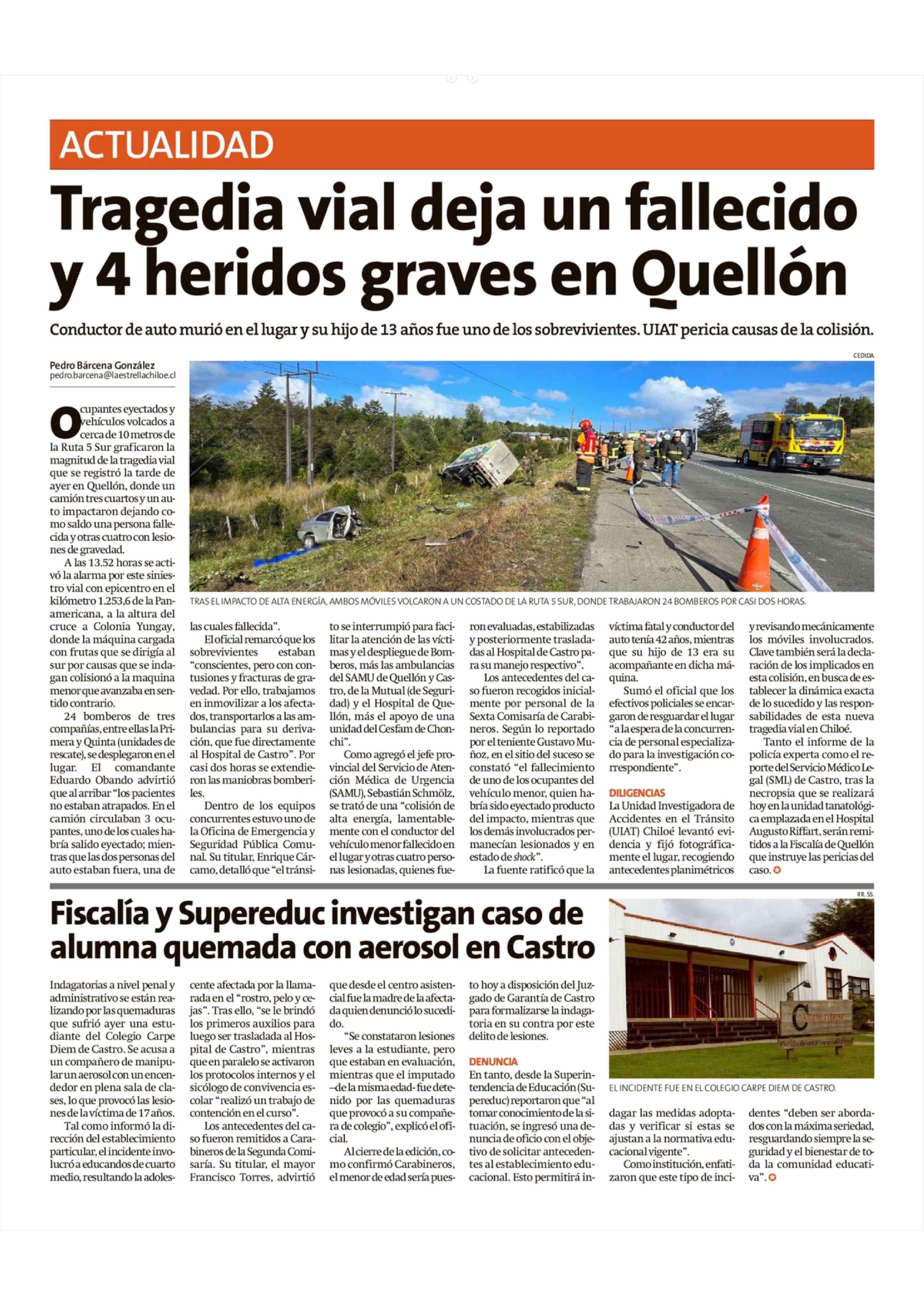 Tragedia vial deja un fallecido y 4 heridos graves en Quellón 15-04-2026 La Estrella de Chiloé |