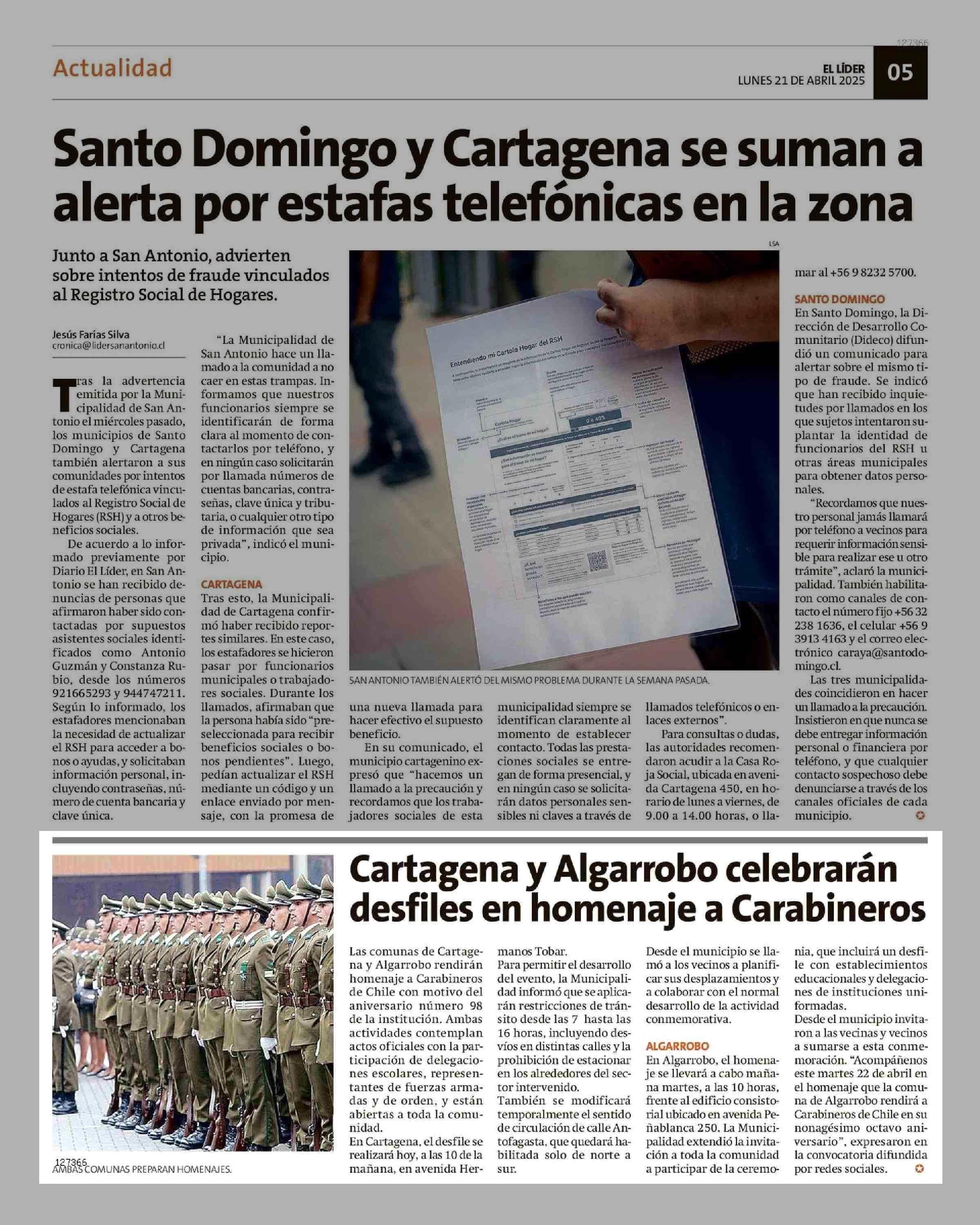 ¿E Cartagena y Algarrobo celebrarán aestl les en homenaje a Carabineros 21-04-2025 El Líder |