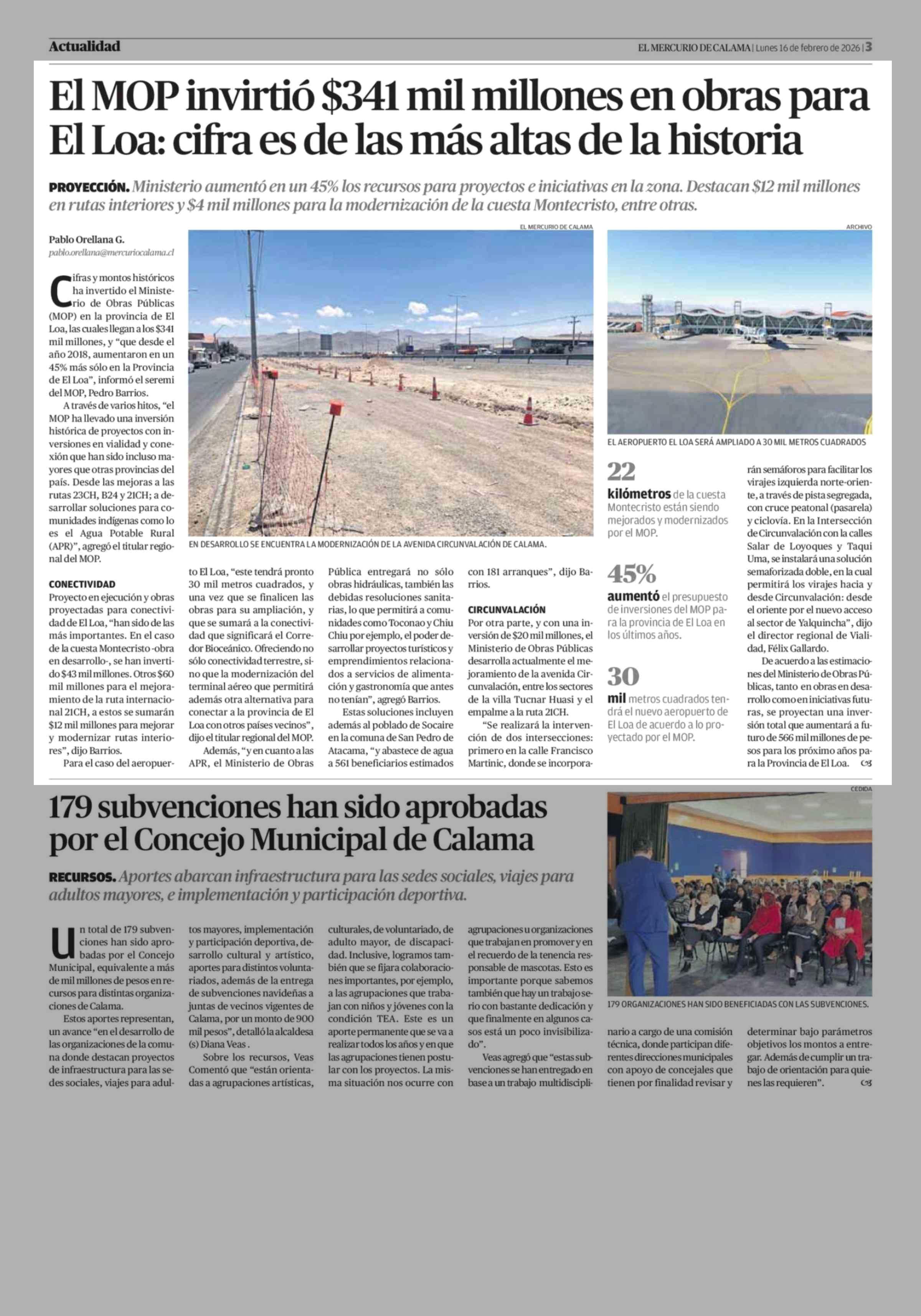 El MOP invirtió $341 mil millones en obras para El Loa: cifra es de las más altas de la historia 16-02-2026 El Mercurio de Calama |