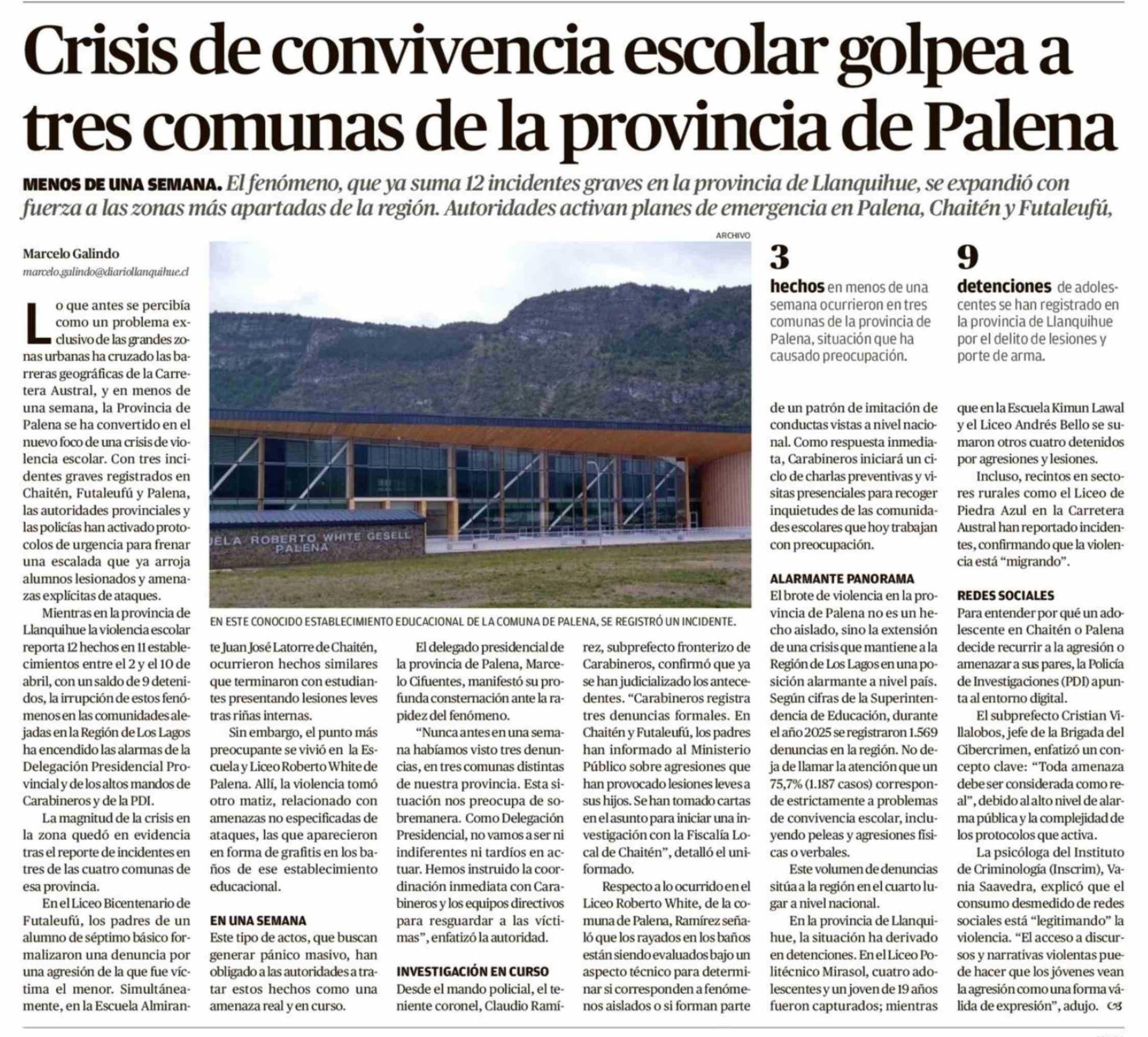 Crisis de convivencia escolar golpea a tres comunas de la provincia de Palena 13-04-2026 El Llanquihue |