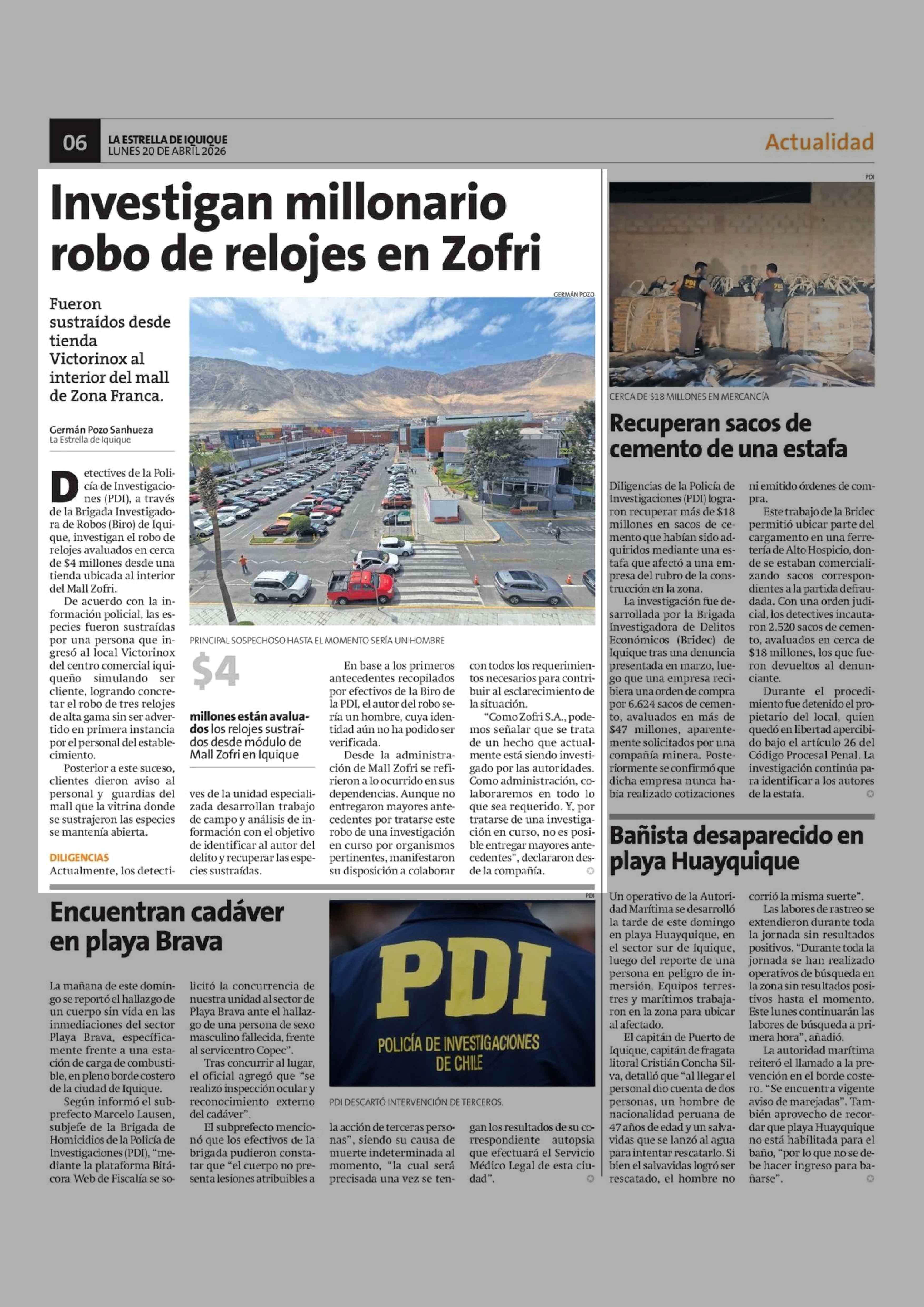 Investigan millonario robo de relojes en Zofri 20-04-2026 La Estrella de Iquique |