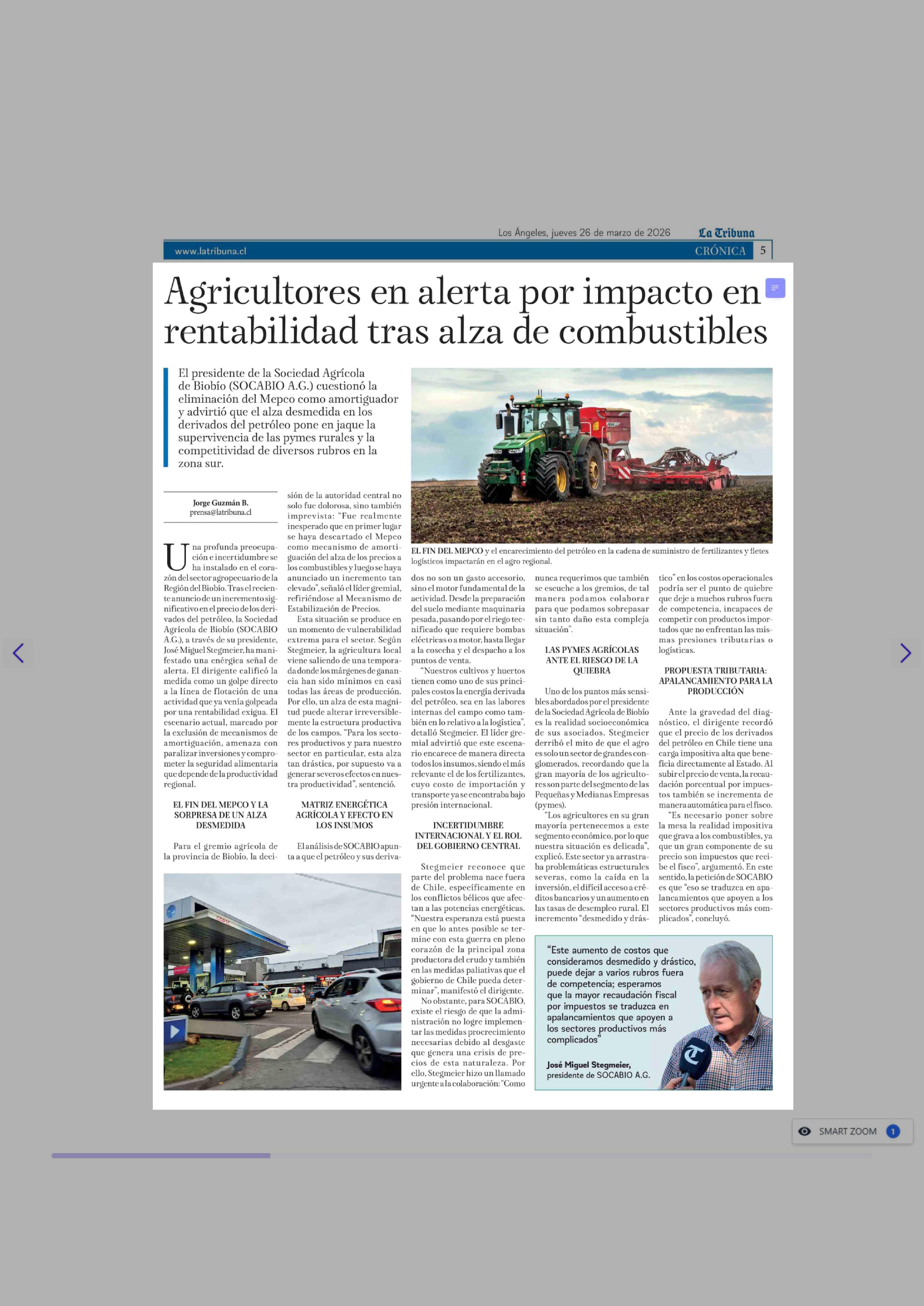 Agricultores en alerta por impacto en rentabilidad tras alza de combustibles 26-03-2026 La Tribuna |