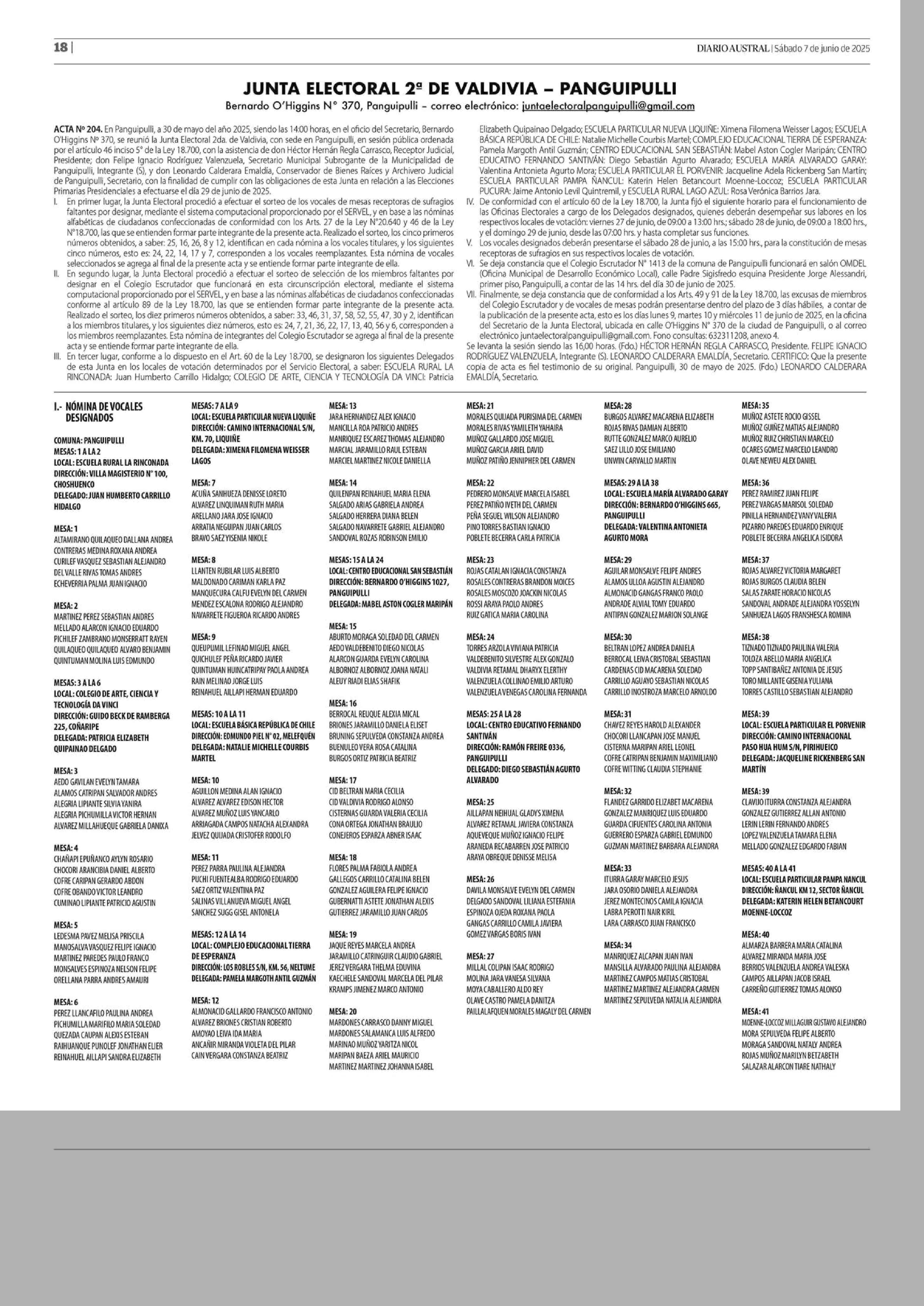 JUNTA ELECTORAL 2* DE VALDIVIA - PANGUIPULLI Bernardo O'Hiacins N* 270. Panavioulli - correo electrónico: iuntaelectoraloanaviouliBamail com A ANA 07-06-2025 Diario Austral Región de Los Ríos |