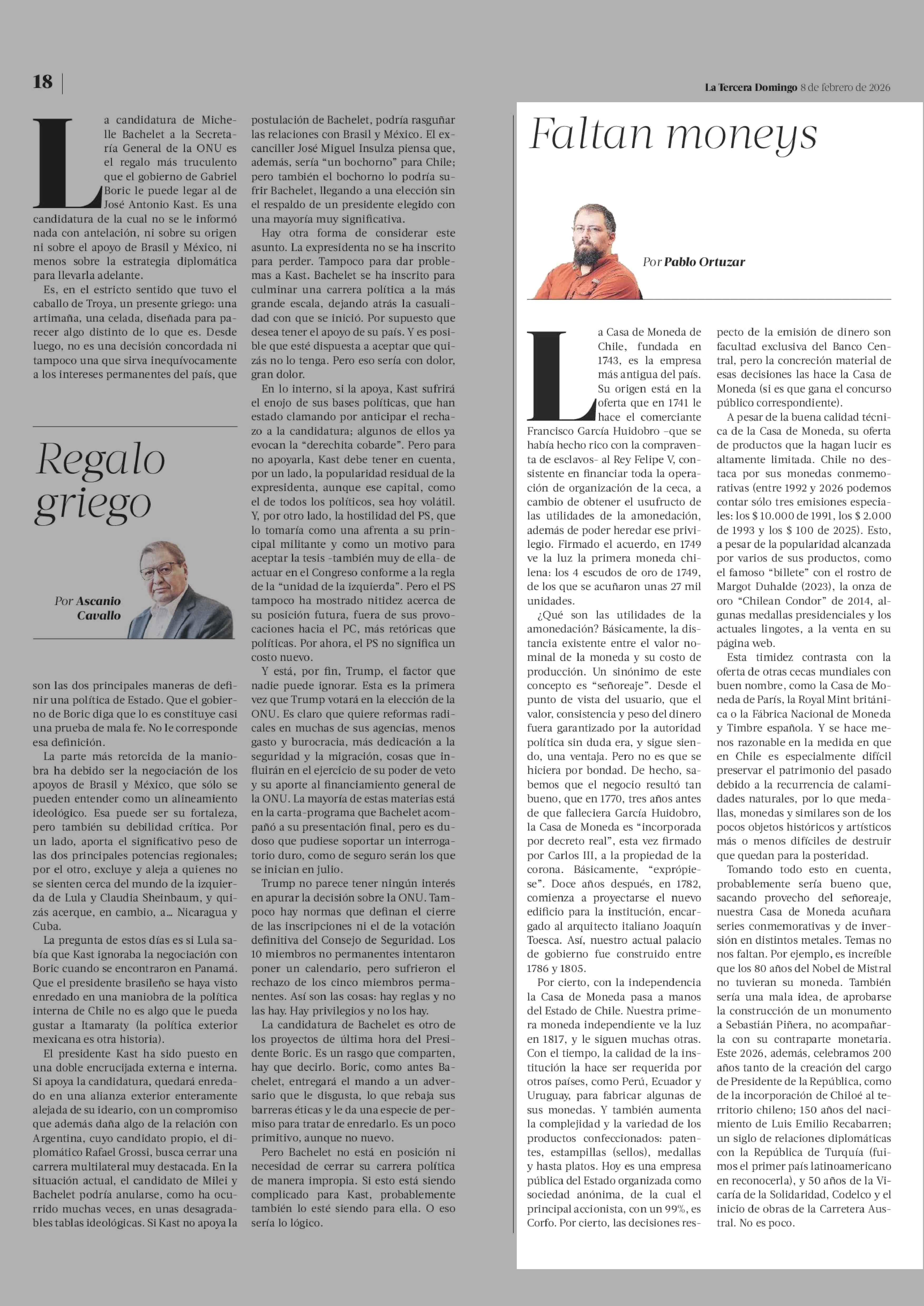 COLUMNAS DE OPINIÓN: Faltan moneys 08-02-2026 La Tercera |