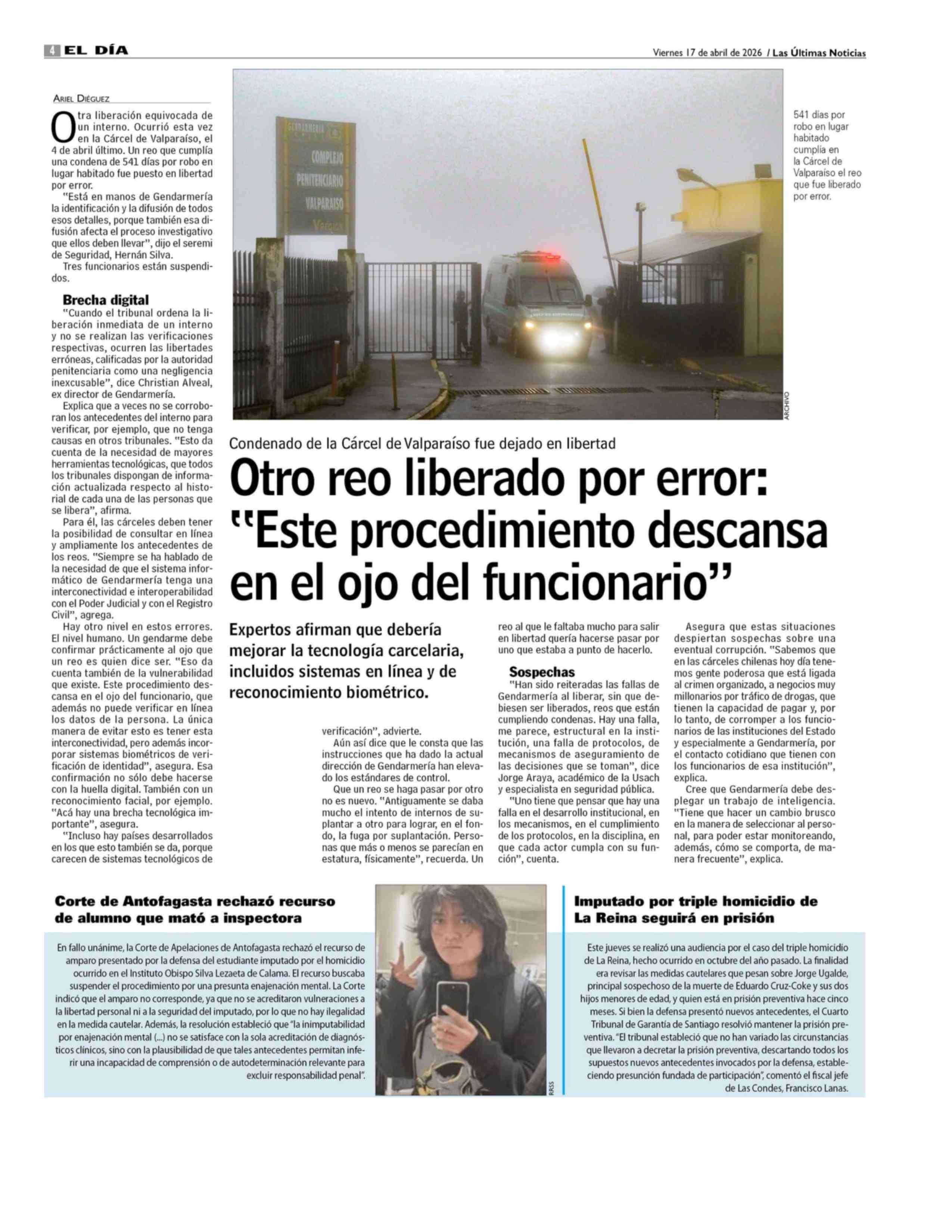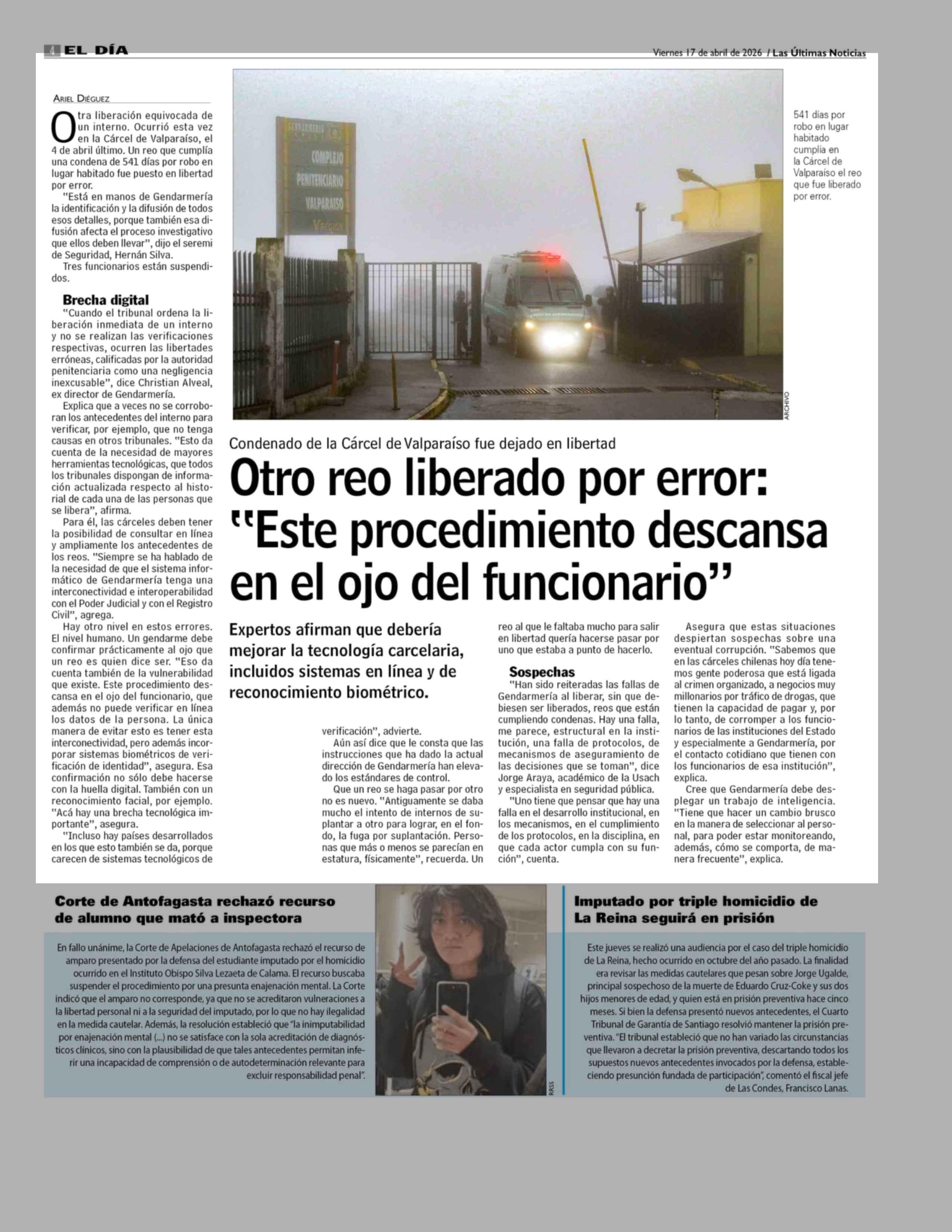 Otro reo liberado por error: "Este procedimiento descansa en el ojo del funcionario" 17-04-2026 Las Últimas Noticias |