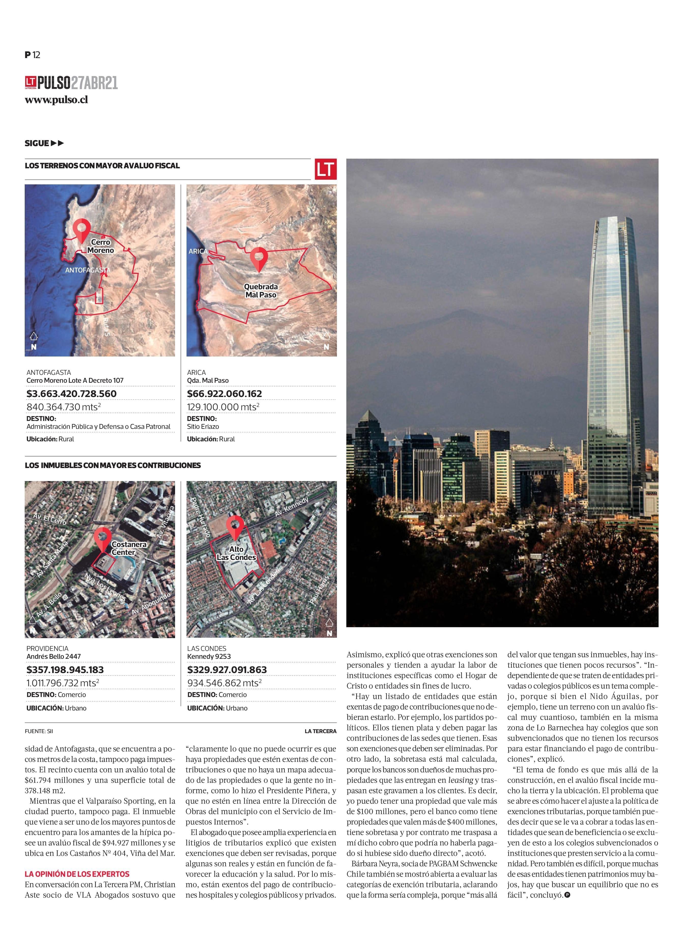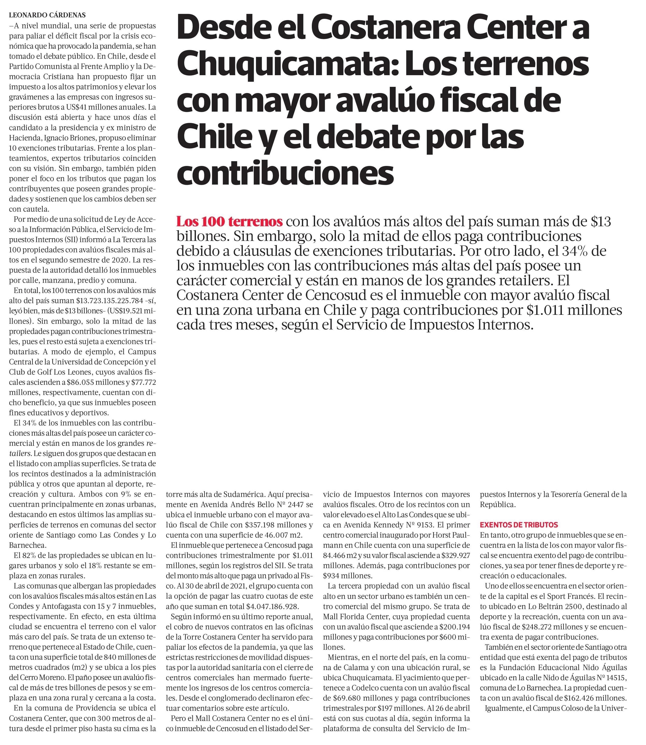 Desde el Costanera Center a Chuquicamata: Los terrenos con mayor avalúo fiscal de Chile y el debate por las contribuciones 27-04-2021 La Tercera |