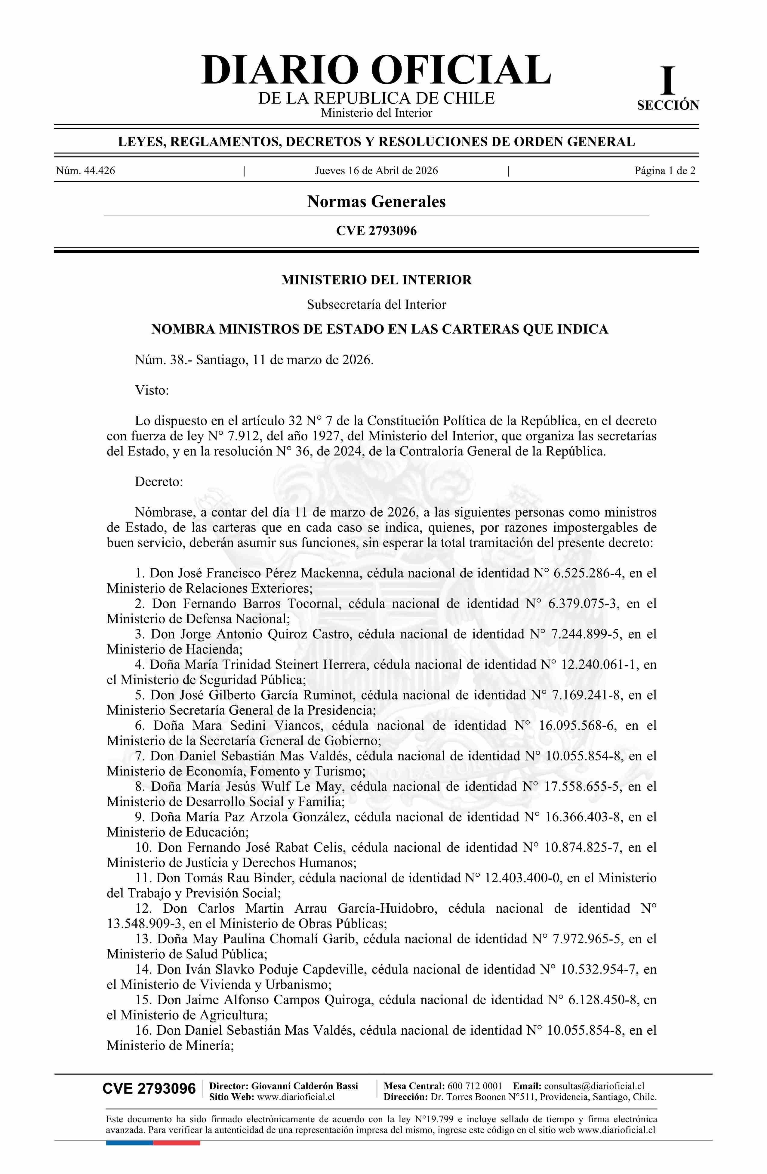 Decreto número 38, de 2026.- Nombra ministros de Estado en las carteras que indica