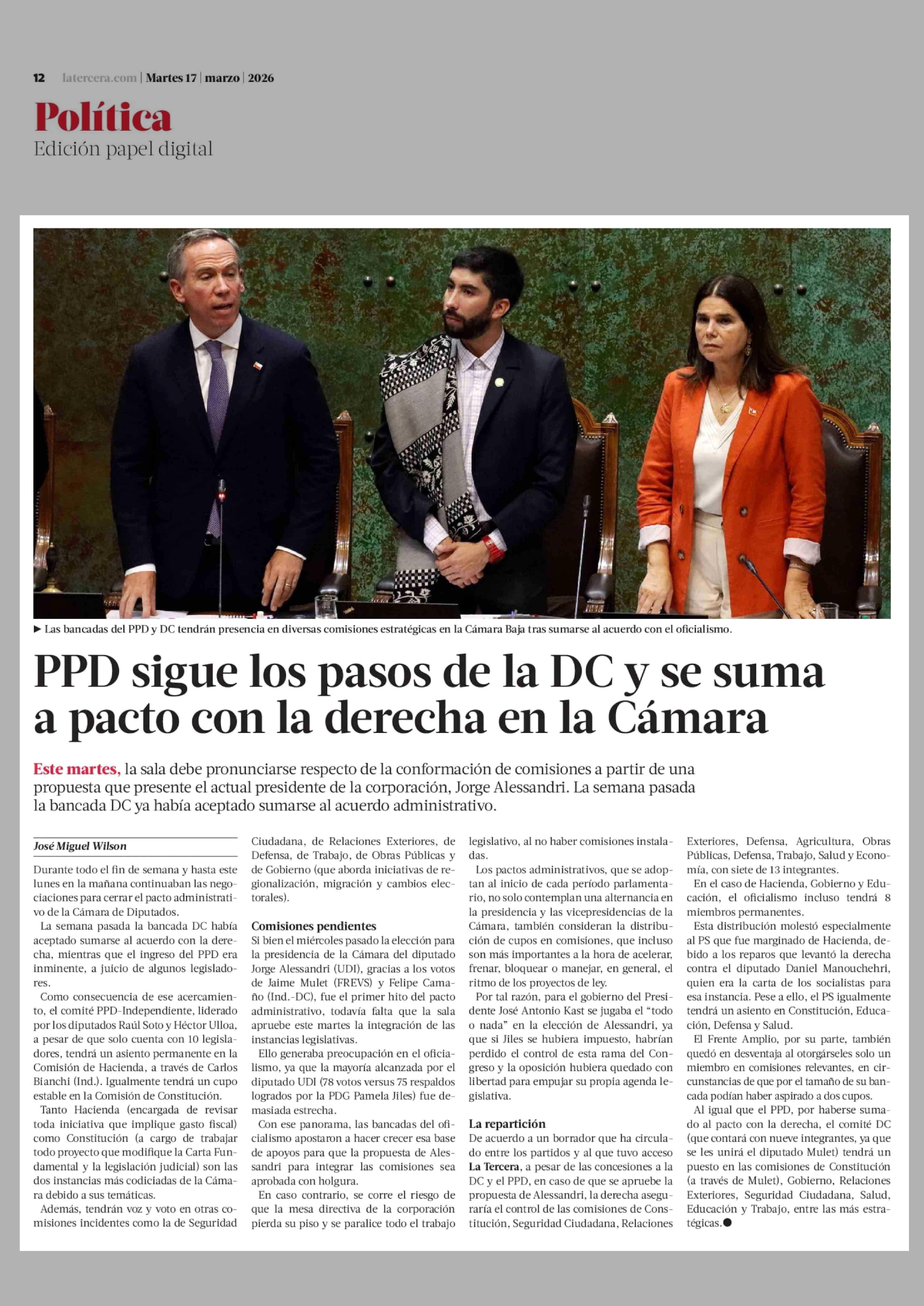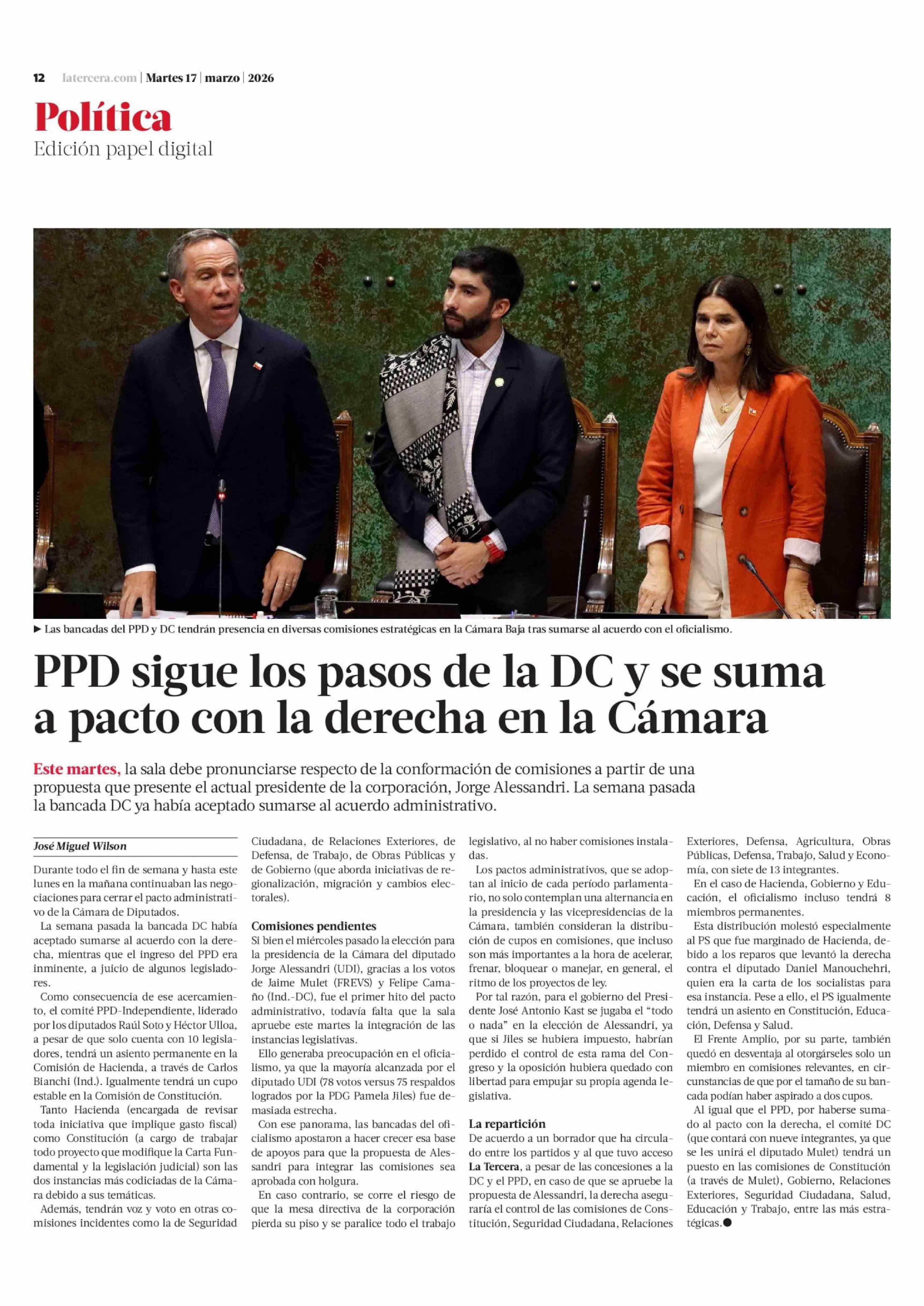 PPD sigue los pasos de la DC y se suma a pacto con la derecha en la Cámara 17-03-2026 La Tercera |