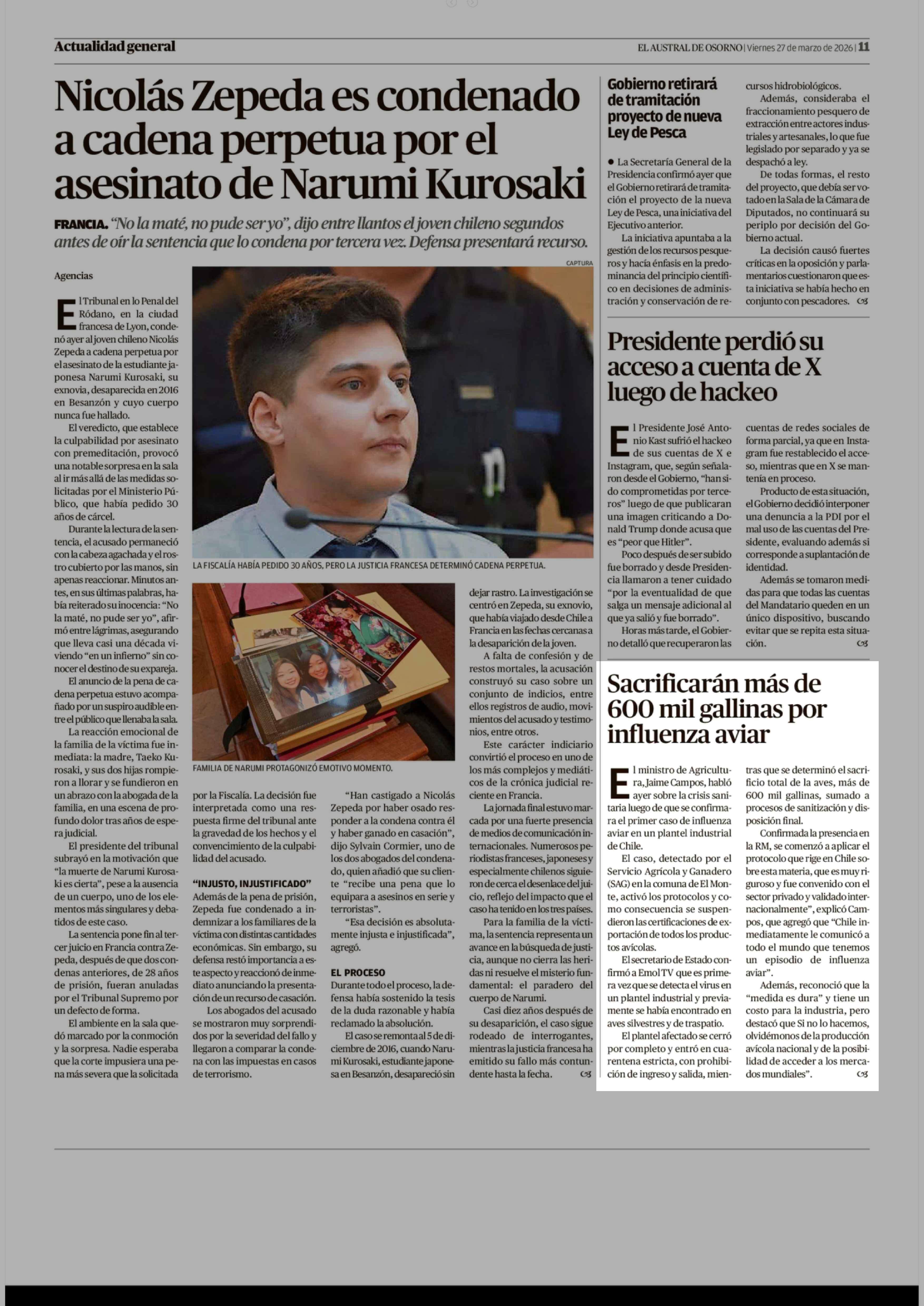 Sacrificarán más de 600 mil gallinas por influenza aviar 27-03-2026 El Austral de Osorno |