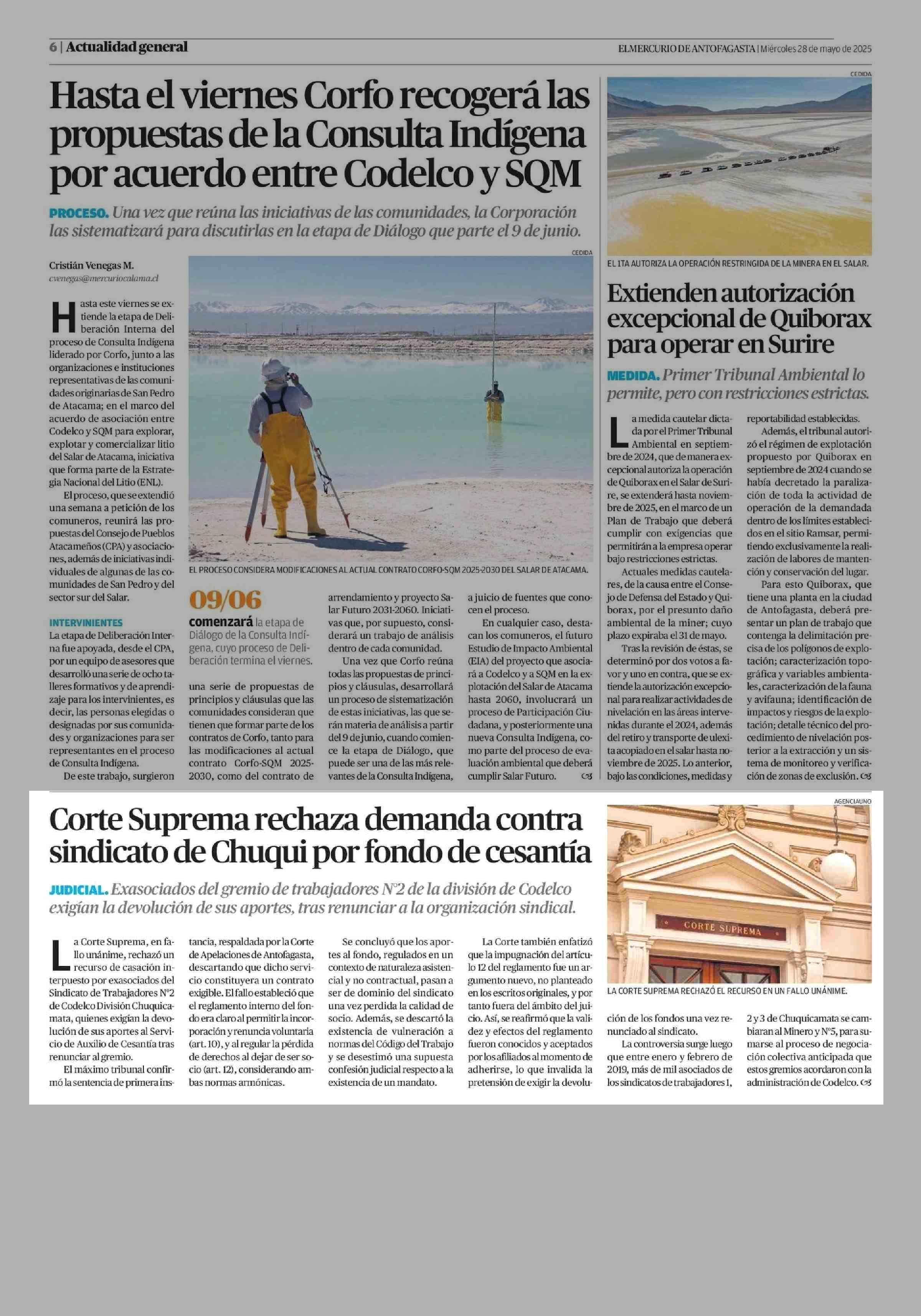 Corte Suprema rechaza demanda contra sindicato de Chuqui por fondo de cesantía 28-05-2025 El Mercurio de Antofagasta |