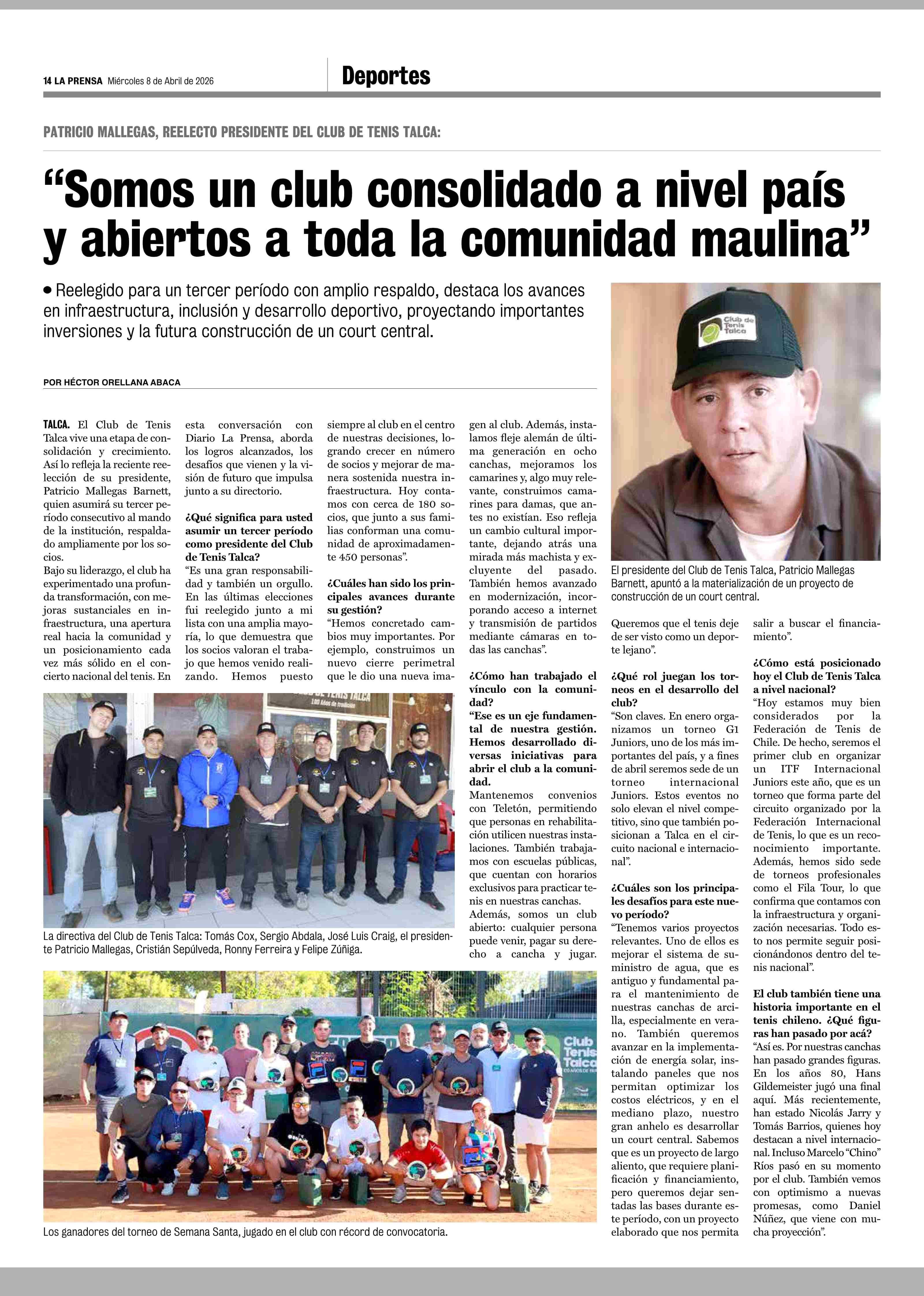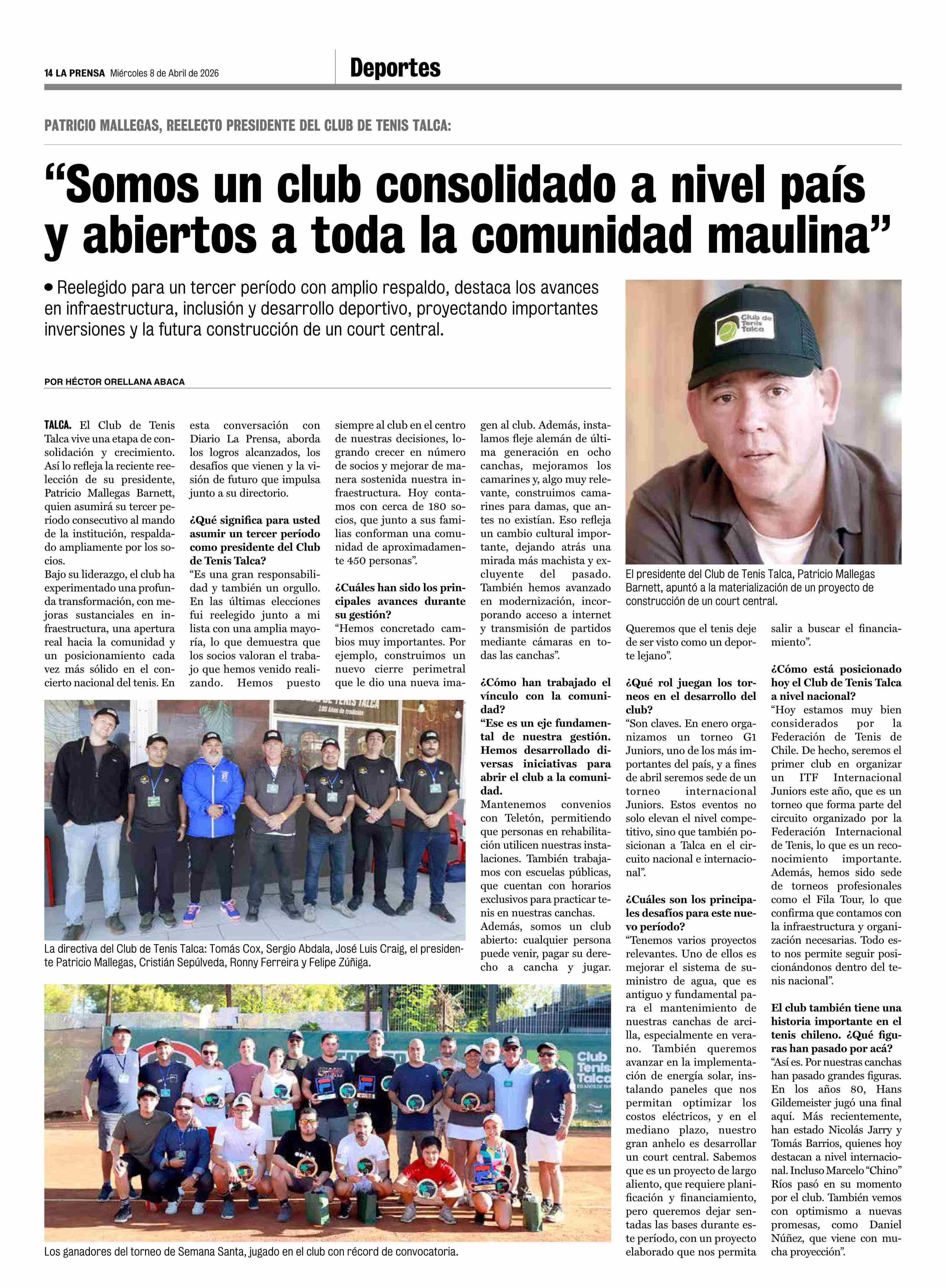 "Somos un club consolidado a nivel país y abiertos a toda la comunidad maulina" 08-04-2026 La Prensa de Curicó |
