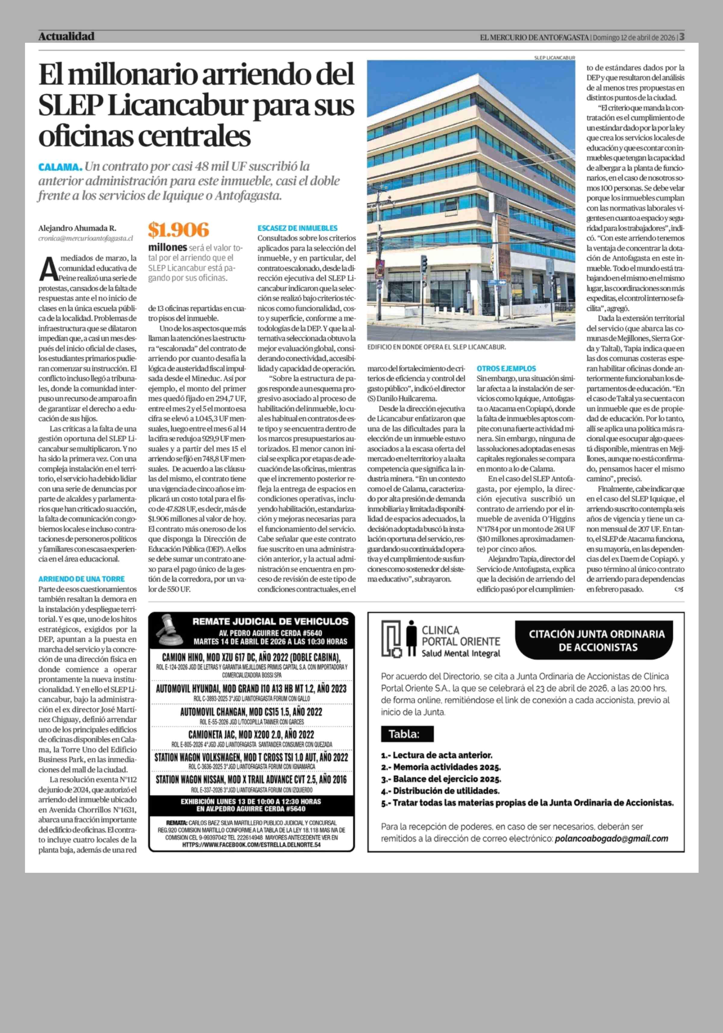 El millonario arriendo del SLEP Licancabur para sus oficinas centrales 12-04-2026 El Mercurio de Antofagasta |