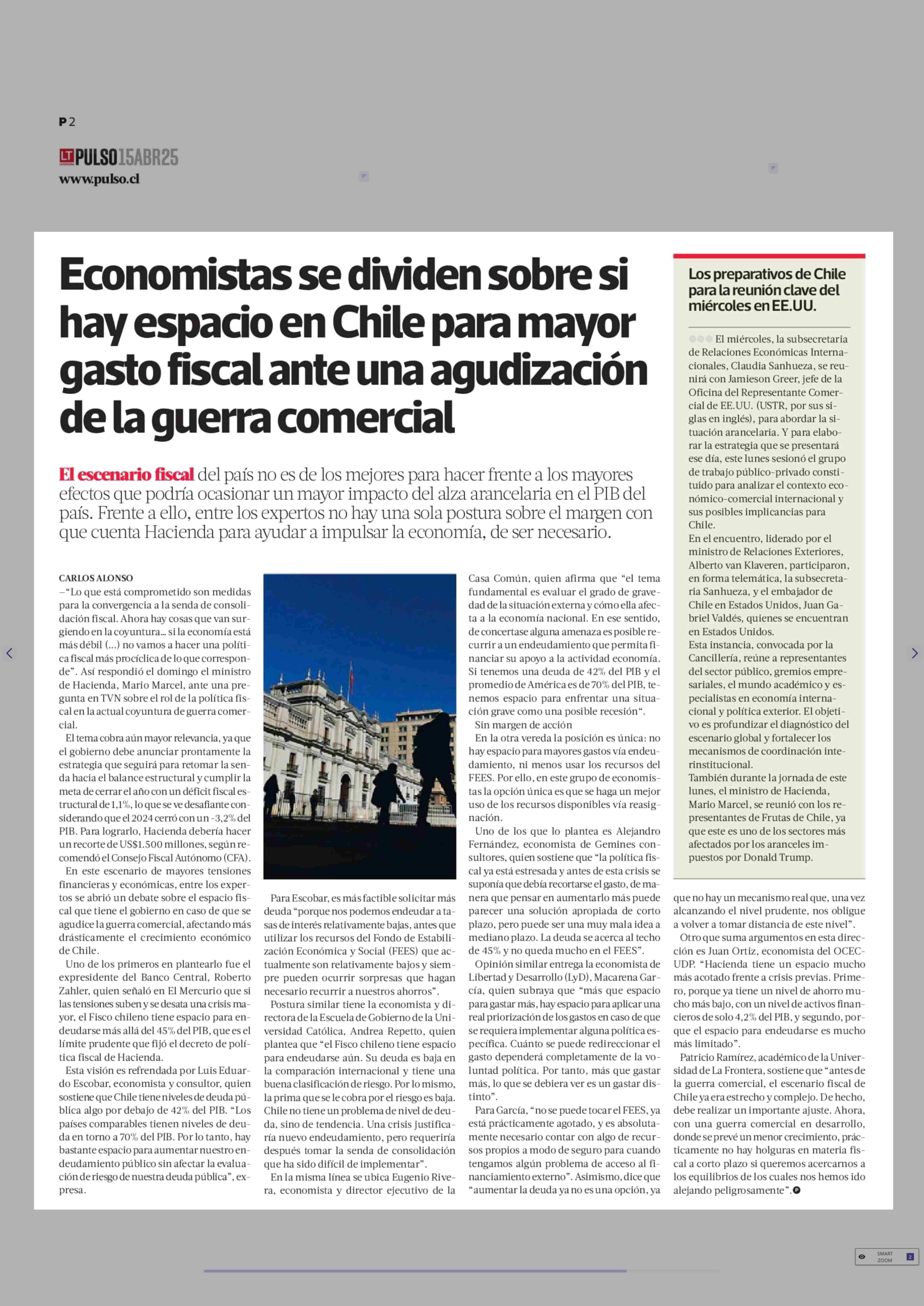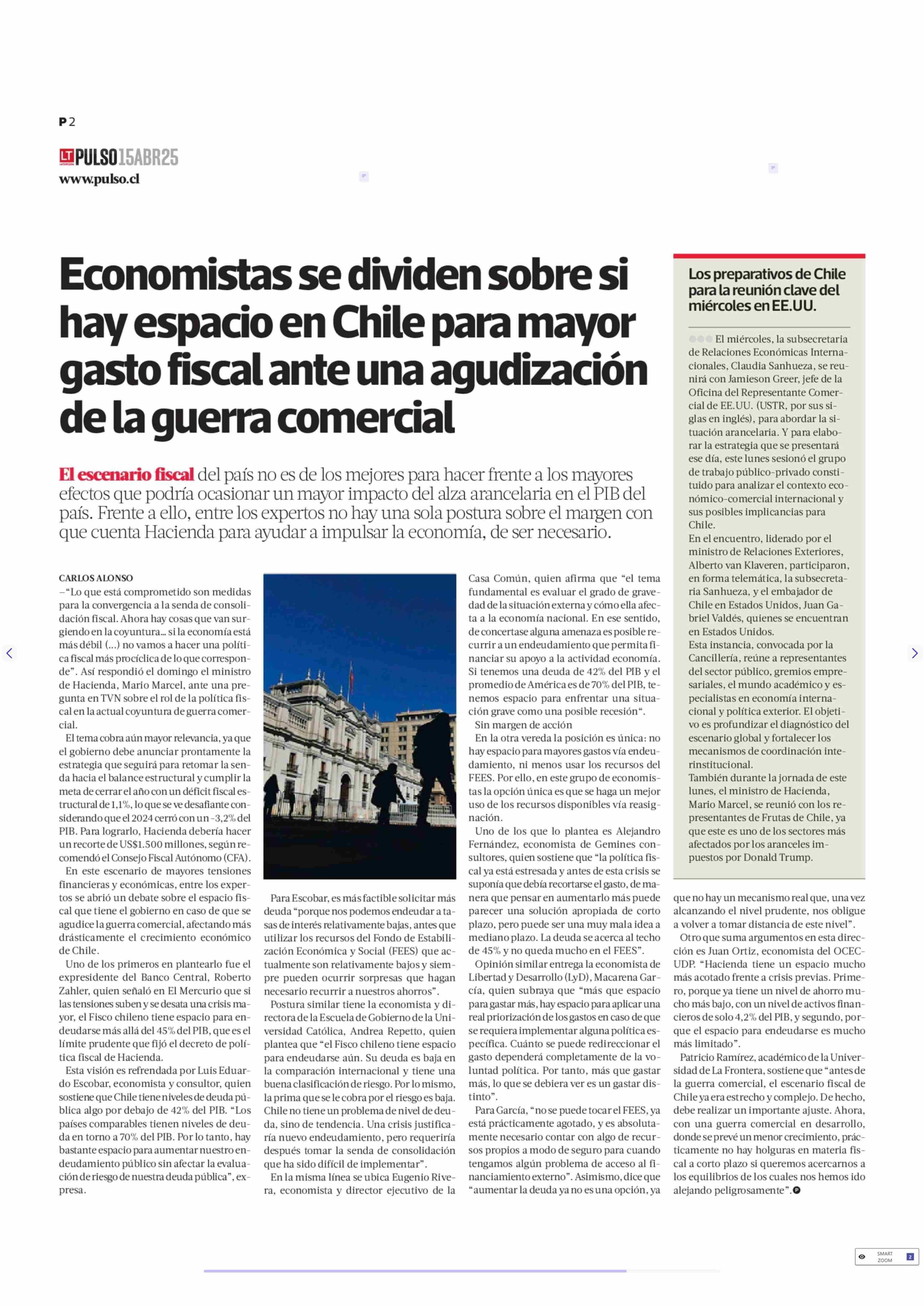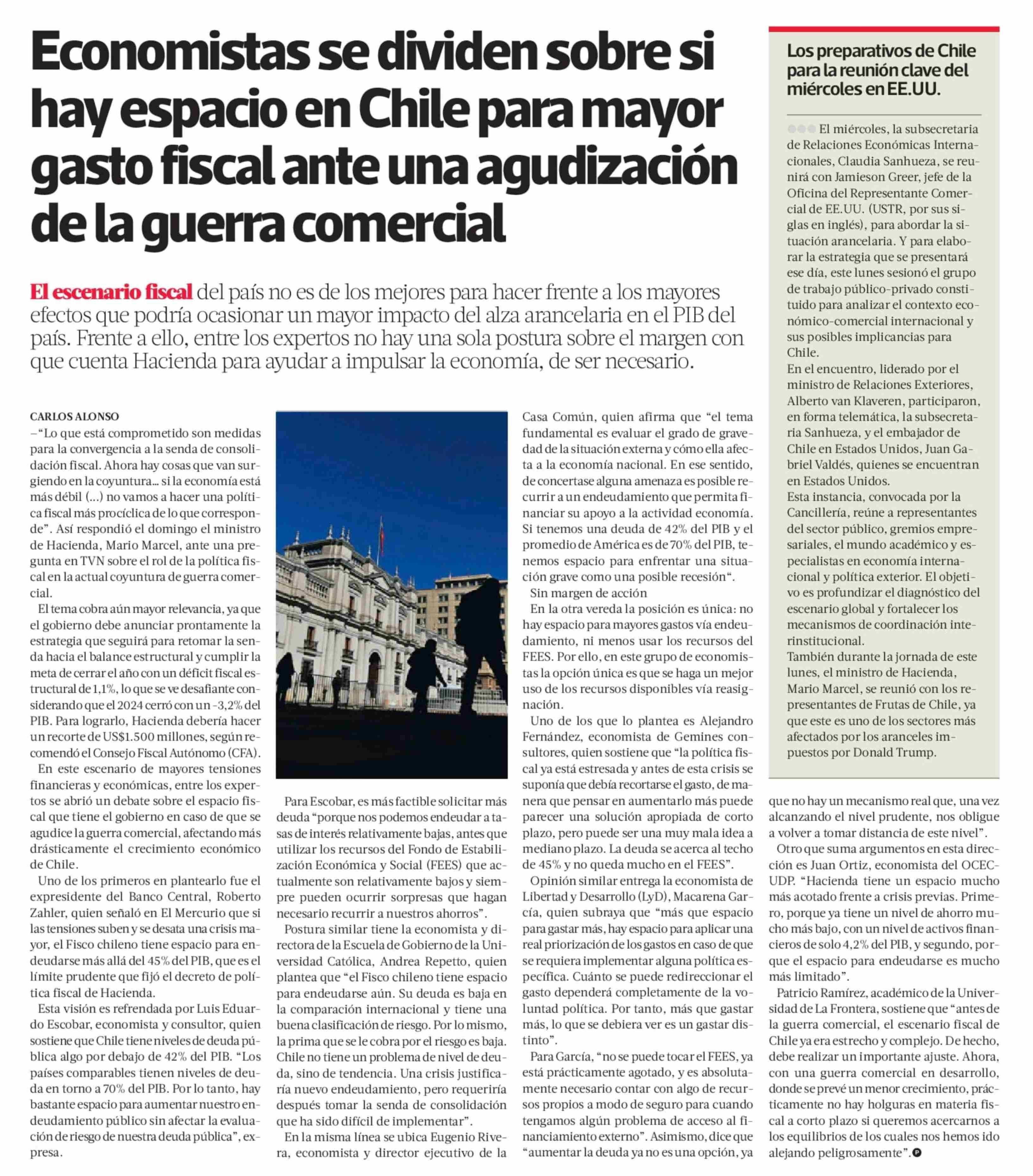 Economistas se dividen sobre si hay espacio en Chile para mayor gasto fiscal ante una agudización de la guerra comercial 15-04-2025 La Tercera |