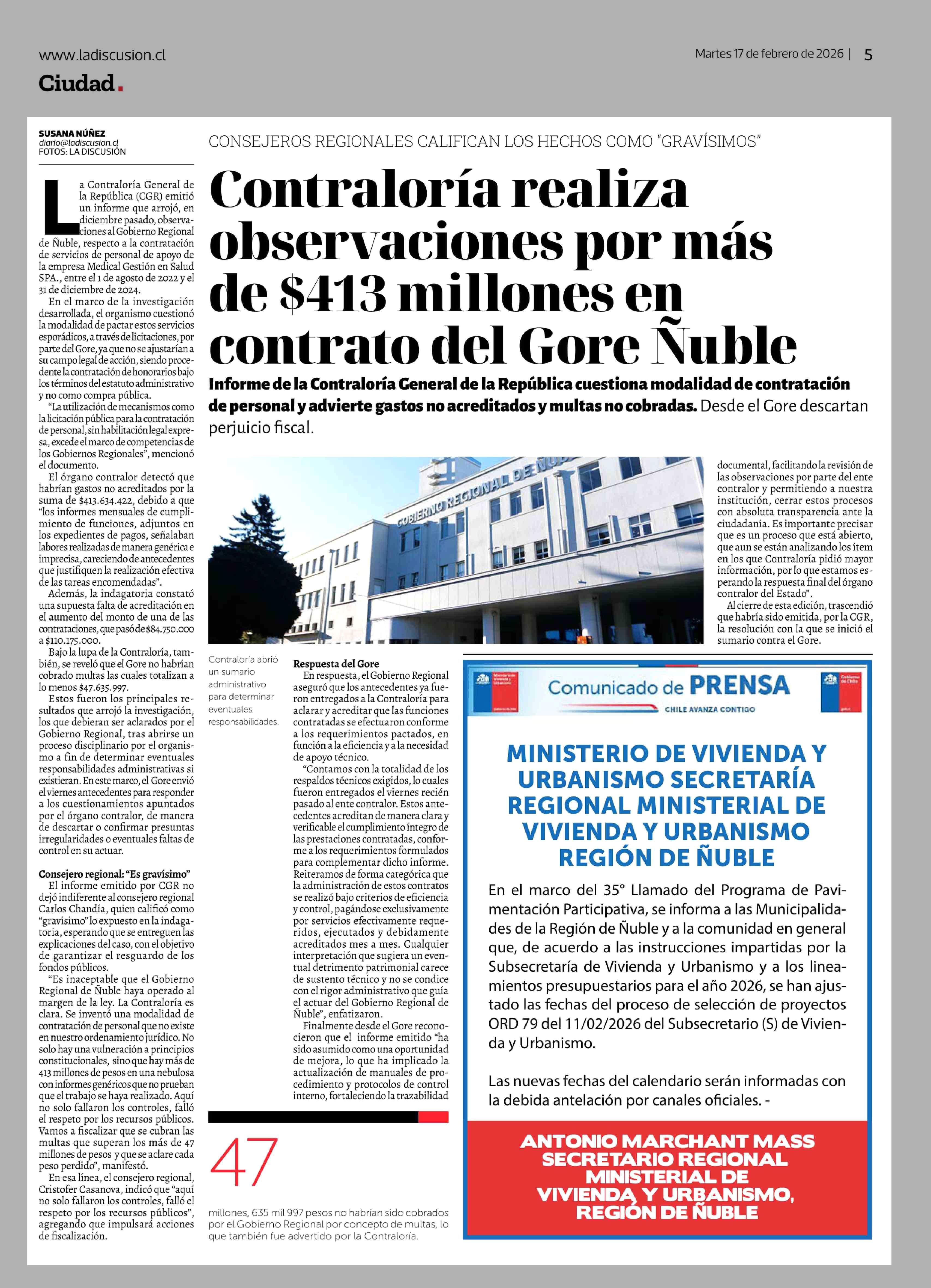 Contraloría realiza observaciones por más de $413 millones en contrato del Gore Nuble 17-02-2026 La Discusión |