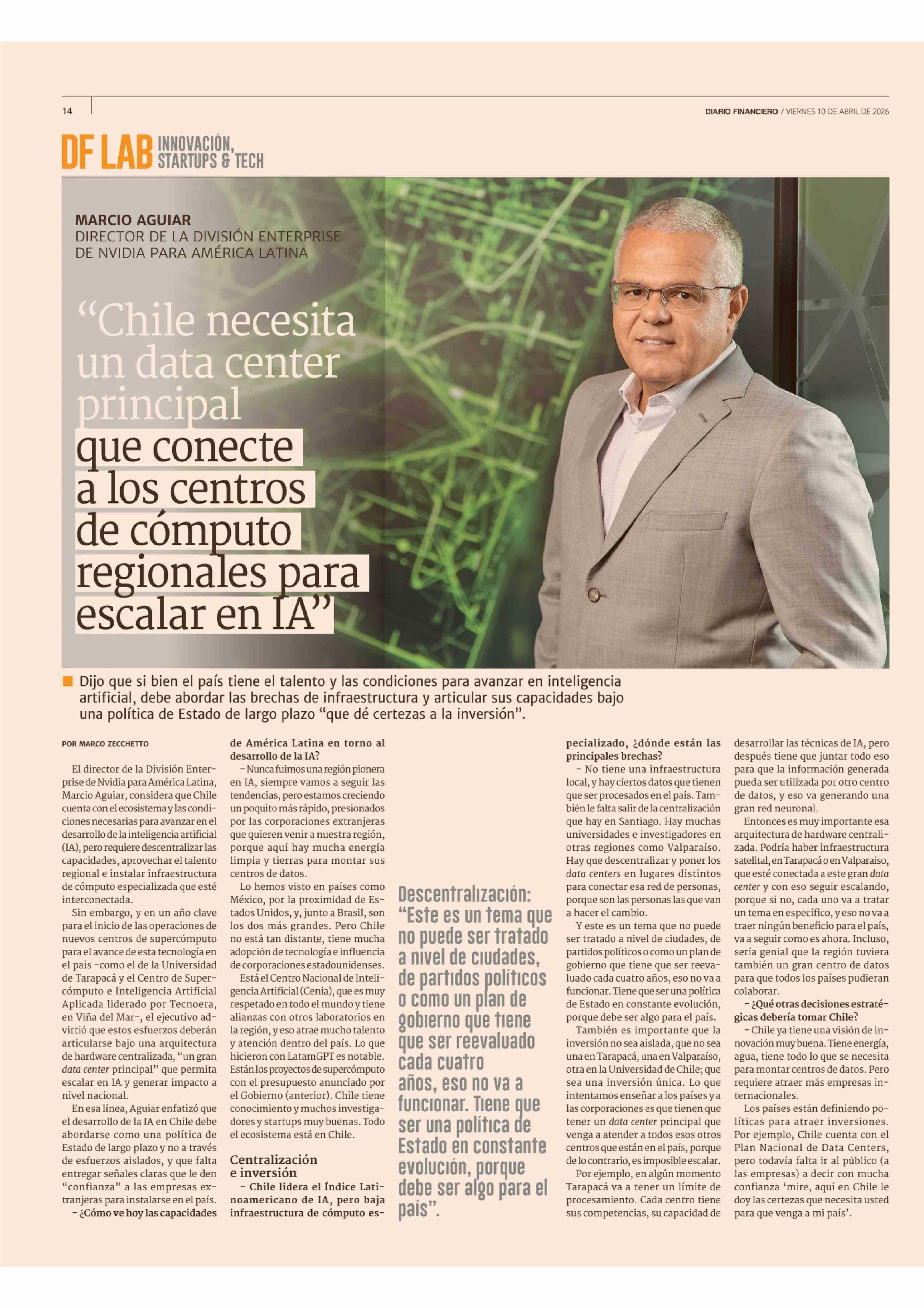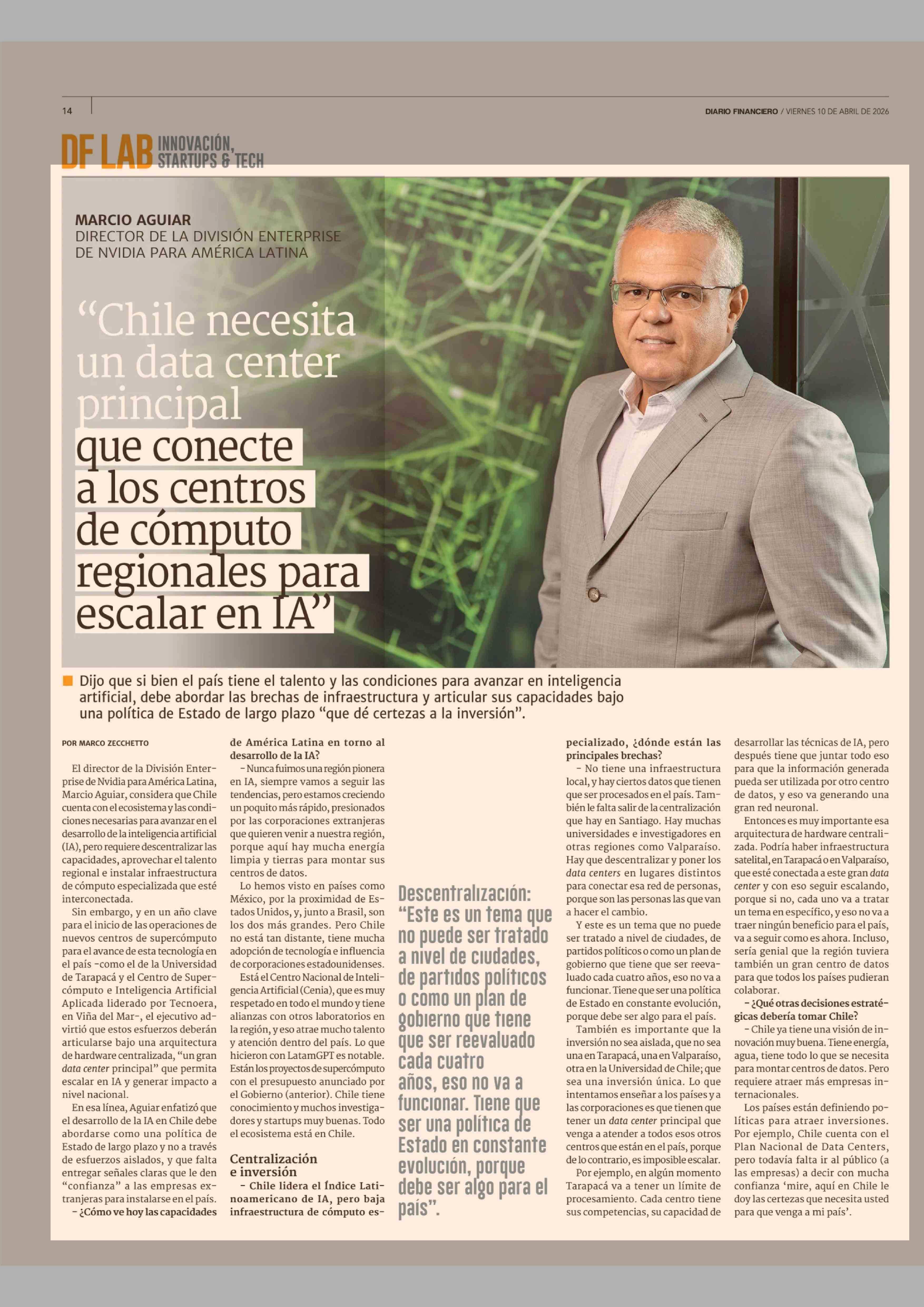 Principal que conecte a los centros de cómputo regionales para escalar en IA" 10-04-2026 Diario Financiero |