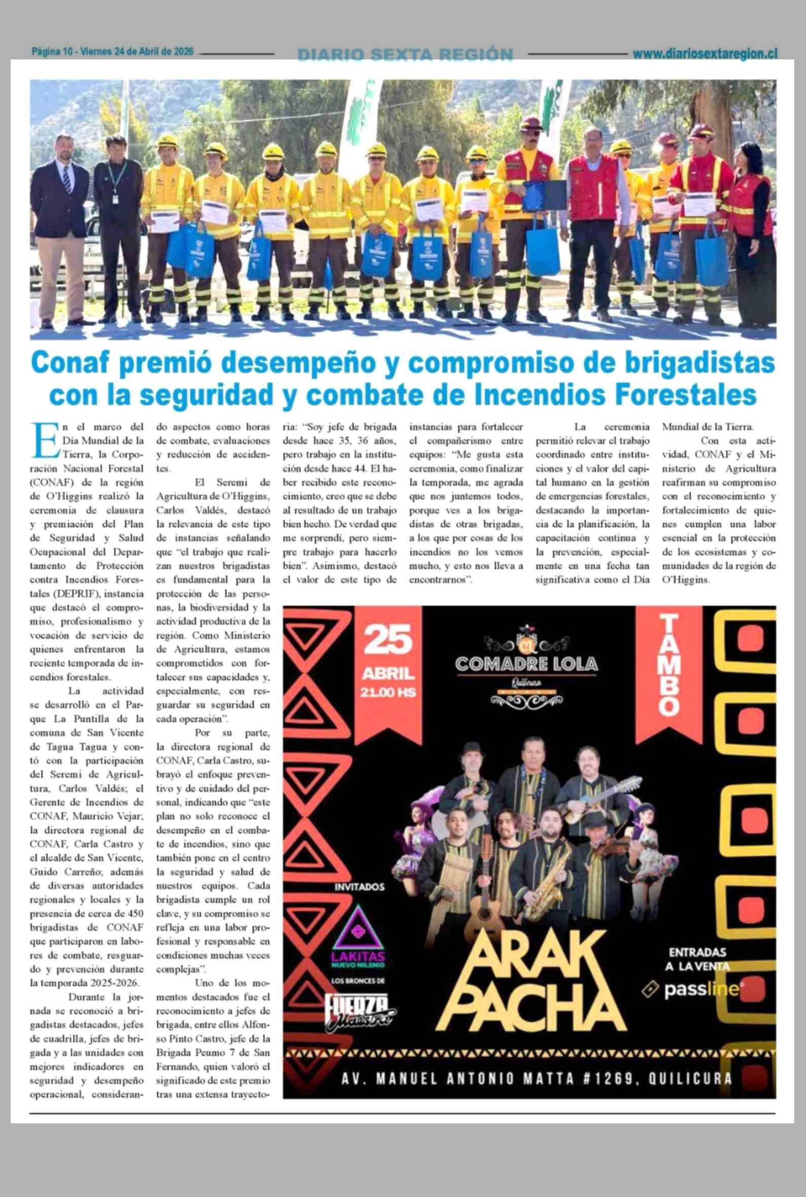 Conaf premió desempeño y compromiso de brigadistas con la seguridad y combate de Incendios Forestales 24-04-2026 Diario VI Región |