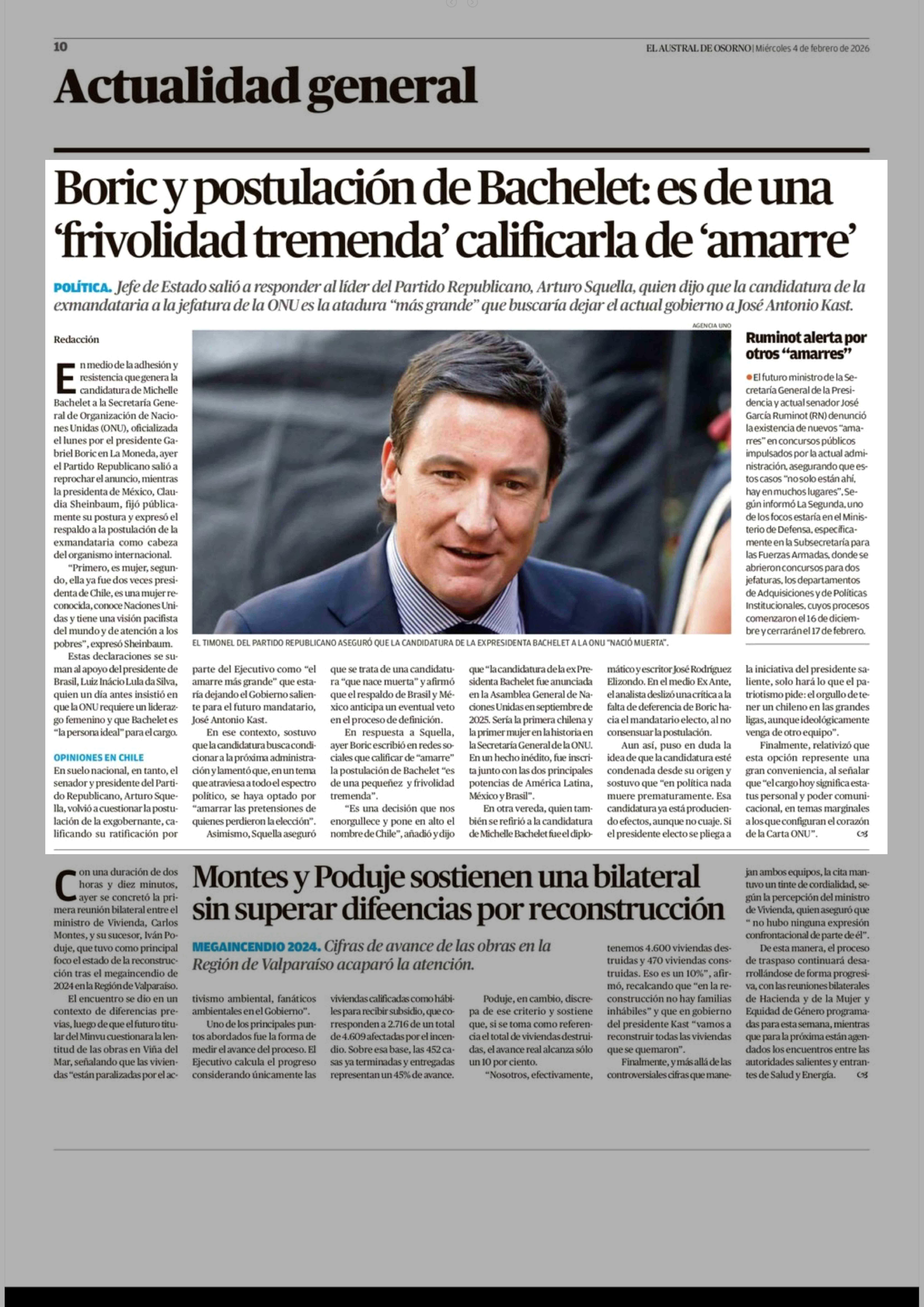 Boric y postulación de Bachelet: es de una 'frivolidad tremenda' calificarla de 'amarre' 04-02-2026 El Austral de Osorno |
