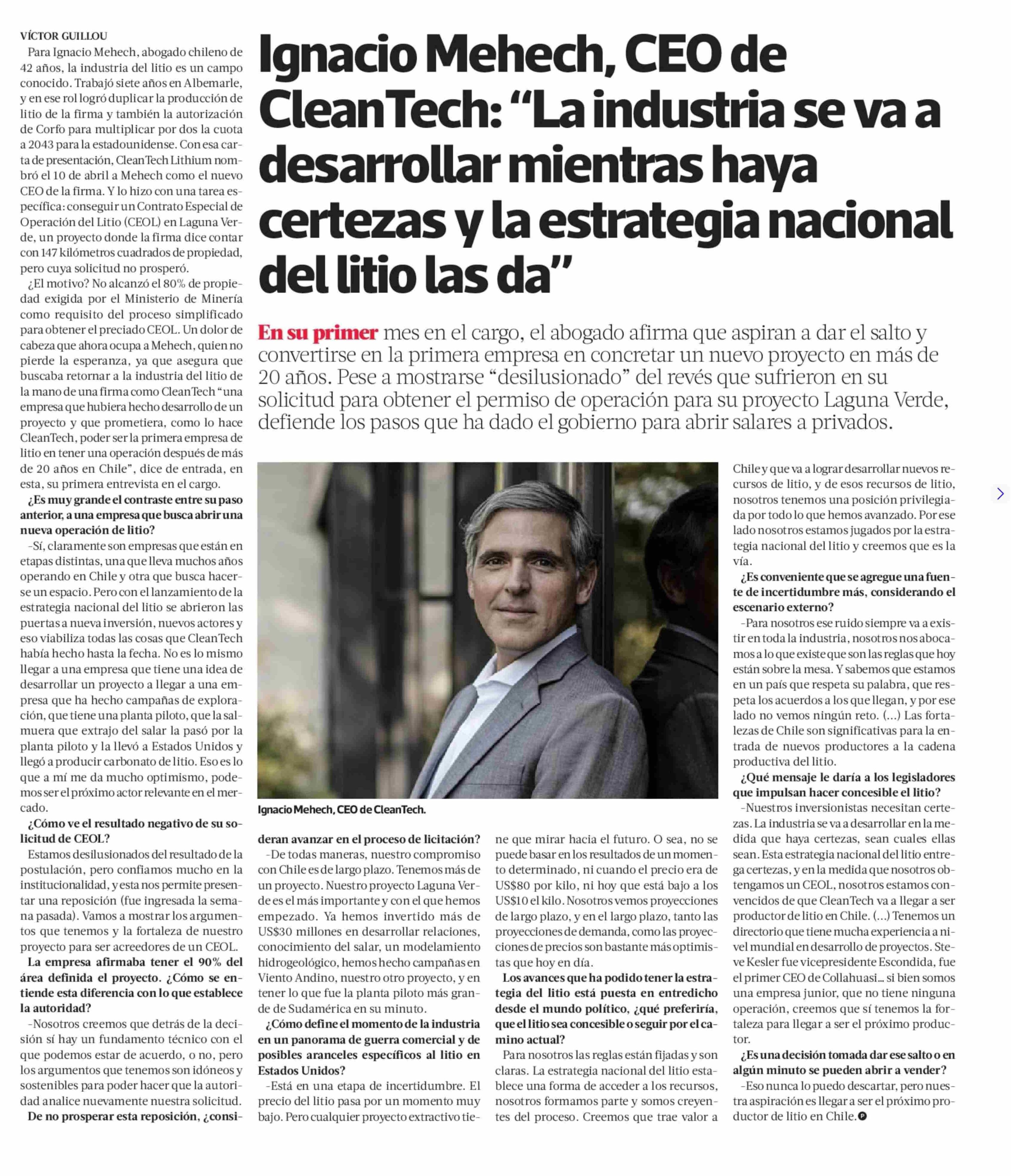 Ignacio Mehech, CEO de : CleanTech: “La industria se vaa . desarrollar mientras haya certezas y la estrategia nacional - del litio las da” 05-05-2025 La Tercera |