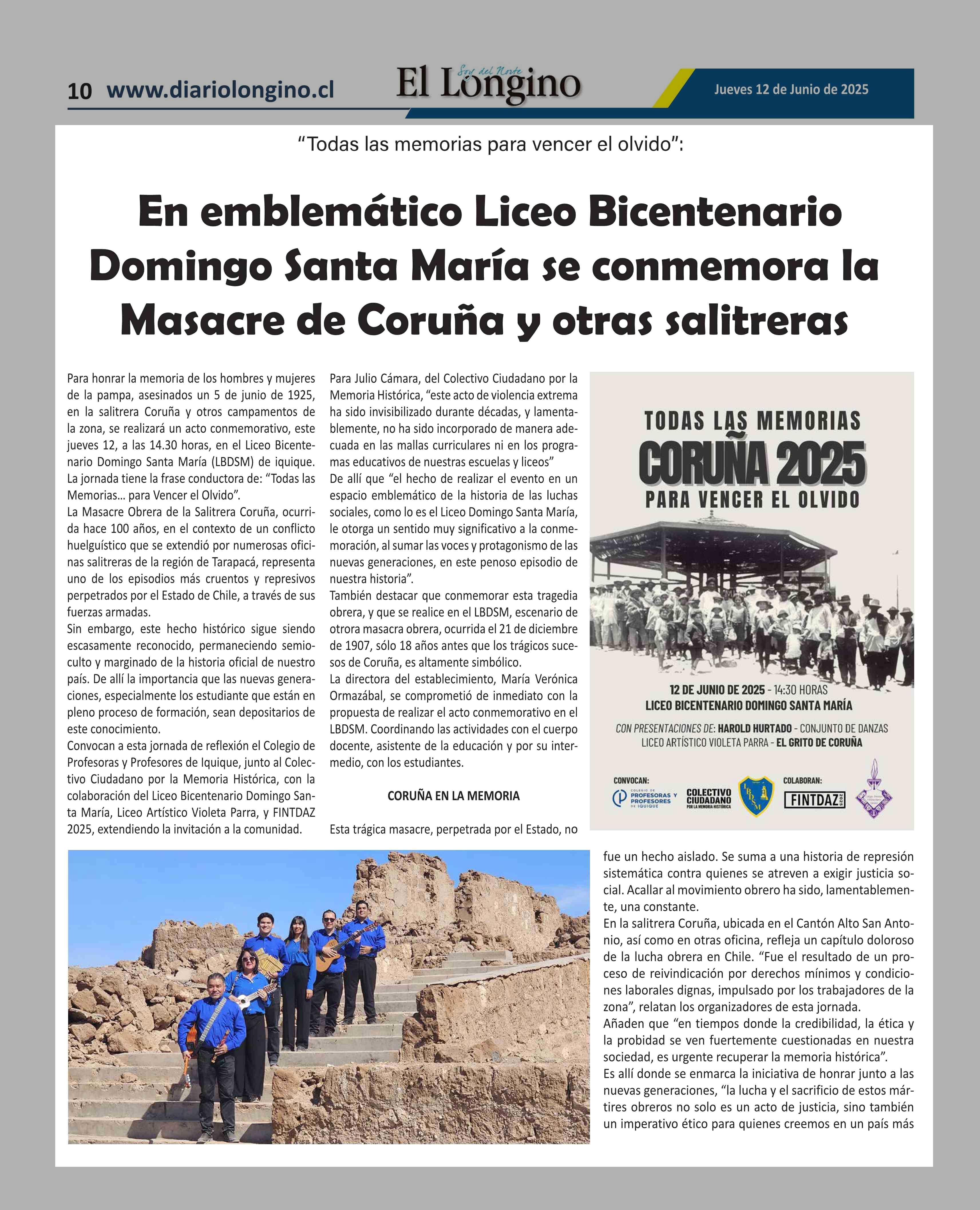 En emblemático Liceo Bicentenario Domingo Santa María se conmemora la Masacre de Coruña y otras salitreras 12-06-2025 El Longino |