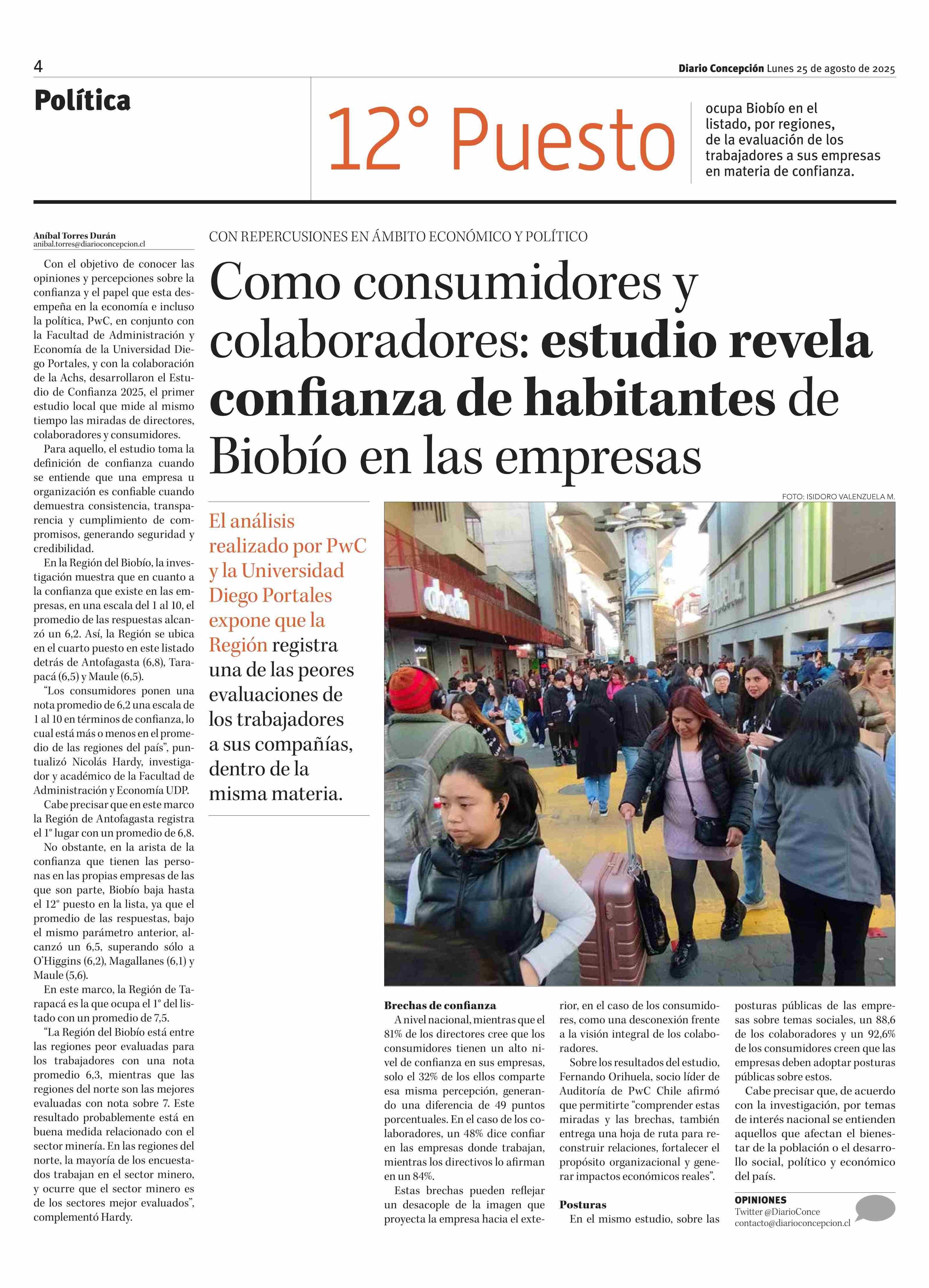 Como consumidores y colaboradores: estudio revela confianza de habitantes de Biobío en las empresas 25-08-2025 Diario Concepción |