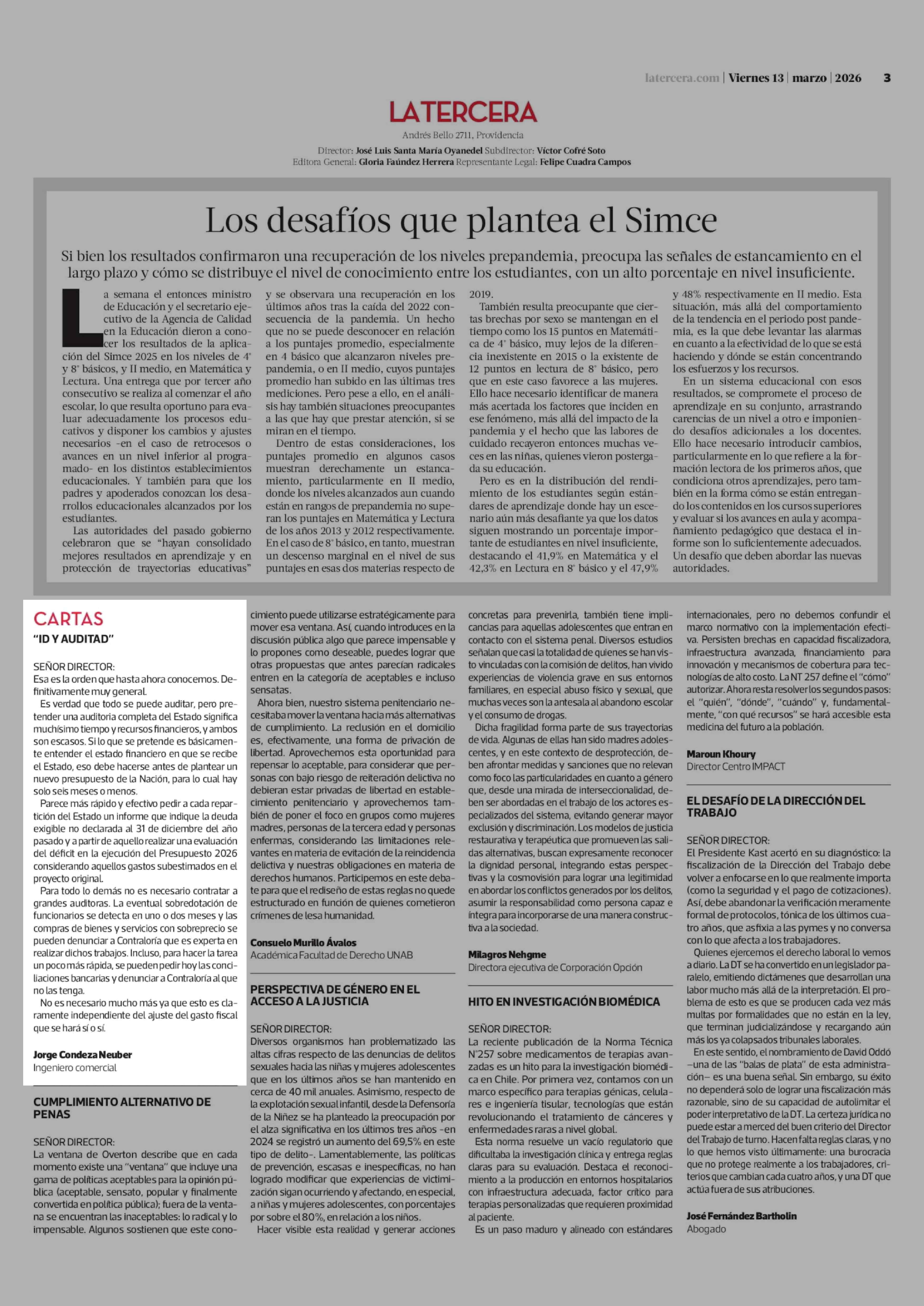 Cartas: "ID Y AUDITAD" 13-03-2026 La Tercera |
