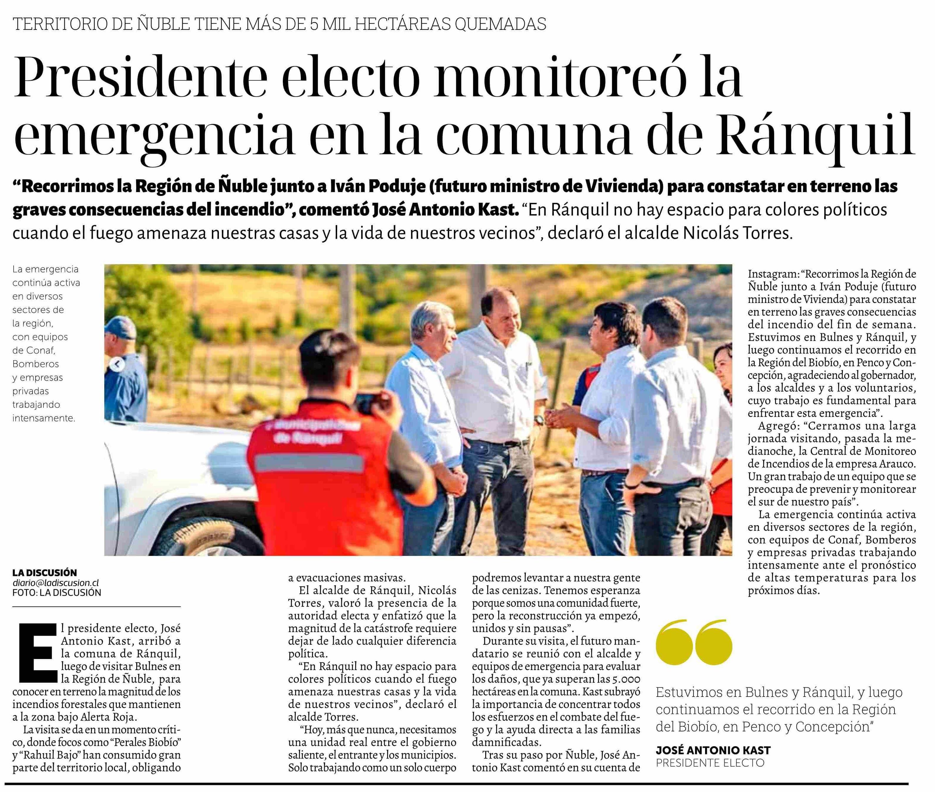 Presidente electo monitoreó la emergencia en la comuna de Ránquil 23-01-2026 La Discusión |