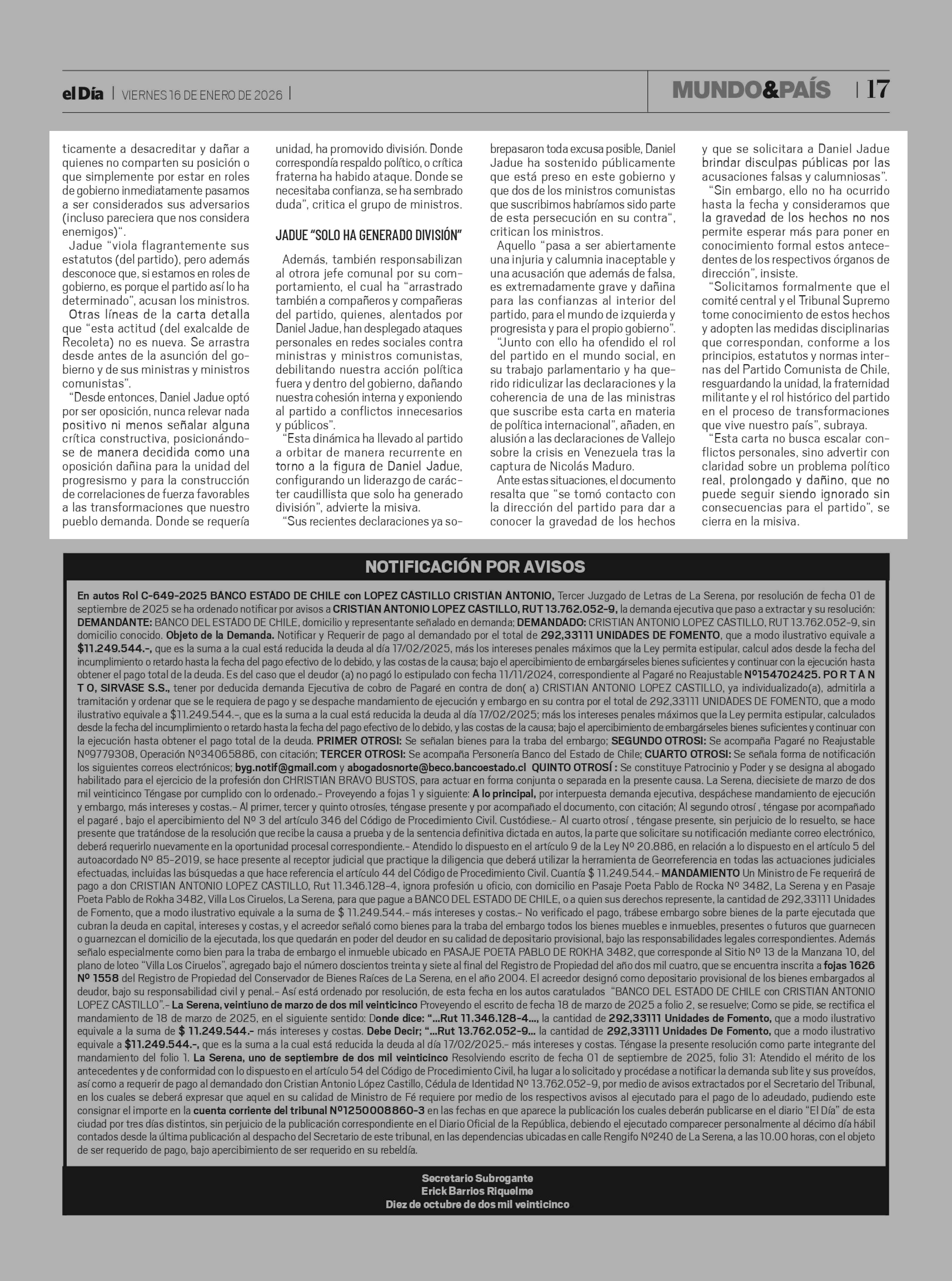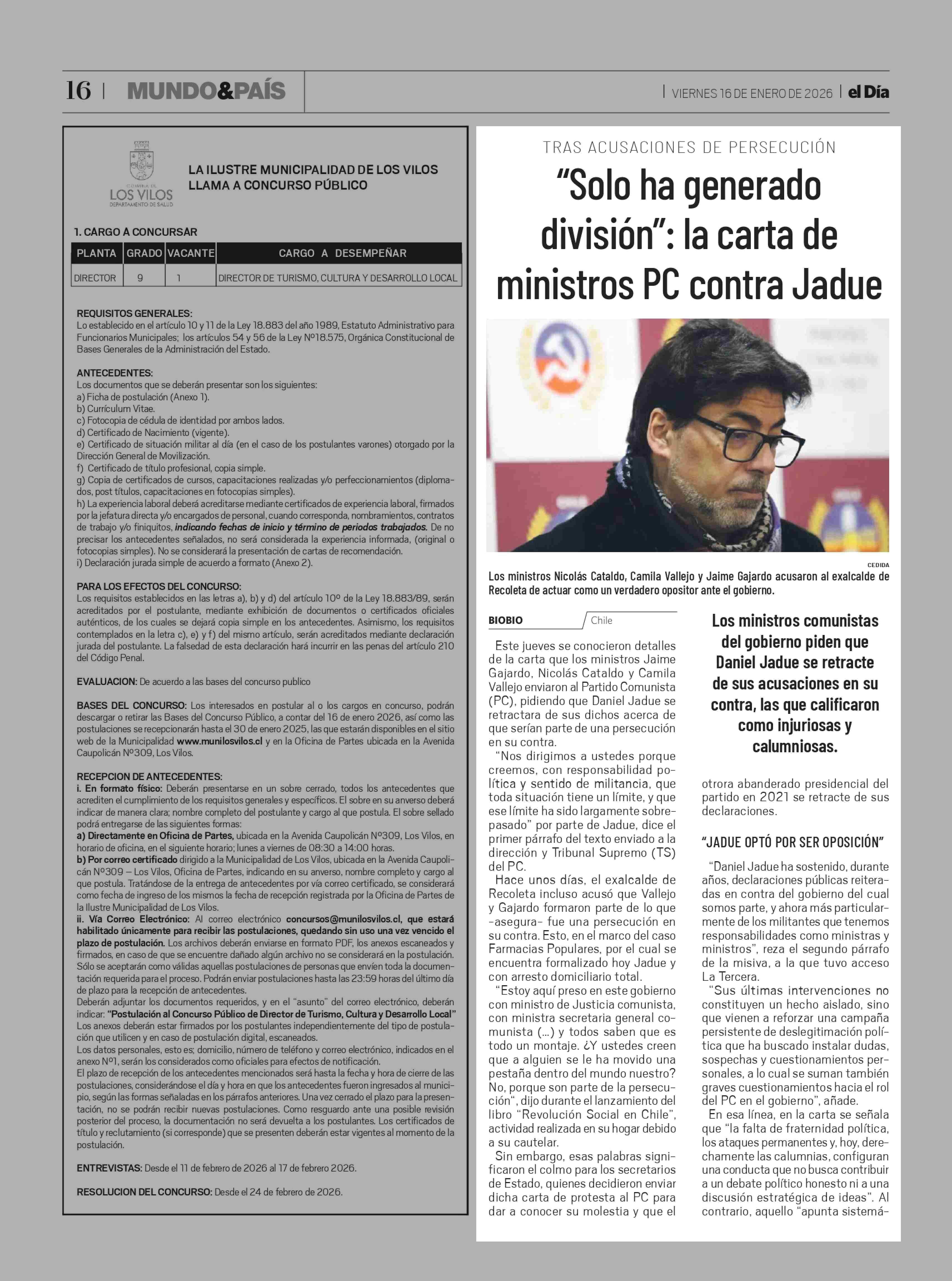 "Solo ha generado división": la carta de ministros PC contra Jadue 16-01-2026 El Día |