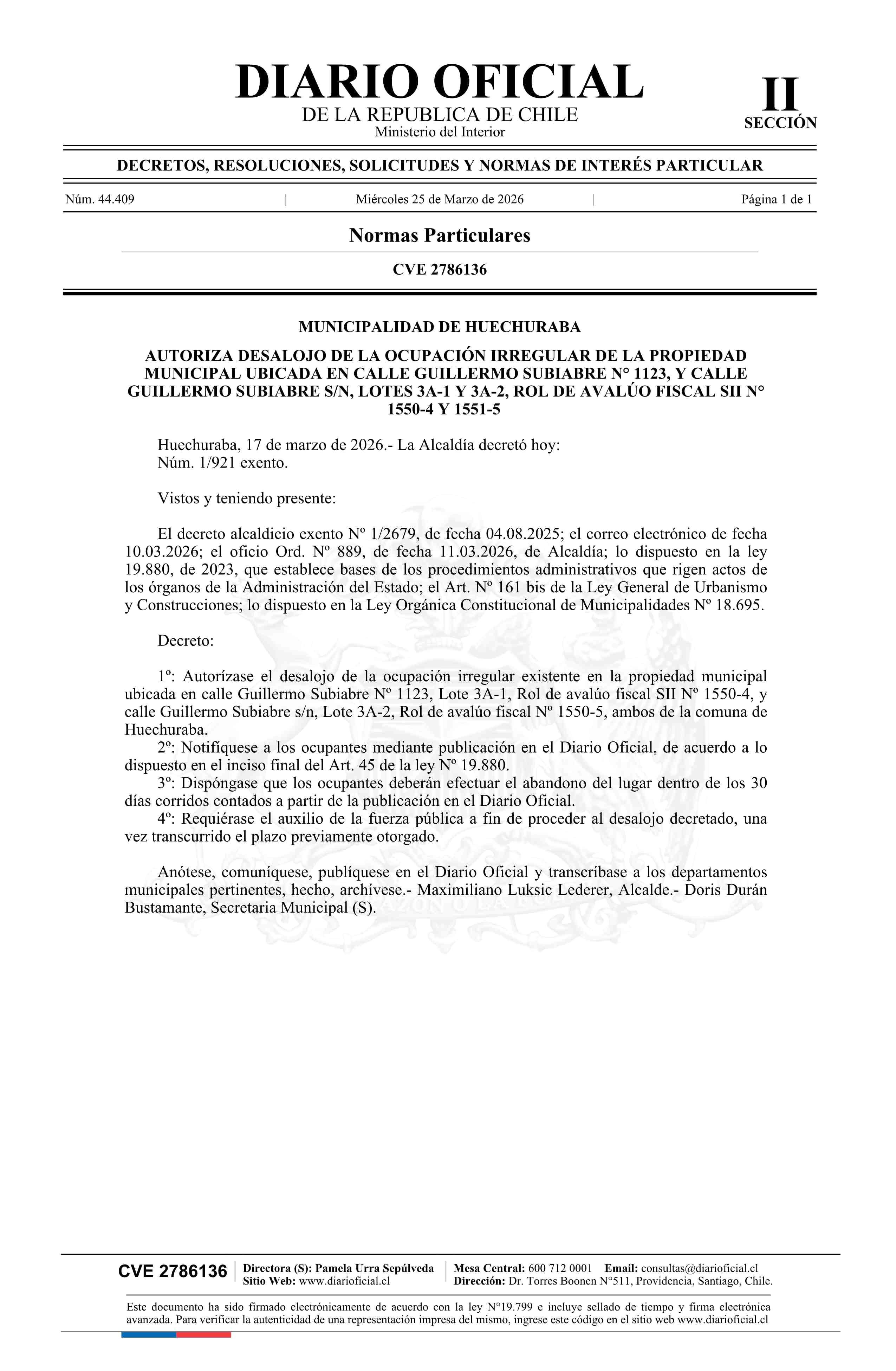 Decreto alcaldicio exento número 1/921, de 2026.- Autoriza desalojo de ocupación irregular de propiedad municipal ubicada en calle Guillermo Subiabre N° 1123, y calle Guillermo Subiabre s/n, Lotes 3A-1 y 3A-2, Rol de Avalúo Fiscal SII N° 1550-4 y 1550-5