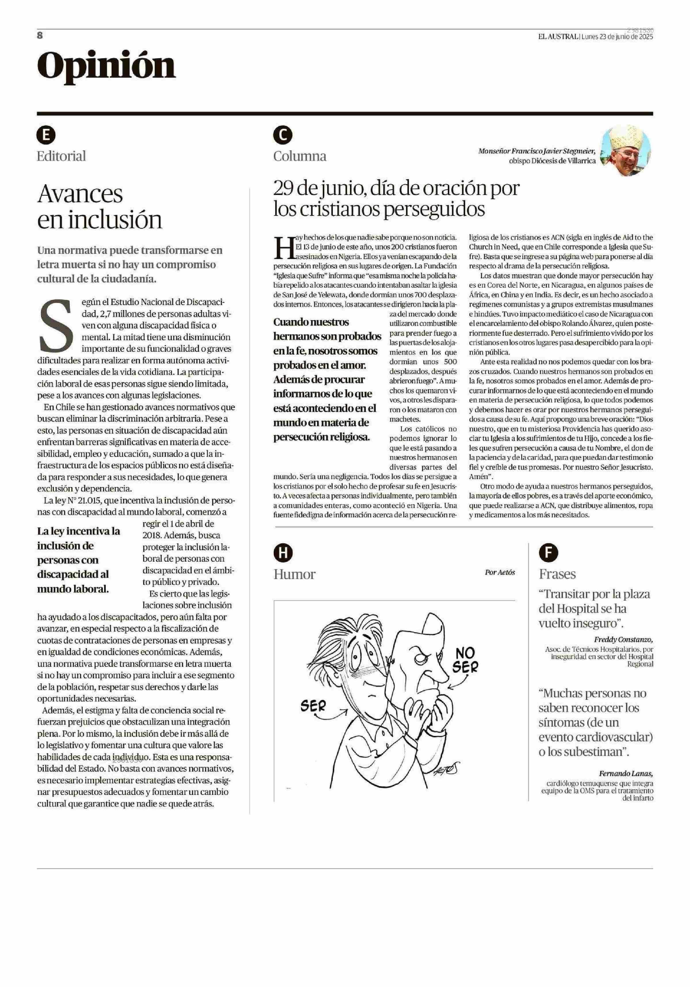 Columnas de Opinión: 29 De junio, día de oración por los cristianos perseguidos 23-06-2025 El Austral de la Araucanía |
