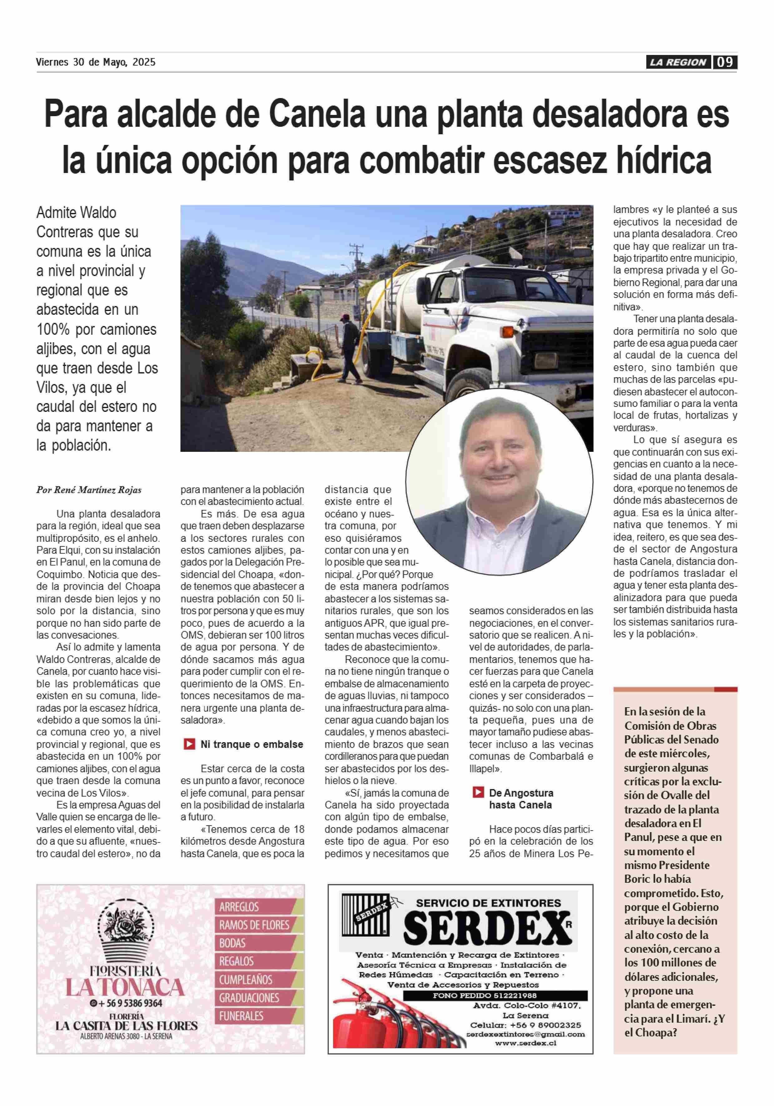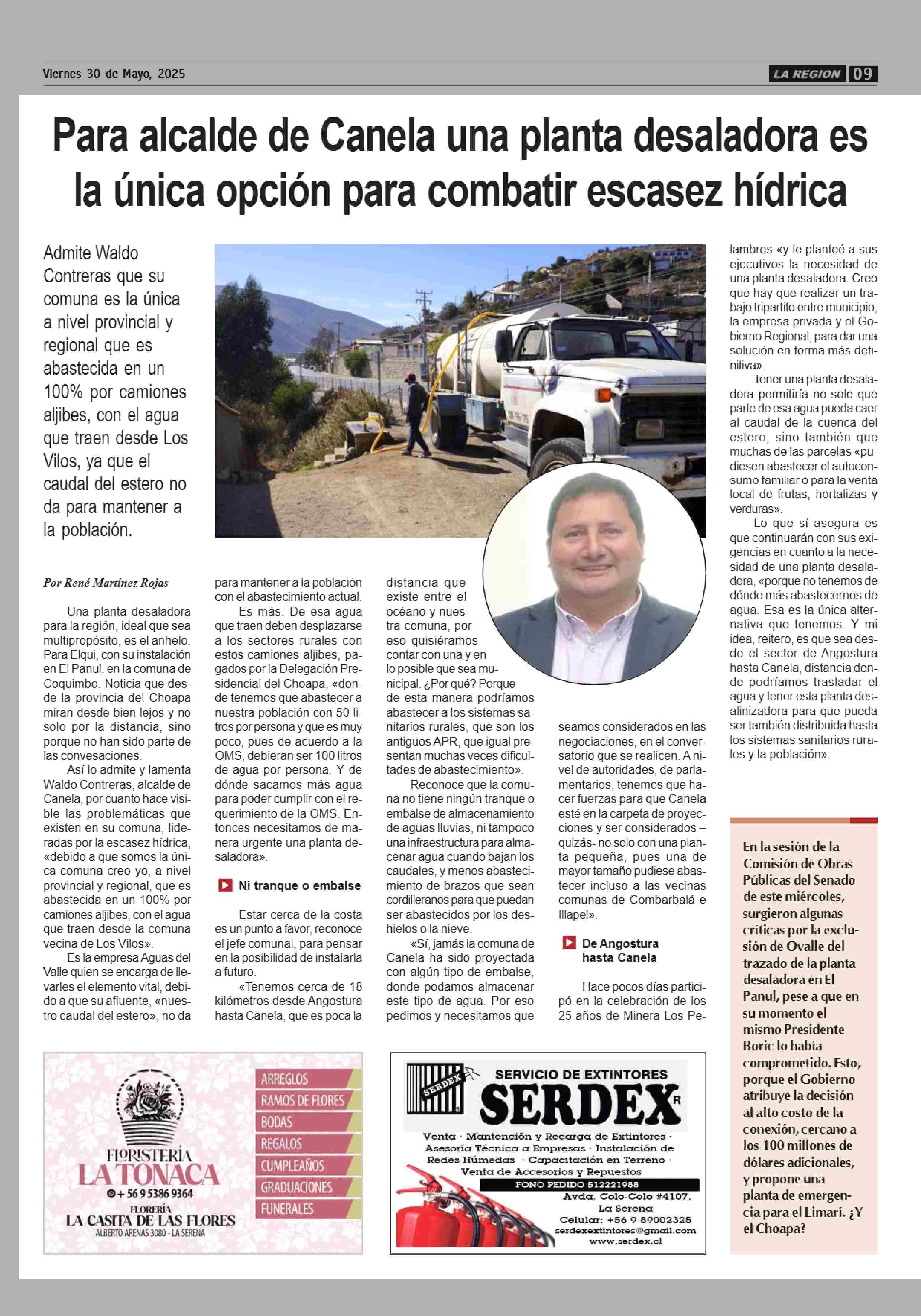 Para alcalde de Canela una planta desaladora es la única opción para combatir escasez hídrica 30-05-2025 Diario la Región |
