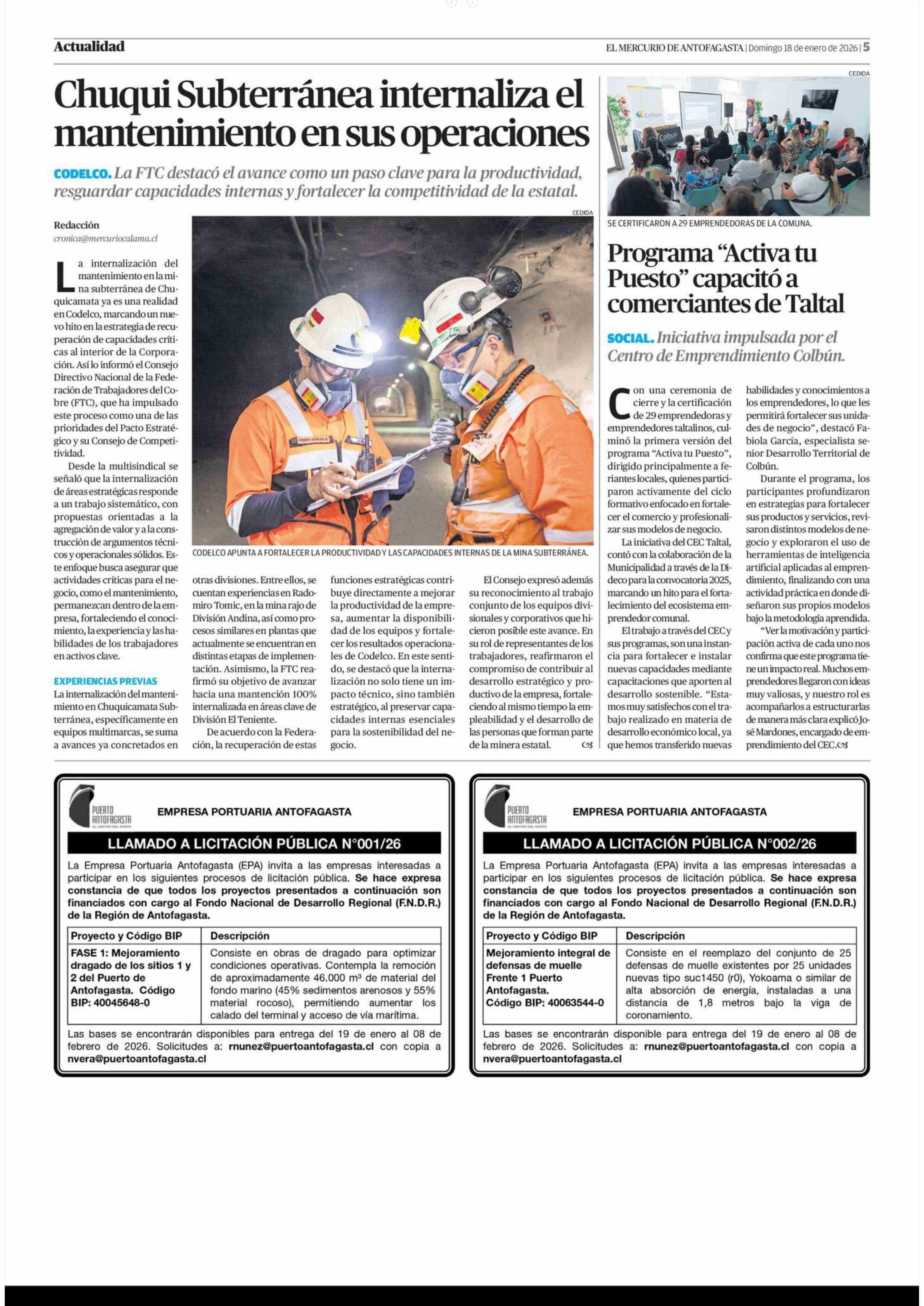 Chuqui Subterránea internaliza el mantenimiento en sus operaciones 18-01-2026 El Mercurio de Antofagasta |