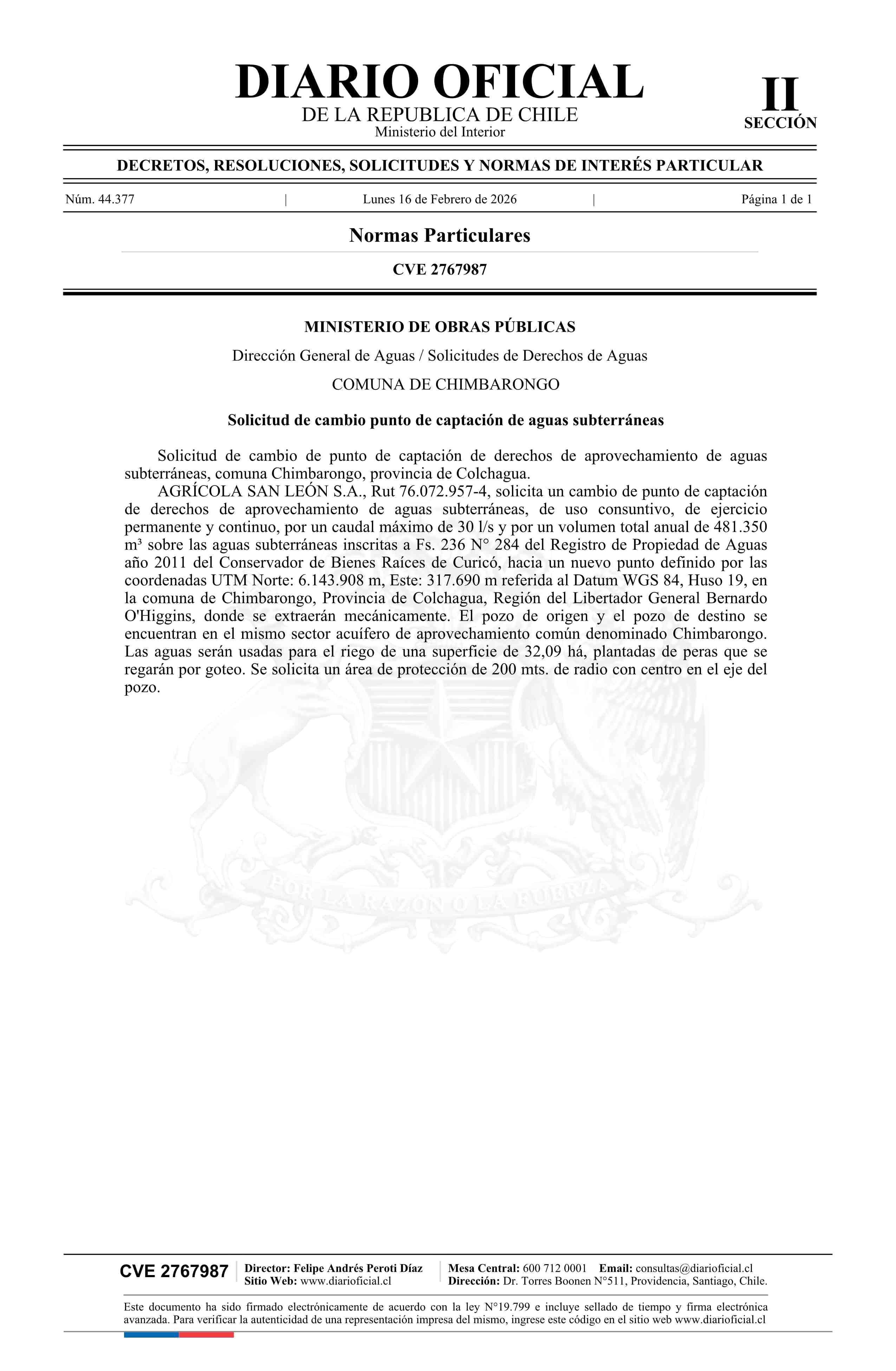 Solicitud Agrícola San León S.A. 16-02-2026 Diario Oficial Edición Electrónica |