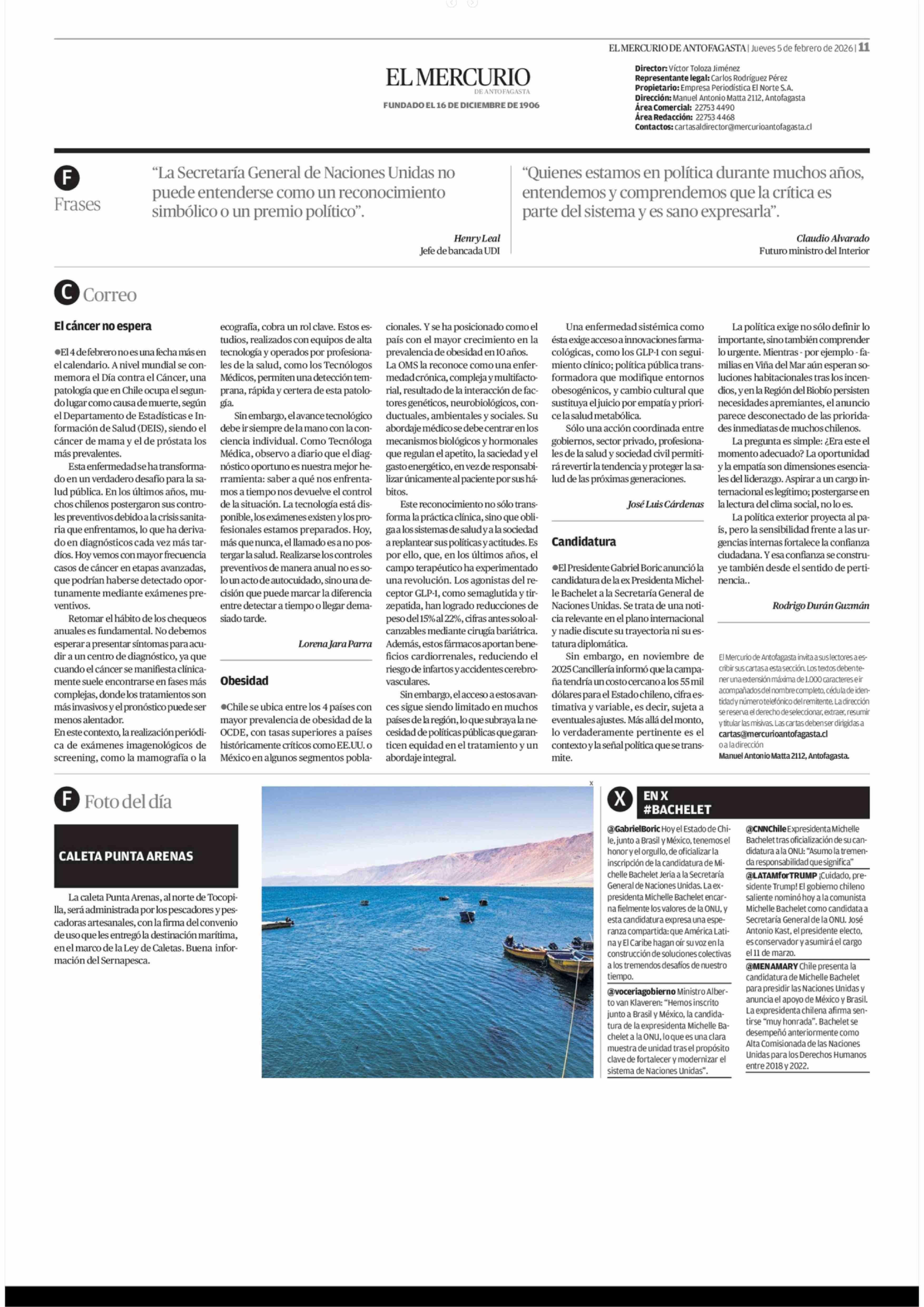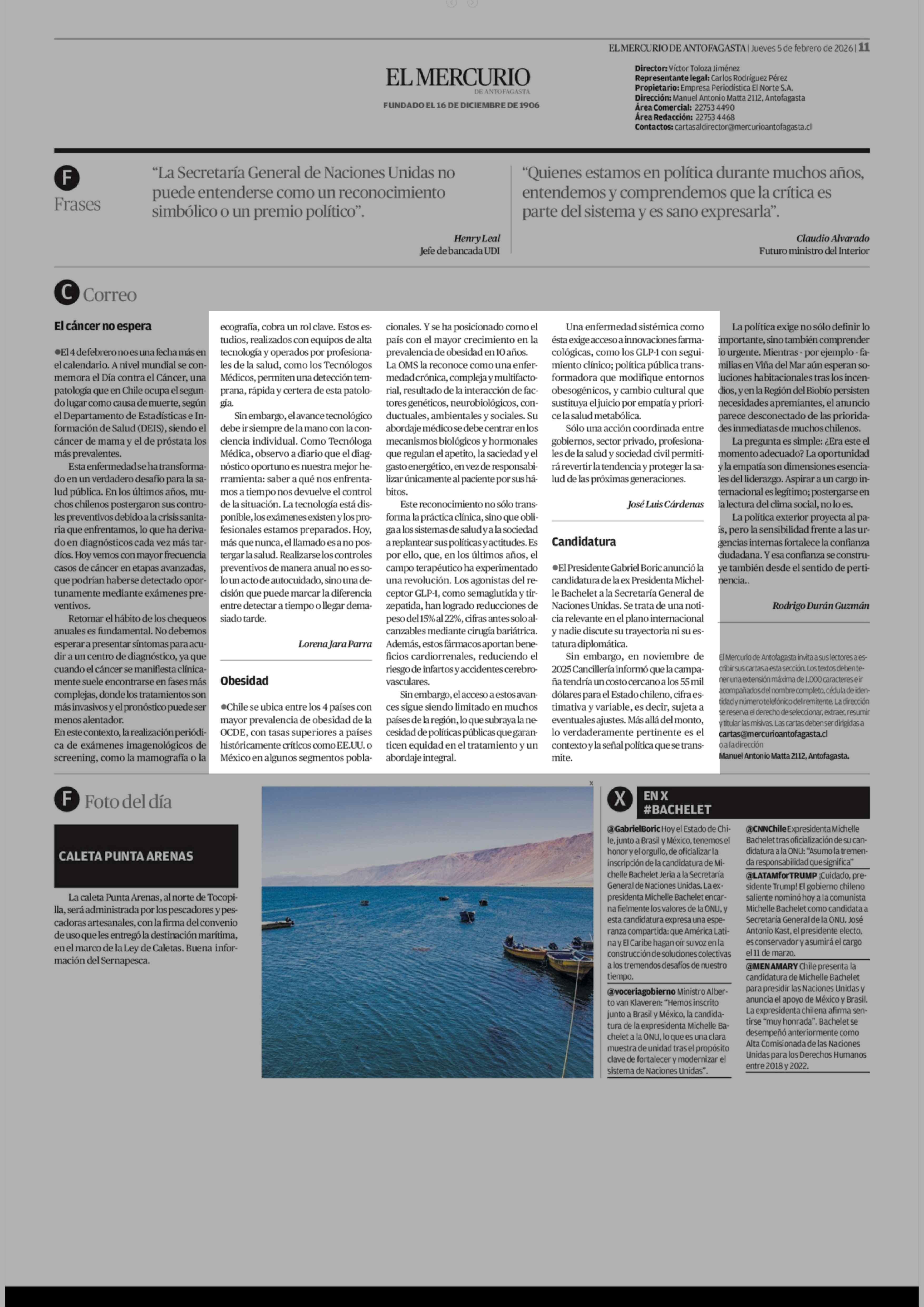 Cartas: Obesidad 05-02-2026 El Mercurio de Antofagasta |