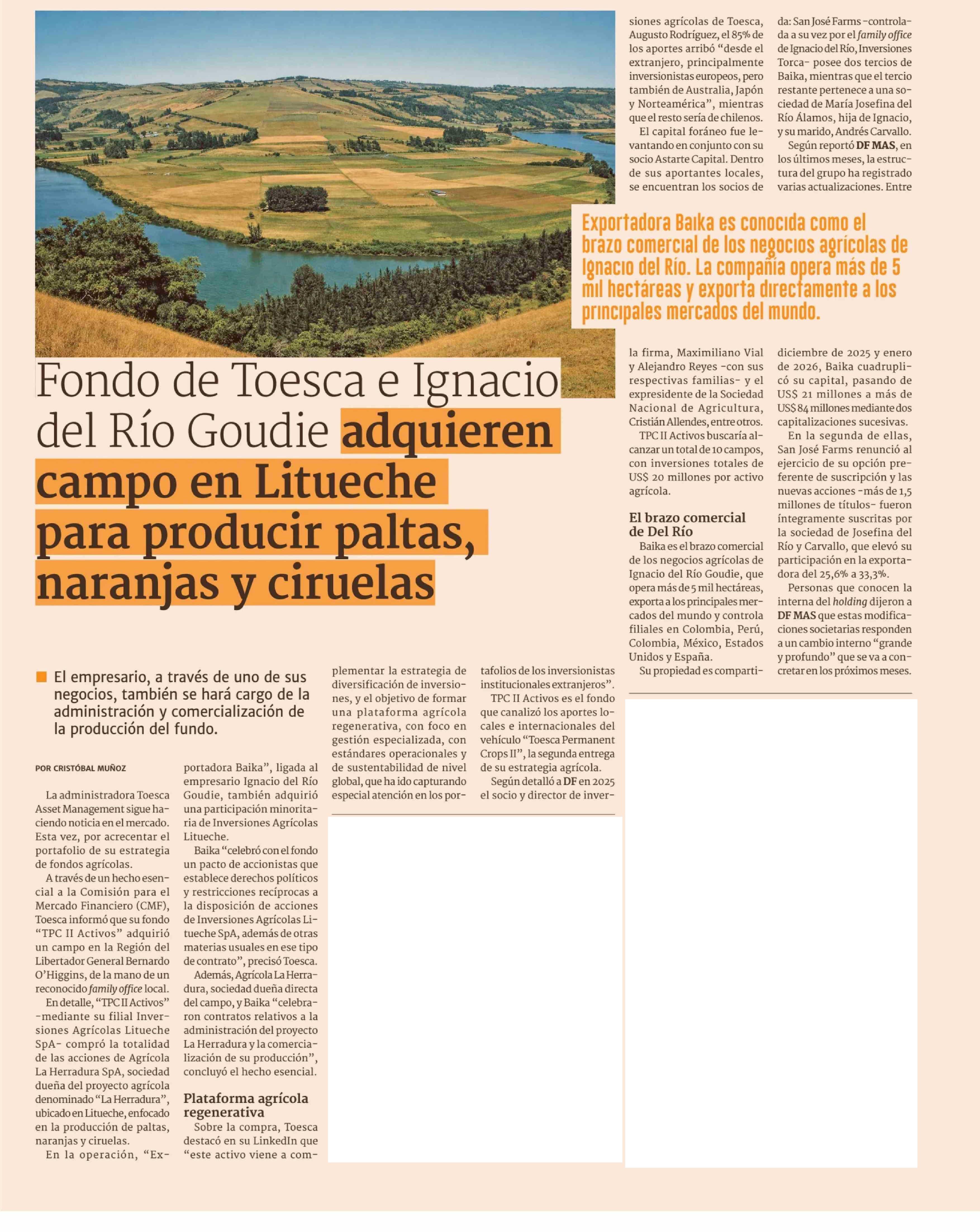 Título: Fondo de Toesca e Ignacio del Río Goudie adquieren campo en Litueche para producir paltas, naranjas y ciruelas